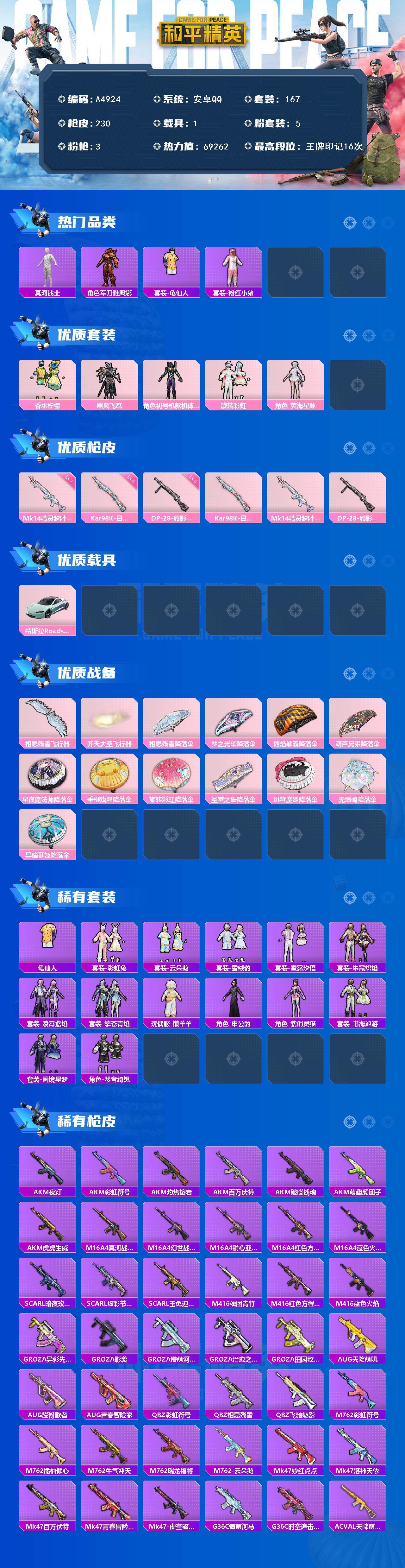 [16361356]安卓【素材号 木乃伊/角色-初号机款机体服/kar98k-巳巳如意五级/百万伏特背包】 手q-5粉装-3特效呛-1载具-2粉色飞行器-69262热力值-16王牌印记-167套装-230呛皮 【热门品类】:套装-冥河战士,角色-军刀雅典娜,套装-龟仙人,套装-粉红小猪 【粉色套装】:粉装-香水柠檬,粉装-飓风飞鹰,角色-初号机款机体服,粉装-旋转彩虹,角色-荧海星豚 【粉色呛皮等级】:kar98k-巳巳如意五级,mk14-精灵梦叶罗丽七级,dp-28-豹影疾电五级 【粉色载具】:特斯拉roadster(水滴蓝) 【粉色呛皮】:kar98k-巳巳如意,mk14-精灵梦叶罗丽,dp-28-豹影疾电 【粉色飞行器】:相思残雪飞行器,齐天大圣飞行器 【粉色降落伞】:相思残雪降落伞,梦之光华降落伞,烈焰拳霸降落伞,葫芦兄弟降落伞,星夜魔法师降落伞,垂柳戏鸭降落伞,旋转彩虹降落伞,圣堂之誓降落伞,绯穹魔姬降落伞,无垠阁降落伞,异瞳寒姬降落伞,炫彩糖果降落伞 【稀有套装】:套装-龟仙人,套装-雪国风尚,套装-彩虹兔,套装-云朵鹅,套装-雪绒豹,套装-蜜露汐语,套装-朱霞炽焰,套装-凌霄紫焰,套装-擎苍青焰,玩偶服-懒羊羊,角色-申公豹,角色-紫俏灵猫,套装-书海巡游,套装-画境星梦,套装-琴音绮想 【稀有呛皮】:akm-夜灯,akm-彩虹符号,akm-灼热熔岩,akm-百万伏特,akm-破晓战魂,akm-萌趣颜团子,akm-虎虎生威,m16a4-冥河战士,m16a4-幻世战舞者,m16a4-甜心亚梦,m16a4-红色方程式,m16a4-蓝色火焰,scar-l-暗夜玫瑰,scar-l-炫彩节奏,scar-l-玉兔迎春,m416-糯团青竹,m416-红色方程式,m416-蓝色火焰,groza-异彩先驱,groza-影袭,groza-懵萌河马,groza-治愈之星,groza-田园牧歌,aug-天降萌叽,aug-耀粉歌者,aug-青春冒险家,q-彩虹符号,q-相思残雪,q-飞驰魅影,m762-彩虹符号,m762-橘柚倾心,m762-牛气冲天,m762-瑞龙福将,m762-云朵鹅,mk47-妙红点点,mk47-洛神天依,mk47-百万伏特,mk47-青春冒险家,mk47-虚空骇客,g36c-懵萌河马,g36c-时空追击者,ac-val-天降萌叽,ac-val-