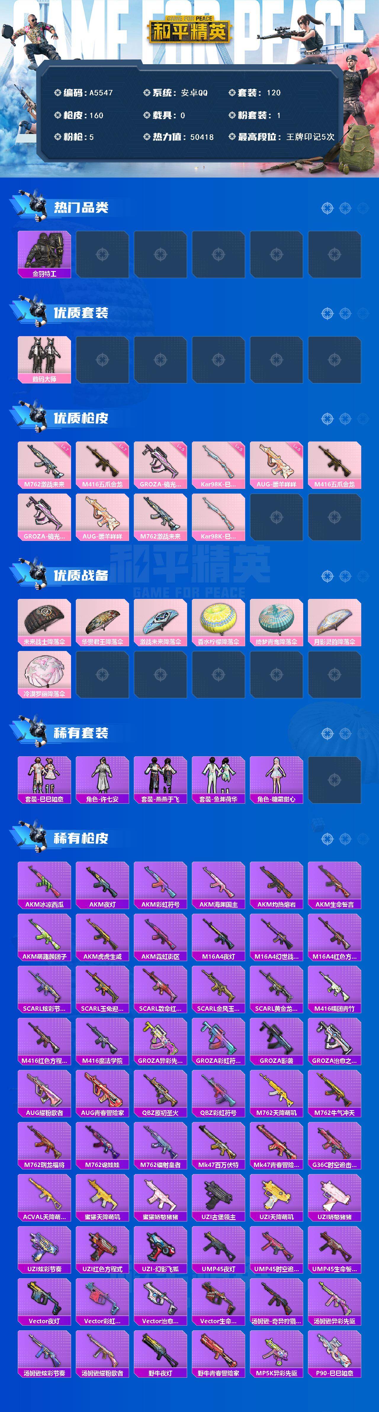 [16361600]安卓【小号 套装-金羽特工/m416-五爪金龙七级/m762-激战未来七级/百万伏特背包1级】 手q-1粉装-5特效呛-0载具-0粉色飞行器-50418热力值-5王牌印记-120套装-160呛皮 【热门品类】:套装-金羽特工 【粉色套装】:粉装-数码大师 【粉色呛皮等级】:m416-五爪金龙七级,groza-镜光银凌五级,aug-暖羊咩咩五级,m762-激战未来七级,kar98k-巳巳如意五级 【粉色呛皮】:m416-五爪金龙,groza-镜光银凌,aug-暖羊咩咩,m762-激战未来,kar98k-巳巳如意 【粉色降落伞】:未来战士降落伞,华贵君王降落伞,激战未来降落伞,香水柠檬降落伞,绮梦青鸾降落伞,月影灵韵降落伞,冷漠罗丽降落伞 【稀有套装】:套装-巳巳如意,角色-许七安,套装-燕燕于飞,套装-鱼渊荷华,角色-糖霜甜心 【稀有呛皮】:akm-冰凉西瓜,akm-夜灯,akm-彩虹符号,akm-海渊国主,akm-灼热熔岩,akm-生命誓言,akm-萌趣颜团子,akm-虎虎生威,akm-霓虹街区,m16a4-夜灯,m16a4-幻世战舞者,m16a4-红色方程式,scar-l-炫彩节奏,scar-l-玉兔迎春,scar-l-致命红樱,scar-l-金风玉露,scar-l-黄金龙骨,m416-糯团青竹,m416-红色方程式,m416-魔法学院,groza-异彩先驱,groza-彩虹符号,groza-影袭,groza-治愈之星,aug-耀粉歌者,aug-青春冒险家,q-原初圣火,q-彩虹符号,m762-天降萌叽,m762-牛气冲天,m762-瑞龙福将,m762-诡娃娃,m762-镭射皇者,mk47-百万伏特,mk47-青春冒险家,g36c-时空追击者,ac-val-天降萌叽,蜜獾-天降萌叽,蜜獾-娇憨猪猪,uzi-古堡领主,uzi-天降萌叽,uzi-娇憨猪猪,uzi-炫彩节奏,uzi-红色方程式,uzi-幻影飞狐,ump45-夜灯,ump45-时空追击者,ump45-生命誓言,vect-夜灯,vect-彩虹符号,vect-治愈之星,vect-生命誓言,汤姆逊-奇异狩猎者,汤姆逊-异彩先驱,汤姆逊-炫彩节奏,汤姆逊-耀粉歌者,野牛-夜灯,野牛-青春冒险家,mp5k-异彩先驱,p90-巳巳如意,kar98k-王子的夏天
