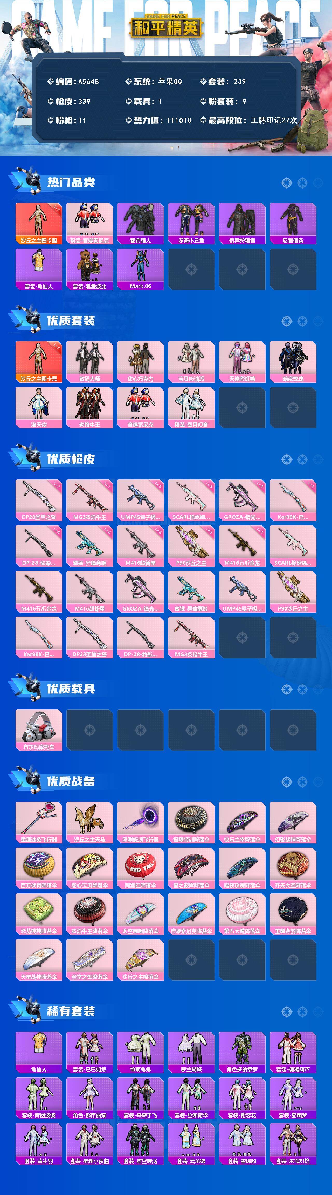 [16391456]苹果【神装号 沙丘之主-图卡盟五级/都市猎人/蓝螳螂/甜心巧克力/角色-洛天依/scar-l-锦绣绵绵五级/m416-五爪金龙一级/m416-超新星三级/百万伏特背包】 手q-1神装-9粉装-11特效呛-1载具-3粉色飞行器-111010热力值-27王牌印记-239套装-339呛皮 【红色神装等级】:沙丘之主-图卡盟五级 【红色角色神装】:沙丘之主-图卡盟 【热门品类】:粉装-音爆索尼克,套装-都市猎人,套装-深海小丑鱼,套装-奇异狩猎者,套装-忍者信条,套装-龟仙人,套装-浪漫波比,角色-mark.06 【粉色套装】:粉装-数码大师,粉装-甜心巧克力,粉装-宝贝奶油派,粉装-天使彩虹糖,粉装-暗夜玫瑰,角色-洛天依,粉装-炙焰牛王,粉装-音爆索尼克,粉装-雪月幻音 【粉色呛皮等级】:scar-l-锦绣绵绵五级,m416-五爪金龙一级,m416-超新星三级,groza-镜光银凌五级,蜜獾-异瞳寒姬五级,ump45-量子极限五级,p90-沙丘之主三级,kar98k-巳巳如意五级,dp-28-圣堂之誓七级,dp-28-豹影疾电五级,mg3-炙焰牛王七级 【粉色载具】:布尔玛摩托车 【粉色呛皮】:scar-l-锦绣绵绵,m416-五爪金龙,m416-超新星,groza-镜光银凌,蜜獾-异瞳寒姬,ump45-量子极限,p90-沙丘之主,kar98k-巳巳如意,dp-28-圣堂之誓,dp-28-豹影疾电,mg3-炙焰牛王 【粉色飞行器】:童趣迷兔飞行器,沙丘之主天马,深渊漩涡飞行器 【粉色降落伞】:极限特训降落伞,快乐主宰降落伞,幻影战神降落伞,百万伏特降落伞,甜心宝贝降落伞,阿狸红降落伞,星之彼岸降落伞,暗夜玫瑰降落伞,齐天大圣降落伞,恐龙拽拽降落伞,炙焰牛王降落伞,太空嘟嘟降落伞,音爆索尼克降落伞,第五大道降落伞,玉鳞金羽降落伞,天星战神降落伞,圣堂之誓降落伞,沙丘之主降落伞,炫彩糖果降落伞 【稀有套装】:套装-龟仙人,套装-巳巳如意,套装-雏菊兔兔,套装-萝兰蝴蝶,角色-多纳泰罗,套装-糖糖葫芦,套装-青团波波,角色-都市丽猫,套装-燕燕于飞,套装-鱼渊荷华,套装-粉恋花,套装-紫幽梦,套装-蓝冰羽,套装-星渊小夜曲,套装-虚空漩涡,套装-云朵鹅,套装-雪绒豹,套装-朱霞炽焰,套装-凌霄紫焰,套装-画境星
