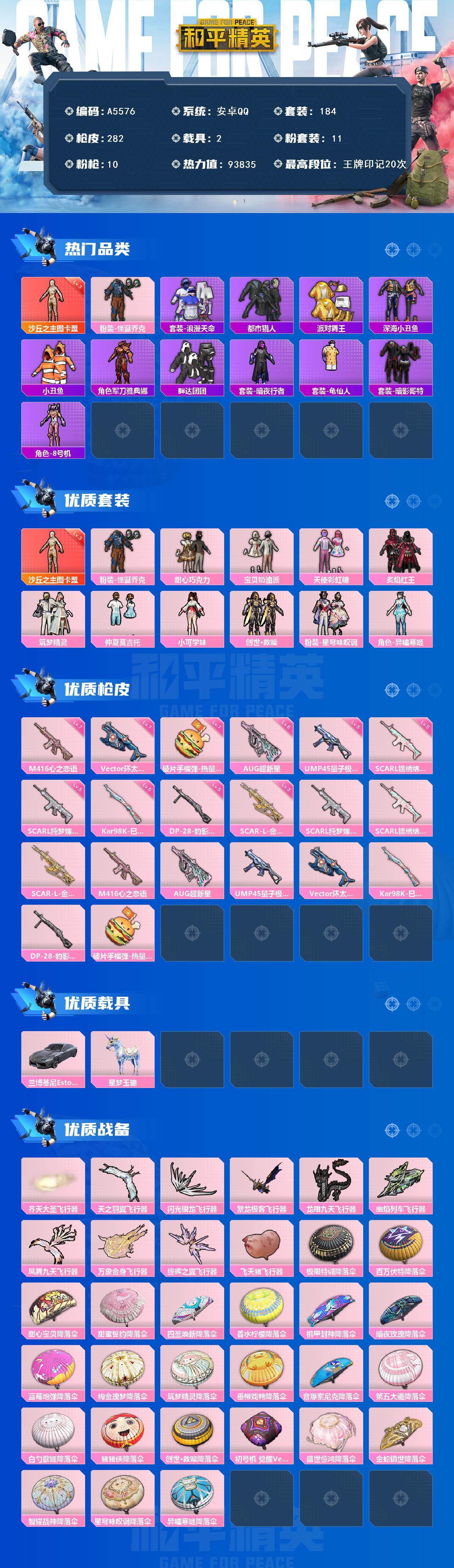 [16407705]安卓 【极品神装号 沙丘之主-图卡盟三级/怪诞乔克/浪漫天命/都市猎人/派对舞王/深海小丑鱼/暗影哥特/8号机/甜心巧克力/m416-心之恋语七级/兰博基尼estoque(银翼灰)】手q-1神装-11粉装-10特效呛-2载具-11粉色飞行器-93835热力值-20王牌印记-184套装-282呛皮 【红色神装等级】:沙丘之主-图卡盟三级 【红色角色神装】:沙丘之主-图卡盟 【热门品类】:粉装-怪诞乔克,套装-浪漫天命,套装-都市猎人,套装-派对舞王,套装-深海小丑鱼,套装-小丑鱼,角色-军刀雅典娜,套装-胖达团团,套装-暗夜行者,套装-龟仙人,套装-暗影哥特,角色-8号机 【粉色套装】:粉装-怪诞乔克,粉装-甜心巧克力,粉装-宝贝奶油派,粉装-天使彩虹糖,粉装-炙焰红王,粉装-筑梦精灵,粉装-仲夏莫吉托,角色-小可学妹,套装-创世·救赎,粉装-星穹咏叹调,角色-异瞳寒姬 【粉色呛皮等级】:scar-l-纯梦嫁纱五级,scar-l-锦绣绵绵五级,scar-l-金蛇镇世三级,m416-心之恋语七级,aug-超新星六级,ump45-量子极限五级,vect-环太平洋七级,kar98k-巳巳如意五级,dp-28-豹影疾电五级,破片手留单-热量炸弹七级 【粉色载具】:兰博基尼estoque(银翼灰),星梦玉骢 【粉色呛皮】:scar-l-纯梦嫁纱,scar-l-锦绣绵绵,scar-l-金蛇镇世,m416-心之恋语,aug-超新星,ump45-量子极限,vect-环太平洋,kar98k-巳巳如意,dp-28-豹影疾电,破片手留单-热量炸弹 【粉色飞行器】:齐天大圣飞行器,天之羽翼飞行器,闪光银龙飞行器,繁龙极客飞行器,龙翔九天飞行器,幽焰列车飞行器,凤舞九天飞行器,万象金身飞行器,终晖之翼飞行器,飞天猪飞行器 【粉色降落伞】:极限特训降落伞,百万伏特降落伞,甜心宝贝降落伞,甜蜜誓约降落伞,四圣焕新降落伞,香水柠檬降落伞,机甲封神降落伞,暗夜玫瑰降落伞,蓝莓炮弹降落伞,绚金瑰梦降落伞,筑梦精灵降落伞,垂柳戏鸭降落伞,音爆索尼克降落伞,第五大道降落伞,白勺歌姬降落伞,猪猪侠降落伞,创世·救赎降落伞,初号机 觉醒ver.降落伞,盛世惊鸿降落伞,金蛇镇世降落伞,智耀战神降落伞,星穹咏叹调降落伞,异瞳寒姬降落伞,炫彩糖果降落伞 【