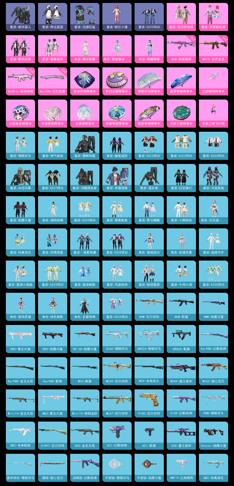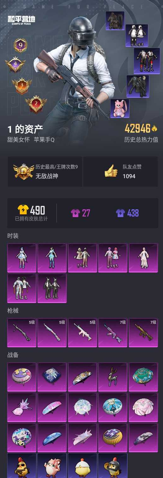 【和平精英】【lyhp21485】7粉装,5特效呛,0载具,历史最高段位:无敌战神 王牌印记9次 热力值:42946,100套装,121呛械,172装备,83战备;套装:套装-数码大师,套装-宝贝奶油派,套装-天使彩虹糖,套装-智能音符,角色-烟云彩露,角色-异瞳寒姬,角色-奇迹舞步 美琪,套装-黄色运动,套装-蓝色运动,套装-白色伏地魔,套装-黑色伏地魔,套装-竞技名士,套装-猛禽,套装-长空猛禽,套装-漫步者,套装-都市猎人,套装-浪漫假日,套装-特殊使命,套装-甜蜜告白,套装-鹰眼刺客,套装-冰冻风暴,套装-冷酷挑战者,套装-街头潮人,套装-蓝彩潮人,套装-魅力单车,套装-坚韧舞者,套装-野性战心,套装-热血青春,套装-弄潮海豚,套装-迅捷狂鲨,套装-缤纷果语,套装-龙魂突击队,套装-元素星魂,套装-胖达圆圆,套装-冷血极客,套装-粉红小猪,套装-破蛋小黄鸡,套装-萌黄之夏,套装-nv战队服,套装-白糯汤圆,套装-战术大师,套装-热情海星,套装-纯真浪花,套装-st追光队服,套装-ss22特训,套装-绯格组合,套装-ss23特训,套装-神气柴柴,套装-懵萌河马,套装-王牌教练,套装-柠萌假日,套装-青玉碎影,套装-ss24特训,套装-龟仙人,套装-ss25特训,套装-冰河战士,套装-空岛之星,套装-焰鹰斗篷,套装-幽夜迷踪,套装-幻羽潜行,套装-ss27特训,套装-老实芭蕉,套装-ss28特训,角色-湖雨初晴,套装暗影刺翼,套装-海盐绵绵冰,套装-蝶变,套装-小熊娃娃,套装-ss29特训,套装-雏菊兔兔,角色-狂花道·娜可露露,套装-萝兰蝴蝶,角色-绯色魅影,角色-紫俏灵猫,套装-异域银装,角色-蜜桃派对,套装-绒宝小鹅,套装-ss31特训,套装-晶辉守护,套装-ss33特训,套装-ss32特训,角色-琉璃花蕾,套装-青翼流星,套装-顶瓜瓜,套装-狂鲨锋刃,套装-星渊小夜曲,套装-炫彩糖果,套装-蓝海鲸歌,套装-ss34特训,套装-薄荷星砂,套装-ss35特训,套装-午间小调,套装-秘语星愿,套装-风迹短诗,套装-粉黛兰香,角色-玄霖雨神,套装-ss37特训,套装-ss36特训,套装-雪国风尚,套装-萌鸡速递;呛皮:蜜獾-天降萌叽,蜜獾-风迹短诗,蜜獾-乌木金纹,aug-天降萌叽,aug-异域银装,aug-冰晶雪宝,m16a4-幻世战舞者,m16a4-冰河战士,7级akm-炫紫旋律,akm-影袭,akm-百万伏特,akm-彩虹符号,akm-霓彩脉冲,7级m416-五爪金龙,m416-糯团青竹,m416-极冰使者,m762-甜心宝贝,m762-天降萌叽,m762-雏菊兔兔,q-未来歌姬,q-纯真浪花,g36c-懵萌河马,famas-乌木金纹,ace32-冰晶雪宝,groza-影袭,groza-懵萌河马,mk47-百万伏特,mk47-风迹短诗,ac-val-乌木金纹,ac-val-天降萌叽,5级scar-l-锦绣绵绵,scar-l-海盐豹豹,m24-影袭,m24-未来战士,5级kar98k-巳巳如意,kar98k-影袭,kar98k-金玉无双,kar98k-幻影战神,kar98k-彩虹符号,莫辛纳甘-乌木金纹,莫辛纳甘-懵萌河马,莫辛纳甘-风迹短诗,awm-焰鹰斗篷,awm-纯真浪花,win94-乌木金纹,m200-乌木金纹,mini14-金玉无双,mini14-穿刺龙虾,mini14-涂山之恋,mini14-雏菊兔兔,vss-星之彼岸,vss-彩虹符号,mk14-冰河战士,mk20-h-星梦奇缘,mk20-h-狂鲨锋刃,mk20-h-乌木金纹,m417-玩趣呆呆,slr-霓彩脉冲,slr-乌木金纹,mk12-风迹短诗,mk12-乌木金纹,sks-金玉无双,野牛-雏菊兔兔,汤姆逊-幻影战神,汤姆逊-炫彩节奏,汤姆逊-天降萌叽,汤姆逊-纯真浪花,ump45-绒宝小鹅,aks-74u-乌木金纹,uzi-影袭,uzi-幻影战神,uzi-天降萌叽,uzi-冰河战士,uzi-啾咪啾咪,uzi-炫彩糖果,mp5k-乌木金纹,p90-玩趣呆呆,p90-乌木金纹,vect-焰鹰斗篷,vect-突变脉冲,dbs-第五大道,dbs-彩虹符号,dbs-焰鹰斗篷,dbs-风迹短诗,dbs-乌木金纹,s12k-幻影战神,s12k-霓彩脉冲,spas-12-狂鲨锋刃,aa12-g-纯真浪花,s1897-百万伏特,s686-生命誓言,mg3-幻世战舞者,mg3-乌木金纹,mg3-第五大道,pkm-懵萌河马,pkm-啾咪啾咪,m249-百万伏特,m249-星之彼岸,m249-糯团青竹,m249-冰晶雪宝,5级dp-28-豹影疾电,dp-28-焰鹰斗篷,mg-36-薄荷星砂,r45-幻彩电音,信号呛-异瞳寒姬,tmp-9-江南烟雨,r1895-雏菊兔兔,p18c-百万伏特,平底锅-懵萌河马,平底锅-焰鹰斗篷,平底锅-纯真浪花,平底锅-雏菊兔兔,平底锅-无垠阁,撬棍-甜心宝贝,撬棍-冰晶雪宝,盐雾蛋-冰氧夏日,十子怒-异瞳寒姬,十子怒-异域银装,破片手留单-拽到爆炸,破片手留单-爆破雪人,铝热弹-炫彩糖果;降落伞:炫彩糖果飞行器,天象三御飞行器,异域银装飞行器,狂鲨锋刃飞行器,破刃行动尾迹,登顶巅峰飞行器; 详情看图无敌战神框 地铁满天赋 7粉5特效呛 都市猎人 智能音符 奇迹舞步 追光服 冷酷者 多呛型 满级m4金龙 满级akm炫紫 粉熊背包