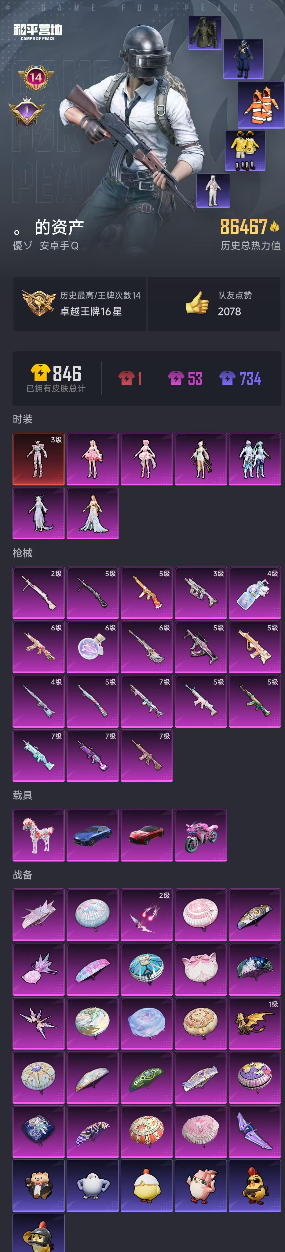【和平精英】【lyhp21487】6粉装,18特效呛,4载具,历史最高段位:卓越王牌16星 王牌印记14次 热力值:86467,153套装,248呛械,279装备,135战备;套装:最终圣卫者-帕修斯,角色-绝色倾城,角色-樱桃泡泡,角色-智耀战神,套装-幻彩电音,角色-幻海仙踪,角色-奇迹舞步 美雪,套装-骑行爱好者,套装-竞技名士,套装-长空猛禽,套装-竞技勇士朋克,套装-黎明保卫者,套装-蓝色守护者,套装-六六大吉,套装-冷焰舞者,套装-甜蜜告白,套装-春日漫步,套装-幻影武者,套装-绮丽涂鸦,套装-雪山征服者,套装-坚韧舞者,套装-夜莺强袭者,套装-野性战魂,套装-丛林猎人,套装-雪山精英,套装-传奇侦探,套装-幻世战舞者,套装-弄潮海豚,套装-甜蜜熊情侣,套装-龙魂突击队,套装-特种空勤,套装-格斗先锋,套装-麻辣教官,套装-ss3特训,套装-小丑鱼,套装-初雨海棠,套装-梦魇先生,套装-黑夜传说,套装-破蛋小黄鸡,套装-疯狂小兔子,套装-ss5特训,套装-圣诞大吉,套装-熔岩使者,套装-凛冬战士,套装-爱崽白熊,套装-金鼠迎春,套装-北国孤狼,套装-ss6特训,套装-星光纪元,套装-奇迹天团,套装-淡雅花蕊,套装-跃动心情,套装-ss7特训,套装-黑色刀锋,套装-核芯基因,套装-精神漫游,套装-霓虹街区,套装-ss10特训,套装-潮萌小黄鸭,套装-ss8特训,套装-萌黄之夏,套装-夏日音浪,套装-ss9特训,套装-探宝勇士,套装-辉星之火,套装-牛气满满,套装-青龙圣者,套装-诡谋托雷基亚,套装-原初圣火,套装-逆风勇士,套装-战术大师,套装-ss12特训,套装-牛气冲天,套装-ss18特训,套装-耀粉歌者,套装-飞行日记,套装-ss13特训,套装-竞技角斗士,套装-ss14特训,套装-天籁歌者,套装-吉莉礼服,套装-ss17特训,套装-瑞龙福将,套装-团圆交子,套装-空投萌叽,套装-ss19特训,套装-炫蓝之夏,套装-ss20特训,套装-ss21特训,套装-萌趣咩咩,套装-娇憨猪猪,套装-暖心橘喵,套装-玉兔迎春,套装-ss22特训,套装-光之冒险,套装-ss23特训,套装-王牌教练,套装-柠萌假日,套装-龟仙人,套装-ss25特训,套装-香桃花海,套装-龙的传人,套装-冰河战士,套装-ss26特训,套装-快闪甜心,套装-春光漫游,套装-空岛之星,套装-无暇誓言,角色-星际旅行,套装-贝斯之夜,套装-ss27特训,套装-恋语绒绒,套装-老实芭蕉,套装-ss28特训,套装-街头风暴,套装-海盐绵绵冰,套装-蝶变,套装-ss29特训,套装-异域银装,角色-摩登魅猫,角色-都市丽猫,套装-星途旅人,角色-糖霜甜心,套装-ss31特训,套装-智谋强哥,套装-紫幽梦,套装-粉恋花,套装-ss33特训,角色-猎影月神,套装-云朵鹅,套装-巳巳如意,套装-ss32特训,套装-彩虹兔,套装-蓝冰羽,套装-顶瓜瓜,套装-雪绒豹,套装-大橘大利,角色-幽澜祭司,角色-时希公主,角色-鲛海歌灵,套装-星渊小夜曲,套装-炫彩糖果,套装-星影赞美诗,套装-元气之梦,套装-ss34特训,套装-薄荷星砂,套装-ss35特训,套装-午间小调,套装-风迹短诗,套装-琴音绮想,套装-画境星梦,套装-阳光菠萝,套装-ss36特训;呛皮:mk47-乌木金纹,mk47-幻海仙踪,mk47-风迹短诗,5级scar-l-锦绣绵绵,scar-l-炫彩节奏,scar-l-玉兔迎春,scar-l-星途旅人,scar-l-海盐豹豹,scar-l-乌木金纹,5级akm-绿萝繁花,akm-缤纷海域,akm-霓虹街区,akm-夜灯,akm-四圣焕新,akm-彩虹符号,akm-虎虎生威,akm-环太平洋,akm-龙的传人,akm-灵猫魔法师,akm-霓彩脉冲,akm-乌木金纹,m762-奇异狩猎者,m762-诡娃娃,m762-牛气冲天,m762-瑞龙福将,m762-彩虹符号,m762-彩虹甜喵,m762-天降萌叽,m762-云朵鹅,5级aug-暖羊咩咩,aug-纯梦嫁纱,aug-异域银装,aug-冰晶雪宝,aug-紫晶流影,aug-乌木金纹,5级groza-镜光银凌,groza-银河战甲,groza-黑色刀锋,groza-海盐豹豹,groza-乌木金纹,7级m416-心之恋语,m416-蓝色火焰,m416-红色方程式,m416-糯团青竹,m416-乌木金纹,q-诡娃娃,q-原初圣火,q-乌木金纹,m16a4-幻世战舞者,m16a4-冰河战士,m16a4-千金淑猫,m16a4-最终圣卫者,m16a4-乌木金纹,蜜獾-娇憨猪猪,蜜獾-天降萌叽,蜜獾-精灵梦叶罗丽,蜜獾-鸡智如我,蜜獾-风迹短诗,蜜獾-乌木金纹,ace32-画境星梦,ace32-冰晶雪宝,g36c-暗夜玫瑰,g36c-星穹咏叹调,g36c-乌木金纹,ac-val-彩虹甜喵,ac-val-天降萌叽,ac-val-快闪甜心,famas-乌木金纹,m200-乌木金纹,win94-瑞龙福将,win94-乌木金纹,5级kar98k-巳巳如意,kar98k-王子的夏天,kar98k-梦幻火箭,kar98k-彩虹符号,kar98k-炫彩节奏,kar98k-洛神天依,kar98k-蓝莓炮弹,kar98k-星穹咏叹调,kar98k-最终圣卫者,kar98k-乌木金纹,awm-天降萌叽,awm-暮色玫影,awm-乌木金纹,m24-冰封烈焰,m24-乌木金纹,莫辛纳甘-乌木金纹,莫辛纳甘-风迹短诗,6级amr-智耀战神,amr-鸡智如我,amr-乌木金纹,4级svd-月影灵韵,svd-云朵鹅,7级mk14-精灵梦叶罗丽,mk14-乌木金纹,mk14-冰河战士,mk14-紫幽梦,mini14-金鼠迎春,mini14-梦幻火箭,mini14-原初圣火,mini14-炫彩节奏,mini14-香桃花海,mini14-乌木金纹,vss-荒野猎神,vss-黑色刀锋,vss-香桃花海,mk20-h-快闪甜心,mk20-h-星途旅人,mk20-h-樱桃泡泡,mk20-h-圣域龙灵,mk20-h-乌木金纹,sks-夜灯,sks-炫彩节奏,sks-乌木金纹,slr-四圣焕新,slr-娇憨猪猪,slr-墨龙九天,slr-金丰海韵,mk12-风迹短诗,mk12-乌木金纹,m1加兰德-画境星梦,m417-玩趣呆呆,m417-鸢尾晶梦,6级aks-74u-星穹咏叹调,aks-74u-粉粉喵呜,aks-74u-辉羽雀灵,aks-74u-鸡智如我,aks-74u-乌木金纹,p90-快闪甜心,p90-玩趣呆呆,p90-巳巳如意,p90-魔法小松鼠,p90-乌木金纹,5级汤姆逊-热量炸弹,汤姆逊-炫彩节奏,汤姆逊-天降萌叽,汤姆逊-智耀战神,汤姆逊-乌木金纹,uzi-红色方程式,uzi-炫彩节奏,uzi-娇憨猪猪,uzi-天降萌叽,uzi-冰河战士,uzi-啾咪啾咪,uzi-炫彩糖果,uzi-乌木金