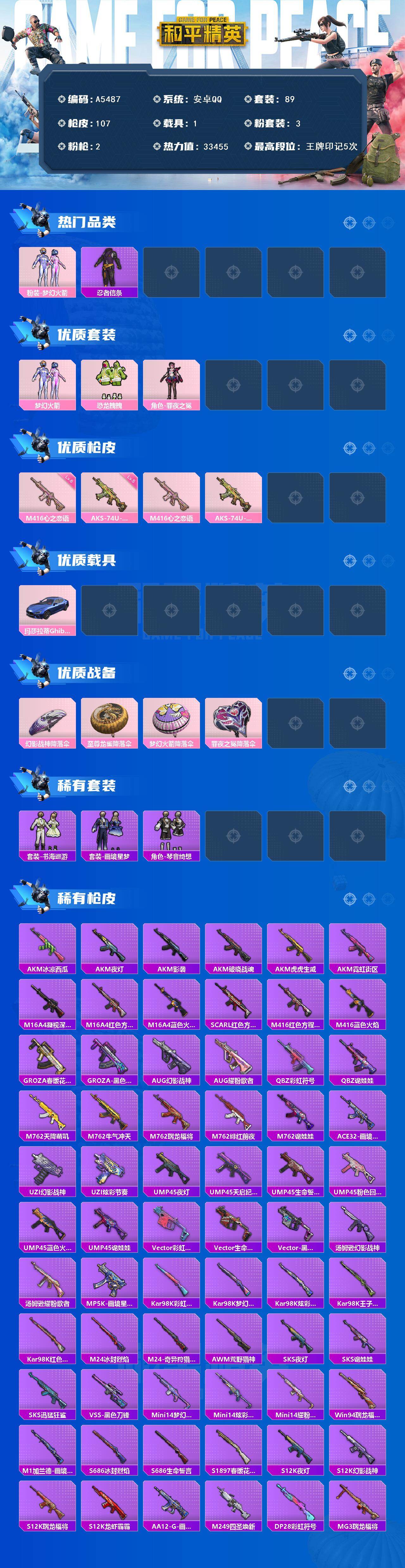 [16408127]安卓 【公主号 梦幻火箭/恐龙拽拽/m416-心之恋语六级/玛莎拉蒂ghibli(蓝)】手q-3粉装-2特效呛-1载具-0粉色飞行器-33455热力值-5王牌印记-89套装-107呛皮 【热门品类】:粉装-梦幻火箭,套装-忍者信条 【粉色套装】:粉装-梦幻火箭,粉装-恐龙拽拽,角色-罪夜之冕 【粉色呛皮等级】:m416-心之恋语六级,aks-74u-森灵之息五级 【粉色载具】:玛莎拉蒂ghibli(蓝) 【粉色呛皮】:m416-心之恋语,aks-74u-森灵之息 【粉色降落伞】:幻影战神降落伞,至尊龙雀降落伞,梦幻火箭降落伞,罪夜之冕降落伞 【稀有套装】:套装-书海巡游,套装-画境星梦,套装-琴音绮想 【稀有呛皮】:akm-冰凉西瓜,akm-夜灯,akm-影袭,akm-破晓战魂,akm-虎虎生威,akm-霓虹街区,m16a4-凝视深渊,m16a4-红色方程式,m16a4-蓝色火焰,scar-l-红色方程式,m416-红色方程式,m416-蓝色火焰,groza-春暖花开,groza-黑色刀锋,aug-幻影战神,aug-耀粉歌者,q-彩虹符号,q-诡娃娃,m762-天降萌叽,m762-牛气冲天,m762-瑞龙福将,m762-绯红前夜,m762-诡娃娃,ace32-画境星梦,uzi-幻影战神,uzi-炫彩节奏,ump45-夜灯,ump45-天启纪元,ump45-生命誓言,ump45-粉色回忆,ump45-蓝色火焰,ump45-诡娃娃,vect-彩虹符号,vect-生命誓言,vect-黑色刀锋,汤姆逊-幻影战神,汤姆逊-耀粉歌者,mp5k-画境星梦,kar98k-彩虹符号,kar98k-梦幻火箭,kar98k-炫彩节奏,kar98k-王子的夏天,kar98k-红色方程式,m24-冰封烈焰,m24-奇异狩猎者,awm-荒野猎神,sks-夜灯,sks-诡娃娃,sks-迅猛狂鲨,vss-黑色刀锋,mini14-梦幻火箭,mini14-炫彩节奏,mini14-耀粉歌者,win94-瑞龙福将,m1加兰德-画境星梦,s686-冰封烈焰,s686-生命誓言,s1897-春暖花开,s12k-瑞龙福将,s12k-龙虾霸霸,s12k-夜灯,s12k-幻影战神,aa12-g-画境星梦,m249-四圣焕新,dp-28-彩虹符号,mg3-瑞龙福将,p92-雷霆特警,