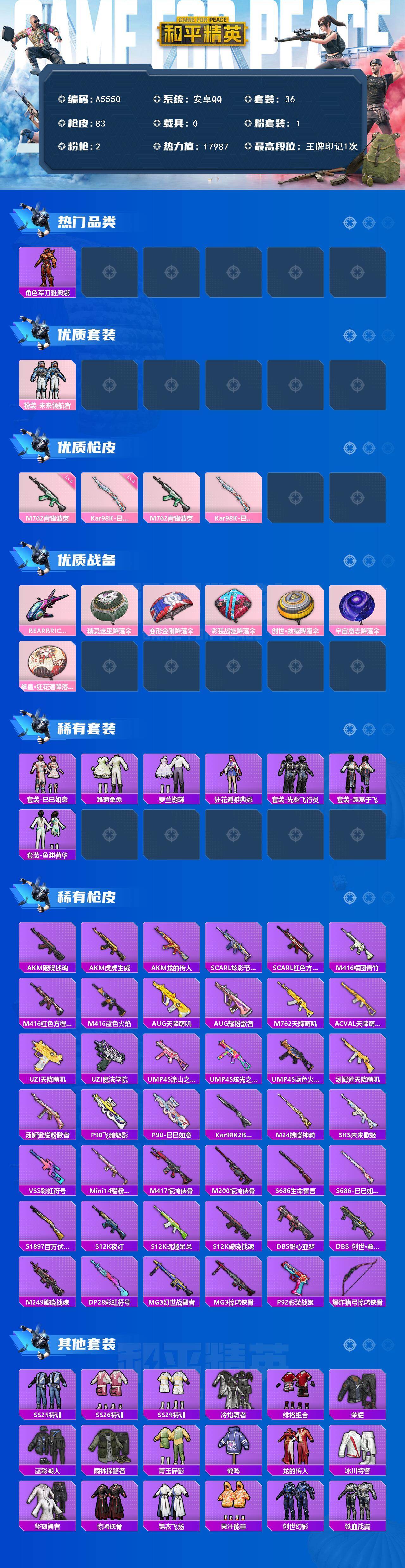 [16408254]安卓 【小号 军刀雅典娜/未来领航者/m762-青锋波束五级】手q-1粉装-2特效呛-0载具-1粉色飞行器-17987热力值-1王牌印记-36套装-83呛皮 【热门品类】:角色-军刀雅典娜 【粉色套装】:粉装-未来领航者 【粉色呛皮等级】:m762-青锋波束五级,kar98k-巳巳如意三级 【粉色呛皮】:m762-青锋波束,kar98k-巳巳如意 【粉色飞行器】:bearbrick飞行器 【粉色降落伞】:精灵迷巫降落伞,变形金刚降落伞,彩装战姬降落伞,创世·救赎降落伞,宇宙意志降落伞,拳皇·狂花道降落伞 【稀有套装】:套装-巳巳如意,套装-雏菊兔兔,套装-萝兰蝴蝶,角色-狂花道·雅典娜,套装-先驱飞行员,套装-燕燕于飞,套装-鱼渊荷华 【稀有呛皮】:akm-破晓战魂,akm-虎虎生威,akm-龙的传人,scar-l-炫彩节奏,scar-l-红色方程式,m416-糯团青竹,m416-红色方程式,m416-蓝色火焰,aug-天降萌叽,aug-耀粉歌者,m762-天降萌叽,ac-val-天降萌叽,uzi-天降萌叽,uzi-魔法学院,ump45-涂山之恋,ump45-炫光之旅,ump45-蓝色火焰,汤姆逊-天降萌叽,汤姆逊-耀粉歌者,p90-飞驰魅影,p90-巳巳如意,kar98k-2b战斗服款,m24-拂晓神骑,sks-未来歌姬,vss-彩虹符号,mini14-耀粉歌者,m417-惊鸿侠骨,m200-惊鸿侠骨,s686-生命誓言,s686-巳巳如意,s1897-百万伏特,s12k-玩趣呆呆,s12k-破晓战魂,s12k-夜灯,dbs-甜心亚梦,dbs-创世·救赎,m249-破晓战魂,dp-28-彩虹符号,mg3-幻世战舞者,mg3-惊鸿侠骨,p92-彩装战姬,爆炸猎弓-惊鸿侠骨 【其他套装】:套装-ss25特训,套装-ss26特训,套装-ss29特训,套装-冷焰舞者,套装-绯格组合,套装-荣耀,套装-蓝彩潮人,套装-雨林探路者,套装-青玉碎影,套装-鹤鸣,套装-龙的传人,套装-冰川特警,套装-坚韧舞者,套装-惊鸿侠骨,套装-锦衣飞扬,套装-果汁能量,套装-创世·幻影,套装-铁血战翼 【稀有头盔】:精灵迷巫头盔1级,百万伏特头盔2级 【稀有背包】:梦幻火箭背包2级 【营地id】:971810729