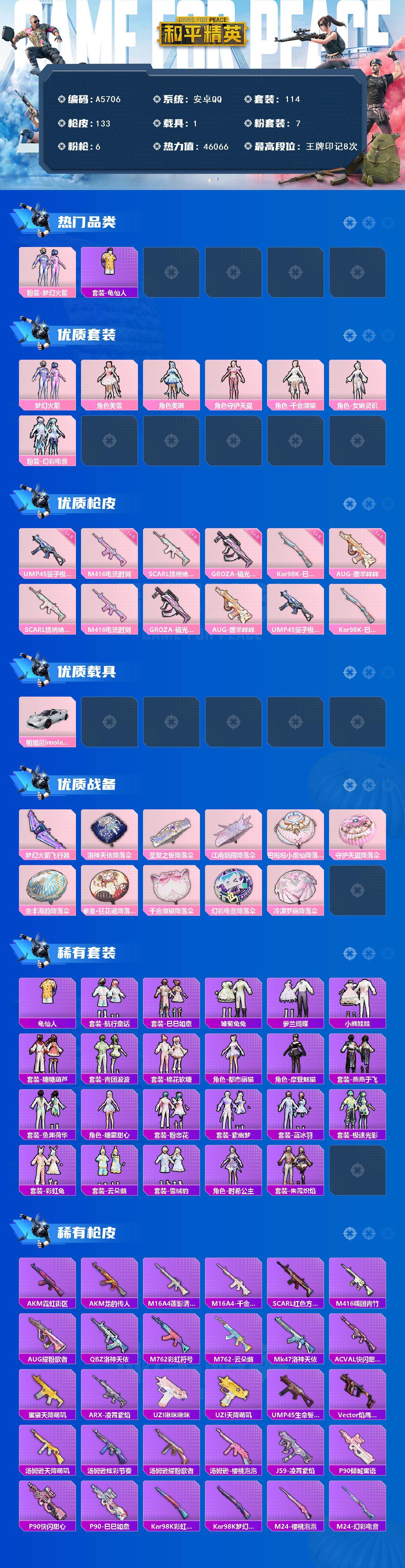 [16409158]安卓 【公主号 梦幻火箭/龟仙人/美雪/美琪/女娲灵识/m416-电玩时刻五级/帕加尼imola(艺术银)】手q-7粉装-6特效呛-1载具-1粉色飞行器-46066热力值-8王牌印记-114套装-133呛皮 【热门品类】:粉装-梦幻火箭,套装-龟仙人 【粉色套装】:粉装-梦幻火箭,角色-美雪,角色-美琪,角色-守护天翼,角色-千金淑猫,角色-女娲灵识,粉装-幻彩电音 【粉色呛皮等级】:scar-l-锦绣绵绵五级,m416-电玩时刻五级,groza-镜光银凌五级,aug-暖羊咩咩五级,ump45-量子极限五级,kar98k-巳巳如意五级 【粉色载具】:帕加尼imola(艺术银) 【粉色呛皮】:scar-l-锦绣绵绵,m416-电玩时刻,groza-镜光银凌,aug-暖羊咩咩,ump45-量子极限,kar98k-巳巳如意 【粉色飞行器】:梦幻火箭飞行器 【粉色降落伞】:洛神天依降落伞,圣堂之誓降落伞,江南烟雨降落伞,巴啦啦小魔仙降落伞,守护天翼降落伞,金丰海韵降落伞,拳皇·狂花道降落伞,千金淑猫降落伞,幻彩电音降落伞,冷漠罗丽降落伞 【稀有套装】:套装-龟仙人,套装-航行童话,套装-巳巳如意,套装-雏菊兔兔,套装-萝兰蝴蝶,套装-小熊娃娃,套装-糖糖葫芦,套装-青团波波,套装-棉花软糖,角色-都市丽猫,角色-摩登魅猫,套装-燕燕于飞,套装-鱼渊荷华,角色-糖霜甜心,套装-粉恋花,套装-紫幽梦,套装-蓝冰羽,套装-极速光影,套装-彩虹兔,套装-云朵鹅,套装-雪绒豹,角色-时希公主,套装-朱霞炽焰 【稀有呛皮】:akm-霓虹街区,akm-龙的传人,m16a4-莲影清波,m16a4-千金淑猫,scar-l-红色方程式,m416-糯团青竹,aug-耀粉歌者,q-洛神天依,m762-彩虹符号,m762-云朵鹅,mk47-洛神天依,ac-val-快闪甜心,蜜獾-天降萌叽,arx-凌霄紫焰,uzi-啾咪啾咪,uzi-天降萌叽,ump45-生命誓言,vect-焰鹰斗篷,汤姆逊-天降萌叽,汤姆逊-炫彩节奏,汤姆逊-耀粉歌者,汤姆逊-樱桃泡泡,js9-凌霄紫焰,p90-倾城蜜语,p90-快闪甜心,p90-巳巳如意,kar98k-彩虹符号,kar98k-梦幻火箭,m24-幻彩电音,m24-樱桃泡泡,awm-焰鹰斗篷,awm-鎏金朋克,sks-炫彩节奏,m