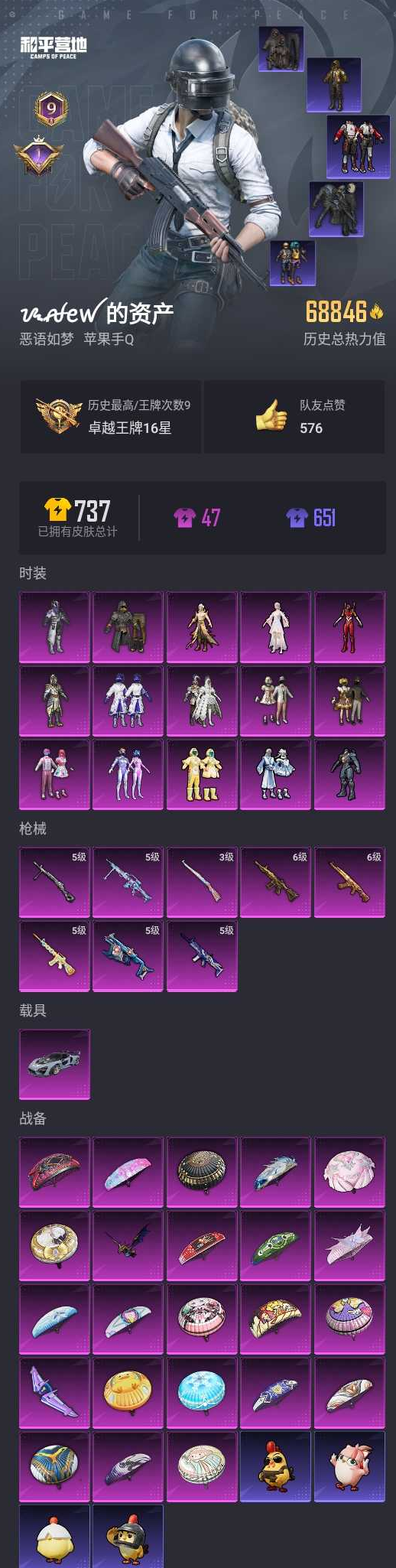 【和平精英】【lyhp21456】15粉装,8特效呛,1载具,历史最高段位:卓越王牌16星 王牌印记9次 热力值:68856,179套装,206呛械,219装备,107战备;套装:套装-极限特训,套装-幻影战神,套装-甜心巧克力,套装-宝贝奶油派,套装-天使彩虹糖,套装-金曜白虎,套装-梦幻火箭,套装-新星烈龙,套装-冰霜白皇,角色-2号机款机体服,角色-复仇流浪者,套装-傲雪凌霜,套装-垂柳戏鸭,角色-烟云彩露,角色-罗征,套装-特训学院,套装-猎鹰,套装-青年教官,套装-橘黑制服,套装-红色运动,套装-黄色运动,套装-蓝色运动,套装-黄色伏地魔,套装-白色伏地魔,套装-黑色伏地魔,套装-竞技名士,套装-深蓝色名流,套装-酒红色名流,套装-湖蓝色名流,套装-黄色名流,套装-猛禽,套装-长空猛禽,套装-漫步者,套装-蓝色守护者,套装-海岛探路者,套装-旭日情侣,套装-冷焰舞者,套装-灼焰舞者,套装-都市猎人,套装-浪漫天命,套装-特战装甲,套装-贵族骑装,套装-战地督导,套装-春日漫步,套装-鹰眼刺客,套装-冰冻风暴,套装-冷酷挑战者,套装-完美偶像,套装-人气偶像,套装-幻影武者,套装-热血骑手,套装-特战英豪,套装-街头潮人,套装-蓝彩潮人,套装-神秘领域,套装-怒火燎原,套装-魅力单车,套装-绮丽涂鸦,套装-耀眼新星,套装-狂战萌兔,套装-竞技达人朋克,套装-野性战心,套装-金羽特工,套装-超能勇士,套装-狂沙舞者,套装-破晓战魂,套装-都市魅力,套装-雪山精英,套装-极地朋克,套装-幻世战舞者,套装-奇异狩猎者,套装-金耀舞者,套装-蓝调潮人,套装-暗影哥特,套装-迅捷狂鲨,套装-呆萌铁蟹,套装-深海小丑鱼,套装-青涩时光,套装-缤纷果语,套装-滨海厨神,套装-风暴特警,套装-冰川特警,套装-青涩年华,套装-星河浪客,套装-元素星魂,套装-幻影公爵,套装-极速红龙,套装-格斗先锋,套装-麻辣教官,套装-破蛋小黄鸡,套装-疯狂小兔子,套装-好奇恐龙,套装-军械专家,套装-鹤鸣,套装-潮萌小黄鸭,套装-白熊同盟,套装-夏日音浪,套装-探宝勇士,套装-ag战队服,套装-牛气满满,套装-白糯汤圆,套装-战术大师,套装-牛气冲天,套装-ss18特训,套装-耀粉歌者,套装-飞行日记,角色-明日香款战斗服,角色-薰款战斗服,套装-ag追光队服,套装-ss16特训,角色-英勇保护者,套装-ss17特训,套装-福星高照,角色-军刀雅典娜,套装-落日神探,套装-沙暴悍客,套装-ss19特训,套装-沁蓝冰爽,套装-飞驰魅影,套装-音速流光,套装-炫蓝之夏,套装-ss20特训,套装-软羊咩咩,套装-猎梦纪元,套装-甜心亚梦,套装-虚音幻奏,套装-ss21特训,套装-萌趣咩咩,套装-娇憨猪猪,套装-夏雨游龙,套装-荷畔雨呱,套装-暗夜行者,套装-玉兔迎春,套装-ss22特训,套装-田园牧歌,套装-轻风白浪,套装-白啸长虹,套装-光之冒险,套装-绯格组合,套装-ss23特训,套装-王牌教练,套装-柠萌假日,套装-ss24特训,套装-龟仙人,套装-ss25特训,套装-ss27特训,套装-老实芭蕉,角色-拉斐尔,套装-街头风暴,套装-蝶变,套装-ss29特训,套装-虚空漩涡,角色-绯色魅影,套装-异域银装,套装-星途旅人,套装-ss30特训,套装-ss31特训,套装-智谋强哥,套装-紫幽梦,套装-ss33特训,套装-云朵鹅,套装-巳巳如意,套装-ss32特训,套装-蓝冰羽,套装-顶瓜瓜,套装-雪绒豹,套装-大橘大利,套装-极速光影,套装-元气之梦,套装-ss34特训,套装-擎苍青焰,套装-朱霞炽焰,套装-凌霄紫焰,套装-ss35特训,套装-午间小调,套装-风迹短诗,套装-ss37特训,套装-ss36特训,套装-萌鸡速递;呛皮:5级scar-l-青春物语,scar-l-黄金龙骨,scar-l-夜灯,scar-l-炫彩节奏,scar-l-彩虹符号,scar-l-兔兔白日梦,scar-l-玉兔迎春,6级m416-五爪金龙,m416-夜灯,m416-蓝色火焰,m416-月影鸳鸯,m416-圣诞惊喜,m416-暗夜行者,m416-糯团青竹,5级m16a4-垂柳戏鸭,m16a4-快乐主宰,m16a4-甜心亚梦,m16a4-幻世战舞者,m16a4-冰河战士,m762-奇异狩猎者,m762-甜心宝贝,m762-彩虹符号,m762-暖熊萌萌,m762-彩虹甜喵,m762-天降萌叽,m762-云朵鹅,蜜獾-娇憨猪猪,蜜獾-垂柳戏鸭,蜜獾-千面幻镜,蜜獾-天降萌叽,蜜獾-风迹短诗,蜜獾-乌木金纹,aug-幻影战神,aug-海螺星光,aug-异域银装,ace32-冰晶雪宝,groza-影袭,groza-彩虹符号,groza-青春物语,groza-田园牧歌,groza-海盐豹豹,ac-val-甜心亚梦,ac-val-乌木金纹,ac-val-天降萌叽,6级akm-甜心宝贝,akm-灼热熔岩,akm-影袭,akm-奇异狩猎者,akm-破晓战魂,akm-涂鸦街区,akm-虎虎生威,akm-恐龙拽拽,akm-环太平洋,akm-霓彩脉冲,arx-凌霄紫焰,mk47-乌木金纹,mk47-风迹短诗,famas-霓彩脉冲,famas-乌木金纹,g36c-冷魅冰骑,g36c-星穹咏叹调,g36c-乌木金纹,q-飞驰魅影,3级kar98k-巳巳如意,kar98k-影袭,kar98k-金玉无双,kar98k-幻影战神,kar98k-梦幻火箭,kar98k-炫彩节奏,kar98k-飞驰魅影,kar98k-顶峰精英,kar98k-乌木金纹,win94-乌木金纹,m24-影袭,m24-奇异狩猎者,m24-未来战士,m24-幻彩电音,m24-乌木金纹,amr-暗夜行者,awm-恐龙拽拽,awm-垂柳戏鸭,awm-天降萌叽,莫辛纳甘-乌木金纹,莫辛纳甘-风迹短诗,svd-云朵鹅,svd-霓彩脉冲,m200-乌木金纹,mk14-乌木金纹,mk14-冰河战士,mk14-紫幽梦,slr-月影鸳鸯,slr-娇憨猪猪,slr-霓彩脉冲,mini14-金玉无双,mini14-穿刺龙虾,mini14-梦幻火箭,mini14-炫彩节奏,mini14-耀粉歌者,mini14-旋转彩虹,mini14-香桃花海,mini14-鸡智如我,mk20-h-狂鲨锋刃,mk20-h-乌木金纹,vss-星之彼岸,vss-田园牧歌,vss-彩虹符号,vss-香桃花海,mk12-风迹短诗,mk12-乌木金纹,sks-炫彩节奏,m417-玩趣呆呆,p90-飞驰魅影,p90-巳巳如意,p90-乌木金纹,汤姆逊-奇异狩猎者,汤姆逊-幻影战神,汤姆逊-炫彩节奏,汤姆逊-环太平洋,汤姆逊-天降萌叽,ump45-夜灯,ump