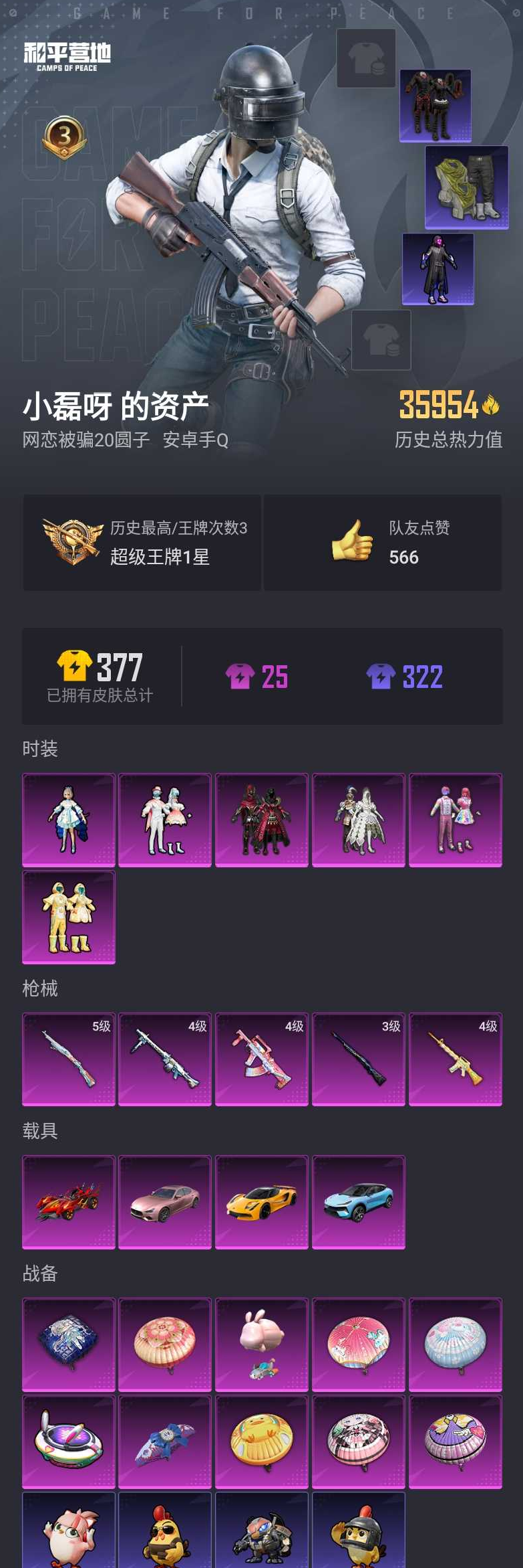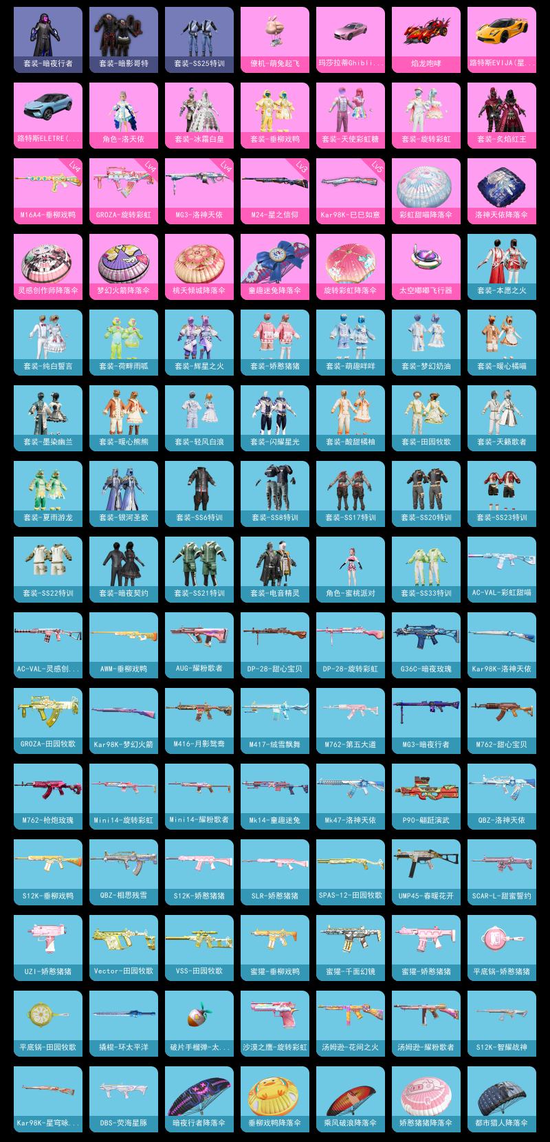 【和平精英】【lyhp21493】6粉装,5特效呛,4载具,历史最高段位:超级王牌1星 王牌印记3次 热力值:36452,76套装,101呛械,121装备,55战备;套装:套装-天使彩虹糖,套装-冰霜白皇,套装-炙焰红王,角色-洛天依,套装-垂柳戏鸭,套装-旋转彩虹,套装-黄色运动,套装-蓝色运动,套装-黑色伏地魔,套装-骑行爱好者,套装-竞技名士,套装-长空猛禽,套装-竞技勇士朋克,套装-蓝色守护者,套装-冷焰舞者,套装-甜蜜告白,套装-魅力单车,套装-绮丽涂鸦,套装-野性战心,套装-狂沙舞者,套装-丛林猎人,套装-雪山精英,套装-幻世战舞者,套装-暗影哥特,套装-缤纷果语,套装-滨海厨神,套装-麻辣教官,套装-疯狂小兔子,套装-北国孤狼,套装-ss6特训,套装-跃动心情,套装-银河圣歌,套装-闪耀星光,套装-鹤鸣,套装-霓虹街区,套装-暗夜契约,套装-纯白誓言,套装-ss8特训,套装-本愿之火,套装-辉星之火,套装-战术大师,套装-牛气冲天,套装-飞行日记,套装-天籁歌者,套装-电音精灵,套装-吉莉礼服,套装-ss17特训,套装-ss20特训,套装-ss21特训,套装-暖心熊熊,套装-萌趣咩咩,套装-娇憨猪猪,套装-墨染幽兰,套装-夏雨游龙,套装-荷畔雨呱,套装-暖心橘喵,套装-梦幻奶油,套装-酸甜橘柚,套装-暗夜行者,套装-玉兔迎春,套装-ss22特训,套装-田园牧歌,套装-轻风白浪,套装-光之冒险,套装-ss23特训,套装-柠萌假日,套装-ss25特训,套装-龙的传人,套装-恋语绒绒,套装-异域银装,角色-蜜桃派对,套装-ss31特训,套装-ss33特训,套装-ss32特训,套装-顶瓜瓜,套装-大橘大利;呛皮:蜜獾-娇憨猪猪,蜜獾-垂柳戏鸭,蜜獾-千面幻镜,蜜獾-天降萌叽,蜜獾-鸡智如我,蜜獾-乌木金纹,m416-蓝色火焰,m416-月影鸳鸯,m416-糯团青竹,scar-l-红色方程式,scar-l-甜蜜誓约,scar-l-玉兔迎春,famas-乌木金纹,q-彩虹符号,q-相思残雪,q-洛神天依,q-乌木金纹,g36c-暗夜玫瑰,g36c-乌木金纹,mk47-洛神天依,mk47-乌木金纹,akm-生命誓言,akm-破晓战魂,akm-彩虹符号,akm-龙的传人,4级groza-旋转彩虹,groza-彩虹符号,groza-田园牧歌,groza-乌木金纹,ac-val-灵感创作师,ac-val-彩虹甜喵,ac-val-天降萌叽,4级m16a4-垂柳戏鸭,m16a4-蓝色火焰,m16a4-红色方程式,m762-甜心宝贝,m762-呛炮玫瑰,m762-第五大道,m762-天降萌叽,aug-耀粉歌者,aug-天降萌叽,aug-异域银装,m200-乌木金纹,莫辛纳甘-乌木金纹,5级kar98k-巳巳如意,kar98k-红色方程式,kar98k-梦幻火箭,kar98k-彩虹符号,kar98k-洛神天依,kar98k-星穹咏叹调,awm-垂柳戏鸭,3级m24-星之信仰,mk14-童趣迷兔,mk14-乌木金纹,vss-田园牧歌,m417-绒雪飘舞,m417-玩趣呆呆,slr-娇憨猪猪,mini14-耀粉歌者,mini14-旋转彩虹,ump45-夜灯,ump45-蓝色火焰,ump45-生命誓言,ump45-春暖花开,ump45-海盐豹豹,汤姆逊-花间之火,汤姆逊-耀粉歌者,uzi-红色方程式,uzi-娇憨猪猪,vect-夜灯,vect-田园牧歌,vect-乌木金纹,p90-翩跹演武,p90-乌木金纹,s12k-娇憨猪猪,s12k-垂柳戏鸭,s12k-幻世战舞者,s12k-玩趣呆呆,s12k-智耀战神,s12k-乌木金纹,s686-红色方程式,s686-生命誓言,dbs-荧海星豚,s1897-炫彩节奏,s1897-乌木金纹,spas-12-田园牧歌,m249-破晓战魂,m249-糯团青竹,dp-28-甜心宝贝,dp-28-旋转彩虹,4级mg3-洛神天依,mg3-乌木金纹,mg3-暗夜行者,mg3-霓彩脉冲,沙墨之鹦-旋转彩虹,撬棍-环太平洋,平底锅-娇憨猪猪,平底锅-田园牧歌,平底锅-光之冒险,十子怒-异域银装,破片手留单-太空嘟嘟;载具:焰龙咆哮,路特斯eletre冰川蓝,路特斯evija星际黄,玛莎拉蒂ghibli粉;降落伞:太空嘟嘟飞行器,粉色滑翔尾迹,红色滑翔尾迹,异域银装飞行器;滑翔尾迹:僚机-萌兔起飞; 详情看图6粉装5特效呛5载具含1飞机 洛天依 狂沙舞者 暗影哥特 暗夜行者 4级mg3洛天神依 4级狗杂旋转彩虹 玛莎拉蒂 路特斯