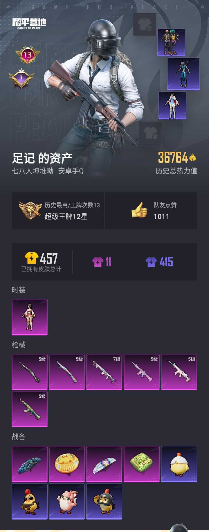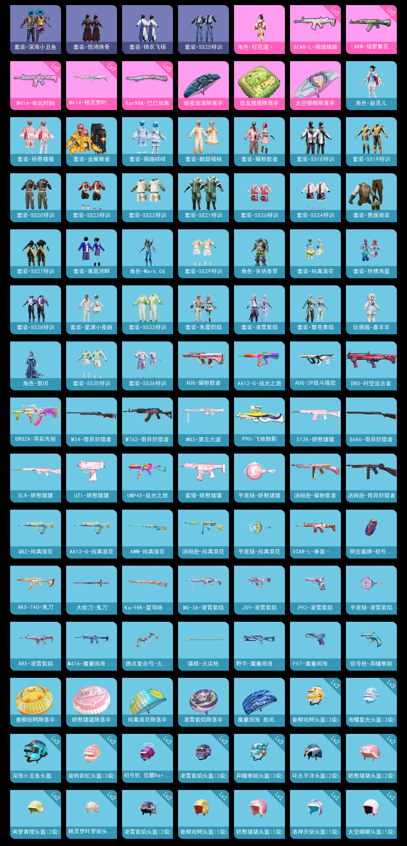 【和平精英】【lyhp21529】1粉装,6特效呛,0载具,历史最高段位:超级王牌12星 王牌印记13次 热力值:36764,107套装,132呛械,121装备,79战备;套装:角色-狂花道·不知火舞,套装-特训学院,套装-猎鹰,套装-青年教官,套装-橘黑制服,套装-红色运动,套装-黄色运动,套装-蓝色运动,套装-黄色伏地魔,套装-白色伏地魔,套装-黑色伏地魔,套装-竞技名士,套装-深蓝色名流,套装-酒红色名流,套装-湖蓝色名流,套装-黄色名流,套装-猛禽,套装-长空猛禽,套装-黎明保卫者,套装-旭日情侣,套装-冷焰舞者,套装-灼焰舞者,套装-贵族骑装,套装-战地督导,套装-龙腾端午,套装-完美偶像,套装-人气偶像,套装-幻影武者,套装-街头潮人,套装-蓝彩潮人,套装-魅力单车,套装-绮丽涂鸦,套装-竞技达人朋克,套装-都市漫游者,套装-破晓战魂,套装-都市魅力,套装-荣耀,套装-幻世战舞者,套装-金耀舞者,套装-深海小丑鱼,套装-青涩时光,套装-缤纷果语,套装-滨海厨神,套装-龙魂突击队,套装-极速红龙,套装-麻辣教官,套装-破蛋小黄鸡,套装-霓虹街区,套装-萌黄之夏,套装-夏日音浪,套装-探宝勇士,套装-战术大师,套装-牛气冲天,套装-ss18特训,套装-耀粉歌者,套装-热情海星,套装-纯真浪花,套装-ss19特训,套装-炫蓝之夏,套装-ss20特训,套装-ss21特训,套装-萌趣咩咩,套装-娇憨猪猪,套装-酸甜橘柚,角色-赵灵儿,套装-玉兔迎春,套装-ss22特训,套装-光之冒险,套装-ss23特训,套装-莱茵河畔,套装-王牌教练,套装-柠萌假日,套装-ss24特训,套装-龟仙人,套装-ss25特训,套装-惊鸿侠骨,套装-锦衣飞扬,套装-龙的传人,套装-冰河战士,套装-ss26特训,套装-空岛之星,套装-ss27特训,套装-老实芭蕉,套装-ss28特训,角色-多纳泰罗,角色-mark.06,套装-海盐绵绵冰,套装-蝶变,套装-ss29特训,套装-ss31特训,套装-智谋强哥,套装-ss33特训,套装-巳巳如意,套装-ss32特训,套装-顶瓜瓜,套装-大橘大利,套装-星渊小夜曲,玩偶服-喜羊羊,套装-元气之梦,套装-ss34特训,套装-擎苍青焰,套装-朱霞炽焰,套装-凌霄紫焰,角色-敖闰,套装-ss35特训,套装-ss36特训,套装-萌鸡速递;呛皮:ac-val-乌木金纹,ac-val-天降萌叽,m16a4-红色方程式,m16a4-幻世战舞者,m16a4-冰河战士,aug-耀粉歌者,aug-2p战斗服款,aug-异域银装,aug-紫晶流影,5级akm-绿萝繁花,akm-破晓战魂,akm-霓虹街区,akm-涂鸦街区,akm-彩虹符号,akm-龙的传人,akm-霓彩脉冲,5级m416-电玩时刻,m416-蓝色火焰,m416-红色方程式,m416-糯团青竹,m416-魔童闹海 敖闰,蜜獾-娇憨猪猪,蜜獾-天降萌叽,蜜獾-鸡智如我,蜜獾-乌木金纹,groza-异彩先驱,groza-海盐豹豹,5级scar-l-锦绣绵绵,scar-l-红色方程式,scar-l-玉兔迎春,scar-l-拳皇·狂花道,scar-l-海盐豹豹,m762-奇异狩猎者,m762-彩虹符号,m762-天降萌叽,mk47-乌木金纹,famas-霓彩脉冲,famas-乌木金纹,arx-凌霄紫焰,g36c-乌木金纹,q-纯真浪花,awm-纯真浪花,m200-惊鸿侠骨,m200-乌木金纹,5级kar98k-巳巳如意,kar98k-红色方程式,kar98k-王子的夏天,kar98k-彩虹符号,kar98k-炫彩节奏,kar98k-星穹咏叹调,m24-奇异狩猎者,m24-炫彩节奏,m24-乌木金纹,win94-乌木金纹,amr-乌木金纹,svd-霓彩脉冲,莫辛纳甘-乌木金纹,m417-惊鸿侠骨,m417-玩趣呆呆,7级mk14-精灵梦叶罗丽,mk14-乌木金纹,mk14-冰河战士,slr-娇憨猪猪,slr-彩虹符号,sks-炫彩节奏,sks-糯团青竹,mk20-h-乌木金纹,vss-彩虹符号,汤姆逊-奇异狩猎者,汤姆逊-耀粉歌者,汤姆逊-天降萌叽,汤姆逊-纯真浪花,p90-飞驰魅影,p90-玩趣呆呆,p90-巳巳如意,p90-乌木金纹,vect-生命誓言,vect-彩虹符号,ump45-蓝色火焰,ump45-炫光之旅,ump45-海盐豹豹,uzi-娇憨猪猪,uzi-冰河战士,uzi-啾咪啾咪,aks-74u-鬼刀,aks-74u-乌木金纹,mp5k-乌木金纹,js9-凌霄紫焰,野牛-魔童闹海 敖闰,野牛-乌木金纹,aa12-g-炫光之旅,aa12-g-纯真浪花,s12k-破晓战魂,s12k-娇憨猪猪,s12k-幻世战舞者,s12k-霓彩脉冲,s686-奇异狩猎者,s686-巳巳如意,s1897-炫彩节奏,dbs-时空追击者,dbs-乌木金纹,mg3-幻世战舞者,mg3-乌木金纹,mg3-第五大道,mg3-惊鸿侠骨,5级dp-28-豹影疾电,dp-28-彩虹符号,mg-36-凌霄紫焰,m249-彩虹符号,m249-糯团青竹,pkm-明月桂语,信号呛-异瞳寒姬,p92-凌霄紫焰,f57-魔童闹海 敖闰,平底锅-娇憨猪猪,平底锅-光之冒险,平底锅-惊鸿侠骨,平底锅-空岛之星,平底锅-纯真浪花,平底锅-属我最6,平底锅-凌霄紫焰,大砍刀-鬼刀,撬棍-幻世战舞者,撬棍-火尖呛,突击盾牌-初号机 觉醒ver.,十子怒-异域银装,燃点复合弓-火尖莲影,破片手留单-呆爆全场,破片手留单-海盐豹豹,破片手留单-拽到爆炸,破片手留单-巳巳如意,爆炸猎弓-惊鸿侠骨;降落伞:粉色滑翔尾迹,光之冒险尾迹,空岛之星尾迹,异域银装飞行器,鸡智如我飞行器; 详情看图高印记 狂花道 深海小丑鱼 满级mk14精灵梦叶罗丽