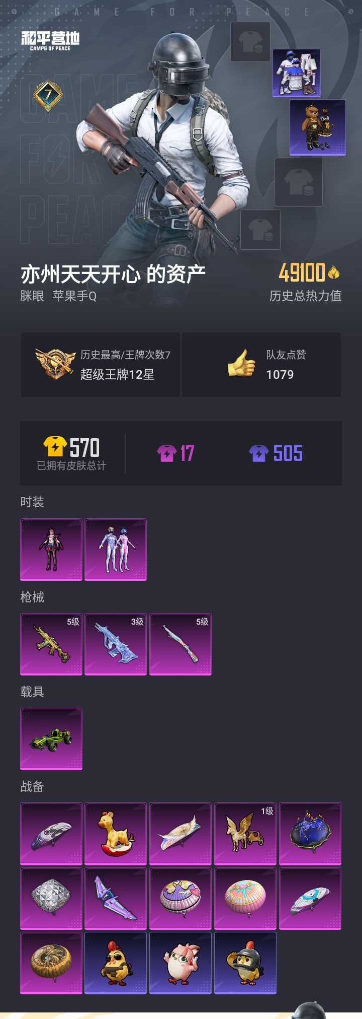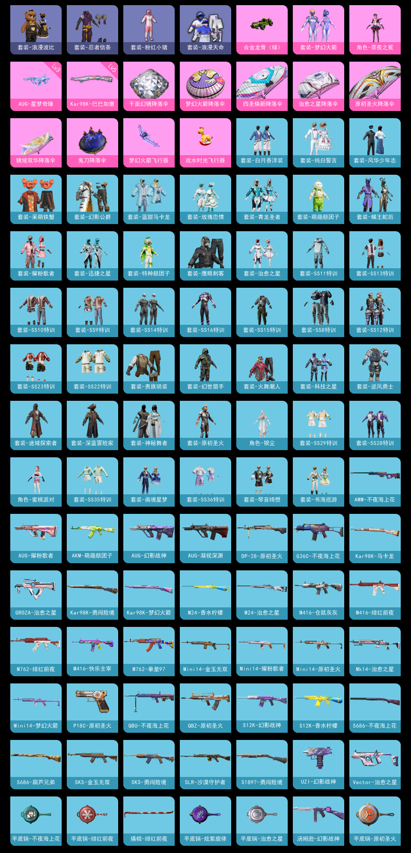 【和平精英】【lyhp21528】2粉装,3特效呛,1载具,历史最高段位:超级王牌12星 王牌印记7次 热力值:49100,127套装,156呛械,168装备,96战备;套装:套装-梦幻火箭,角色-罪夜之冕,套装-红色运动,套装-黄色运动,套装-白色伏地魔,套装-黑色伏地魔,套装-竞技名士,套装-黄色名流,套装-长空猛禽,套装-竞技勇士朋克,套装-蓝色守护者,套装-海岛探路者,套装-六六大吉,套装-冷焰舞者,套装-灼焰舞者,套装-刚毅裁决者,套装-浪漫天命,套装-战地菁英,套装-贵族骑装,套装-战地督导,套装-青春校园,套装-甜蜜告白,套装-春日漫步,套装-燃烧卡路里,套装-暗黑骑手,套装-鹰眼刺客,套装-海滨突袭者,套装-街头潮人,套装-蓝彩潮人,套装-魅力单车,套装-雪山征服者,套装-夜莺强袭者,套装-野性战魂,套装-破晓战魂,套装-ss2特训,套装-火舞潮人,套装-派对绅士,套装-雪山精英,套装-极地朋克,套装-红镰战舞者,套装-甜蜜菠萝,套装-半糖蓝莓,套装-向日葵先生,套装-呆萌铁蟹,套装-午夜朋克,套装-青涩时光,套装-缤纷果语,套装-滨海厨神,套装-冰川特警,套装-元素星魂,套装-幻影公爵,套装-忍者信条,套装-极速红龙,套装-格斗先锋,套装-海上生明月,套装-ss3特训,套装-粉红小猪,套装-破蛋小黄鸡,套装-疯狂小兔子,套装-幻世猎手,套装-深蓝冒险家,套装-迷域探索者,套装-ss5特训,套装-圣诞大吉,套装-熔岩使者,套装-凛冬战士,套装-浪漫波比,套装-金鼠迎春,套装-纯白誓言,套装-ss10特训,套装-ss8特训,套装-白熊同盟,套装-萌黄之夏,套装-夏日音浪,套装-ss9特训,套装-风华少年志,套装-白月香洋装,套装-神秘舞者,套装-蓝甜马卡龙,套装-牛气满满,套装-玫瑰恋情,套装-白糯汤圆,套装-ss11特训,套装-青龙圣者,套装-原初圣火,套装-逆风勇士,套装-萌趣颜团子,套装-特种颜团子,套装-战术大师,套装-ss12特训,套装-牛气冲天,套装-耀粉歌者,套装-迅捷之星,套装-治愈之星,套装-科技之星,套装-ss13特训,套装-ss14特训,套装-吉莉礼服,套装-蝎王蛇后,套装-ss15特训,套装-ss16特训,套装-ss22特训,套装-ss23特训,套装-王牌教练,套装-柠萌假日,套装-云魄琉璃,套装-恋语绒绒,套装-老实芭蕉,套装-ss28特训,玩偶服-卖崽青蛙,角色-银尘,套装-街头风暴,套装-ss29特训,角色-蜜桃派对,套装-ss30特训,套装-ss31特训,角色-风玲,套装-巳巳如意,套装-ss32特训,套装-青翼流星,套装-ss35特训,套装-琴音绮想,套装-画境星梦,套装-书海巡游,套装-ss37特训,套装-ss36特训,套装-雪国风尚;呛皮:q-原初圣火,q-彩虹符号,q-乌木金纹,akm-冰凉西瓜,akm-破晓战魂,akm-夜灯,akm-彩虹符号,akm-萌趣颜团子,akm-乌木金纹,m762-绯红前夜,m762-拳皇97,m762-牛气冲天,m762-天降萌叽,m762-乌木金纹,scar-l-红色方程式,scar-l-黄金龙骨,scar-l-夜灯,scar-l-炫彩节奏,scar-l-海盐豹豹,scar-l-乌木金纹,m416-夜灯,m416-蓝色火焰,m416-绯红前夜,m416-红色方程式,m416-快乐主宰,m416-仓鼠灰灰,m416-糯团青竹,m416-乌木金纹,groza-生命誓言,groza-治愈之星,groza-彩虹符号,groza-乌木金纹,m16a4-蓝色火焰,m16a4-生命誓言,m16a4-红色方程式,m16a4-夜灯,m16a4-幻世战舞者,m16a4-乌木金纹,蜜獾-乌木金纹,ace32-画境星梦,ace32-冰晶雪宝,3级aug-星梦奇缘,aug-幻影战神,aug-凝视深渊,aug-耀粉歌者,aug-乌木金纹,g36c-不夜海上花,5级kar98k-巳巳如意,kar98k-红色方程式,kar98k-王子的夏天,kar98k-梦幻火箭,kar98k-勇闯险境,kar98k-马卡龙,kar98k-彩虹符号,kar98k-乌木金纹,svd-自由猎手,awm-不夜海上花,awm-天降萌叽,awm-乌木金纹,m24-冰封烈焰,m24-治愈之星,m24-香水柠檬,莫辛纳甘-乌木金纹,win94-乌木金纹,m200-乌木金纹,mini14-生命誓言,mini14-金玉无双,mini14-金鼠迎春,mini14-梦幻火箭,mini14-原初圣火,mini14-炫彩节奏,mini14-耀粉歌者,mini14-香桃花海,qbu-不夜海上花,vss-香桃花海,vss-乌木金纹,m1加兰德-画境星梦,slr-沙漠守护者,slr-彩虹符号,sks-金玉无双,sks-勇闯险境,sks-炫彩节奏,sks-乌木金纹,mk14-治愈之星,mk12-乌木金纹,mk20-h-乌木金纹,5级aks-74u-森灵之息,ump45-蓝色火焰,ump45-乌木金纹,汤姆逊-幻影战神,汤姆逊-勇闯险境,汤姆逊-暗夜鎏金,汤姆逊-智耀战神,汤姆逊-乌木金纹,uzi-红色方程式,uzi-幻影战神,uzi-活力四射vivo,uzi-炫彩节奏,uzi-冰河战士,uzi-乌木金纹,野牛-王牌四分卫,野牛-夜灯,mp5k-自由猎手,mp5k-画境星梦,vect-夜灯,vect-彩虹符号,vect-治愈之星,p90-巳巳如意,s1897-勇闯险境,s1897-乌木金纹,s686-红色方程式,s686-生命誓言,s686-冰封烈焰,s686-不夜海上花,s686-葫芦兄弟,s686-巳巳如意,s686-乌木金纹,dbs-乌木金纹,aa12-g-画境星梦,spas-12-狂鲨锋刃,spas-12-乌木金纹,s12k-幻影战神,s12k-破晓战魂,s12k-香水柠檬,s12k-玩趣呆呆,dp-28-清新柠檬,dp-28-原初圣火,dp-28-彩虹符号,dp-28-乌木金纹,mg3-幻世战舞者,mg3-乌木金纹,pkm-啾咪啾咪,m249-工程核心,m249-冰晶雪宝,m249-乌木金纹,mg-36-薄荷星砂,p1911-冰封烈焰,蝎式手呛-欢乐香蕉,p18c-原初圣火,平底锅-绯红前夜,平底锅-火吻草莓,平底锅-冰封烈焰,平底锅-勇闯险境,平底锅-炫紫旋律,平底锅-不夜海上花,平底锅-原初圣火,平底锅-治愈之星,平底锅-画境星梦,大砍刀-鬼刀,撬棍-绯红前夜,撬棍-冰晶雪宝,破片手留单-萌趣颜团子,破片手留单-星途旅人,破片手留单-巳巳如意,破片手留单-爆破雪人,十子怒-异瞳寒姬;载具:合金龙骨(绿);降落伞:梦幻火箭飞行器,戏水时光飞行器,沙丘之主天马,粉色滑翔尾迹,红色滑翔尾迹,异域银装飞行器,顶峰精英尾迹,登顶巅峰飞行器,马上有福飞行器; 详情看图2粉装3特