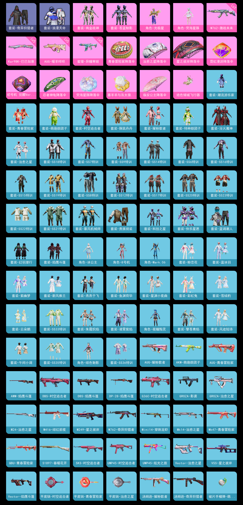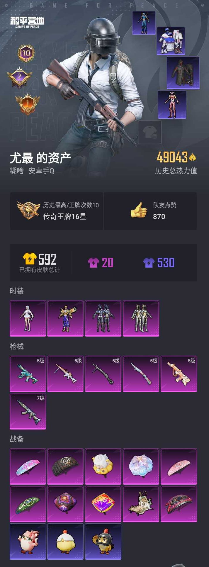 【和平精英】【lyhp21490】4粉装,6特效呛,0载具,历史最高段位:传奇王牌16星 王牌印记10次 热力值:49043,132套装,162呛械,199装备,79战备;套装:套装-苍蓝魅影,套装-绚金战神,角色-光极星,角色-荧海星豚,套装-特训学院,套装-猎鹰,套装-青年教官,套装-橘黑制服,套装-红色运动,套装-黄色运动,套装-蓝色运动,套装-黄色伏地魔,套装-白色伏地魔,套装-黑色伏地魔,套装-骑行爱好者,套装-竞技名士,套装-深蓝色名流,套装-酒红色名流,套装-湖蓝色名流,套装-黄色名流,套装-猛禽,套装-长空猛禽,套装-竞技勇士朋克,套装-蓝色守护者,套装-海岛探路者,套装-冷焰舞者,套装-灼焰舞者,套装-浪漫天命,套装-特战装甲,套装-浪漫假日,套装-贵族骑装,套装-战地督导,套装-特殊使命,套装-青春校园,套装-完美偶像,套装-人气偶像,套装-幻影武者,套装-街头潮人,套装-暗金炫舞,套装-蓝彩潮人,套装-魅力单车,套装-绮丽涂鸦,套装-竞技达人朋克,套装-破晓战魂,套装-都市魅力,套装-幻世战舞者,套装-奇异狩猎者,套装-蓝调潮人,套装-甜蜜熊情侣,套装-青涩时光,套装-缤纷果语,套装-滨海厨神,套装-元素星魂,套装-极速红龙,套装-破蛋小黄鸡,套装-浴火魔神,套装-北国孤狼,套装-ss6特训,套装-跃动心情,套装-ss7特训,套装-ss8特训,套装-ss9特训,套装-白糯汤圆,套装-青春冒险家,套装-潮流游乐家,套装-萌趣颜团子,套装-特种颜团子,套装-战术大师,套装-ss12特训,套装-ss18特训,套装-耀粉歌者,套装-治愈之星,套装-科技之星,套装-ss14特训,套装-吉莉礼服,套装-快乐星愿,套装-ss15特训,套装-ss16特训,套装-暴风机械师,套装-时空追击者,套装-ss17特训,套装-福星高照,套装-豚鼠丹丹,套装-虎虎生威吉莉,套装-ss19特训,套装-ss20特训,套装-ss21特训,套装-ss22特训,套装-光之冒险,套装-ss23特训,套装-王牌教练,套装-龙的传人,套装-云魄琉璃,套装-焰鹰斗篷,套装-幻羽潜行,套装-幽幻花璃,玩偶服-卖崽青蛙,角色-冰公主,套装-新风雅兰,角色-8号机,角色-mark.06,角色-绯色魅影,套装-异域银装,角色-夜瞳黯灵,套装-小鸟芋圆,套装-ss31特训,套装-鱼渊荷华,套装-燕燕于飞,角色-风玲,套装-紫幽梦,套装-粉恋花,套装-ss33特训,套装-云朵鹅,套装-ss32特训,套装-彩虹兔,套装-蓝冰羽,套装-顶瓜瓜,套装-雪绒豹,套装-大橘大利,套装-星渊小夜曲,套装-元气之梦,套装-ss34特训,套装-擎苍青焰,套装-朱霞炽焰,套装-游乐,套装-凌霄紫焰,套装-薄荷星砂,套装-ss35特训,套装-午间小调,套装-风迹短诗,套装-ss36特训,套装-萌鸡速递;呛皮:q-彩虹符号,q-乌木金纹,5级蜜獾-异瞳寒姬,蜜獾-天降萌叽,蜜獾-风迹短诗,蜜獾-绿洲时空,蜜獾-乌木金纹,m16a4-幻世战舞者,m16a4-冰河战士,m416-蓝色火焰,m416-绯红前夜,m416-红色方程式,m416-魔童闹海 敖闰,mk47-青春冒险家,mk47-乌木金纹,mk47-风迹短诗,scar-l-红色方程式,scar-l-夜灯,scar-l-彩虹符号,scar-l-海盐豹豹,famas-霓彩脉冲,famas-乌木金纹,akm-灼热熔岩,akm-生命誓言,akm-破晓战魂,akm-霓虹街区,akm-涂鸦街区,akm-萌趣颜团子,akm-虎虎生威,akm-龙的传人,akm-霓彩脉冲,g36c-时空追击者,g36c-乌木金纹,7级m762-激战未来,m762-奇异狩猎者,m762-天降萌叽,m762-云朵鹅,groza-影袭,groza-治愈之星,groza-乌木金纹,5级aug-暖羊咩咩,aug-耀粉歌者,aug-青春冒险家,aug-天降萌叽,aug-异域银装,aug-紫晶流影,ace32-冰晶雪宝,arx-凌霄紫焰,m24-治愈之星,m24-乌木金纹,svd-云朵鹅,svd-霓彩脉冲,m200-乌木金纹,awm-焰鹰斗篷,amr-鸡智如我,amr-乌木金纹,5级kar98k-巳巳如意,kar98k-乌木金纹,莫辛纳甘-乌木金纹,莫辛纳甘-风迹短诗,win94-乌木金纹,sks-夜灯,sks-炫彩节奏,sks-时空追击者,sks-霓虹漫游,mk20-h-狂鲨锋刃,slr-霓彩脉冲,mini14-穿刺龙虾,mini14-炫彩节奏,mini14-鸡智如我,vss-星之彼岸,mk12-风迹短诗,mk12-乌木金纹,mk14-治愈之星,mk14-乌木金纹,mk14-冰河战士,mk14-紫幽梦,mk14-薄荷星砂,m417-玩趣呆呆,qbu-青春冒险家,vect-生命誓言,vect-治愈之星,vect-焰鹰斗篷,vect-燕燕于飞,vect-乌木金纹,uzi-逆行者qq,uzi-炫彩节奏,uzi-冰河战士,uzi-啾咪啾咪,uzi-炫彩糖果,p90-玩趣呆呆,p90-乌木金纹,ump45-夜灯,ump45-蓝色火焰,ump45-生命誓言,ump45-时空追击者,ump45-炫光之旅,ump45-海盐豹豹,ump45-圣穹绘梦,ump45-绿洲时空,汤姆逊-奇异狩猎者,汤姆逊-耀粉歌者,汤姆逊-天降萌叽,汤姆逊-乌木金纹,aks-74u-鸡智如我,aks-74u-乌木金纹,野牛-夜灯,野牛-青春冒险家,野牛-燕燕于飞,野牛-乌木金纹,mp5k-乌木金纹,js9-凌霄紫焰,spas-12-燕燕于飞,spas-12-狂鲨锋刃,spas-12-云朵鹅,dbs-时空追击者,dbs-焰鹰斗篷,dbs-风迹短诗,dbs-乌木金纹,s686-生命誓言,s12k-破晓战魂,s12k-夜灯,s12k-幻世战舞者,s12k-玩趣呆呆,s12k-霓彩脉冲,s1897-春暖花开,s1897-紫幽梦,s1897-乌木金纹,pkm-紫幽梦,5级mg-36-沧焰双生,mg-36-凌霄紫焰,mg-36-薄荷星砂,mg3-幻世战舞者,mg3-霓彩脉冲,5级dp-28-豹影疾电,dp-28-焰鹰斗篷,m249-星之彼岸,m249-乌木金纹,p92-紫幽梦,p92-凌霄紫焰,r45-幻彩电音,短管霰弹-星穹咏叹调,tmp-9-萌萌史莱姆,蝎式手呛-燕燕于飞,沙墨之鹦-云朵鹅,大砍刀-云朵鹅,平底锅-治愈之星,平底锅-青春冒险家,平底锅-时空追击者,平底锅-焰鹰斗篷,平底锅-紫幽梦,平底锅-属我最6,平底锅-凌霄紫焰,撬棍-朗基努斯之呛,破片手留单-萌趣颜团子,破片手留单-海盐豹豹,破片手留单-拽到爆炸,十子怒-燕燕于飞,十子怒-异域银装,盐雾蛋-咒蚀之裁,盐雾蛋-冰氧夏日,爆炸猎弓-喜羊羊与灰太狼;降落伞:绝色倾城飞行器,红色滑翔尾迹,异域
