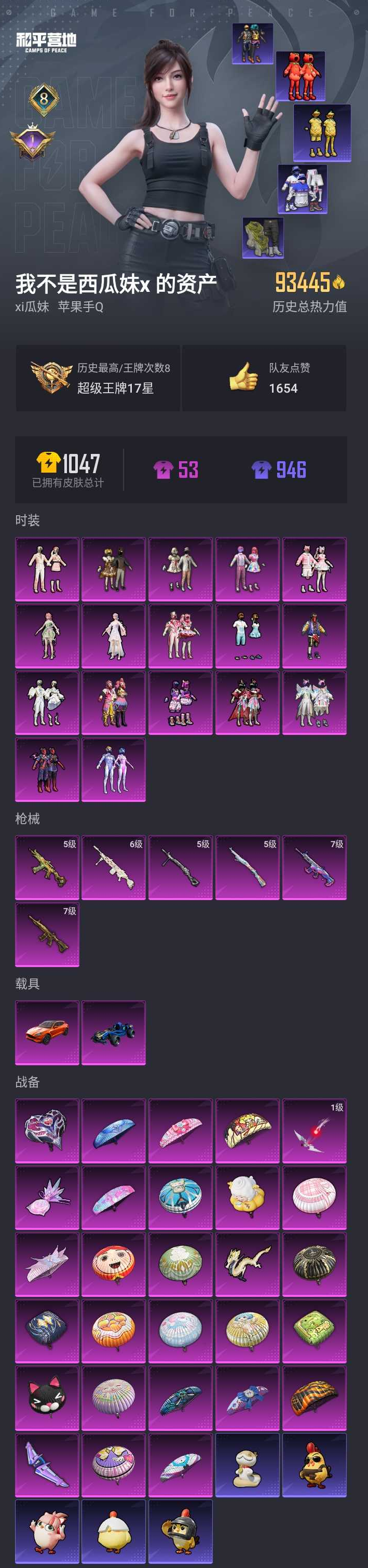 【和平精英】【lyhp21492】17粉装,6特效呛,2载具,历史最高段位:超级王牌17星 王牌印记8次 热力值:93445,203套装,262呛械,378装备,175战备;套装:套装-甜心巧克力,套装-宝贝奶油派,套装-天使彩虹糖,套装-梦幻火箭,套装-缤纷油彩,套装-天禅智恒,套装-馨动时刻,套装-山涧鹿灵,套装-星之彼岸,套装-花影阑珊,套装-蓝莓炮弹,套装-寒光使者,套装-彩虹甜喵,套装-第五大道,套装-仲夏莫吉托,角色-烟云彩露,角色-花灵,套装-黄色运动,套装-蓝色运动,套装-黄色伏地魔,套装-白色伏地魔,套装-黑色伏地魔,套装-竞技名士,套装-猛禽,套装-长空猛禽,套装-漫步者,套装-蓝色守护者,套装-冷焰舞者,套装-灼焰舞者,套装-浪漫天命,套装-特战装甲,套装-贵族骑装,套装-战地督导,套装-灰色格斗者,套装-甜蜜告白,套装-迎春赐吉,套装-龙腾端午,套装-燃烧卡路里,套装-滨海假日,套装-人气偶像,套装-幻影武者,套装-街头潮人,套装-蓝彩潮人,套装-酷萌兔限定,套装-千禧之恋,套装-怒火燎原,套装-魅力单车,套装-绮丽涂鸦,套装-金羽特工,套装-狂沙舞者,套装-破晓战魂,套装-都市魅力,套装-热血青春,套装-幻世战舞者,套装-奇异狩猎者,套装-金耀舞者,套装-蓝调潮人,套装-迅捷狂鲨,套装-呆萌铁蟹,套装-深海小丑鱼,套装-甜蜜熊情侣,套装-青涩时光,套装-龙魂突击队,套装-冰川特警,套装-元素星魂,套装-胖达圆圆,套装-麻辣教官,套装-万圣娃娃,套装-粉红小猪,套装-破蛋小黄鸡,套装-疯狂小兔子,套装-红酒骑士,套装-浪漫波比,套装-霓虹街区,套装-暗夜契约,套装-智慧之神,套装-大橘为重,套装-萌黄之夏,套装-海洋之心,套装-夏日音浪,套装-抹茶蜜豆,套装-安第斯皇冠,套装-探宝勇士,套装-牛气满满,套装-白糯汤圆,套装-梦之呓语,套装-ss11特训,套装-青春冒险家,套装-潮流游乐家,套装-原初圣火,套装-逆风勇士,套装-萌趣颜团子,套装-特种颜团子,套装-ss12特训,套装-牛气冲天,套装-ss18特训,套装-耀粉歌者,套装-飞行日记,套装-ss13特训,套装-光影梦想家,套装-热情海星,套装-纯真浪花,套装-ss14特训,角色-捷德奥特曼,套装-吉莉礼服,套装-微雨春柳,套装-星梦畅游,套装-ss15特训,套装-ss16特训,套装-暴风机械师,套装-时空追击者,套装-暗夜魅影,套装-ss17特训,套装-醒狮腾龙,套装-瑞龙福将,套装-团圆交子,套装-福星高照,套装-遗落祭司,套装-豚鼠丹丹,套装-虎虎生威吉莉,套装-异彩先驱,套装-霓虹极客,套装-空投萌叽,套装-ss19特训,套装-兔兔白日梦,套装-沁蓝冰爽,套装-飞驰魅影,套装-音速流光,套装-炫蓝之夏,套装-ss20特训,套装-粉团憨憨,套装-猎梦纪元,套装-甜心亚梦,套装-虚音幻奏,套装-ss21特训,套装-萌趣咩咩,套装-娇憨猪猪,套装-红熊茄茄,套装-俏皮奶喵,套装-暖心橘喵,套装-玉兔迎春,套装-ss22特训,套装-和煦暖阳,套装-田园牧歌,套装-轻风白浪,套装-光之冒险,套装-绯格组合,套装-ss23特训,套装-摩登艾咪,套装-莱茵河畔,套装-香榭午后,套装-糯粉咩咩,套装-王牌教练,套装-ss24特训,套装-绚紫流光,套装-ss25特训,套装-惊鸿侠骨,套装-锦衣飞扬,套装-绝对偶像,套装-元气发射,套装-果汁能量,套装-龙的传人,套装-冰河战士,套装-空岛之星,套装-无暇誓言,套装-云魄琉璃,套装-ss28特训,角色-冰公主,套装-街头风暴,套装-海盐绵绵冰,套装-湖畔霞光,套装-ss29特训,角色-紫俏灵猫,套装-异域银装,套装-星途旅人,套装-ss30特训,套装-ss31特训,套装-智谋强哥,套装-青翼流星,套装-狂鲨锋刃,套装-炫彩糖果,套装-元气之梦,套装-ss34特训,套装-擎苍青焰,套装-朱霞炽焰,套装-凌霄紫焰,角色-敖闰,套装-薄荷星砂,套装-ss35特训,套装-午间小调,套装-秘语星愿,套装-风迹短诗,套装-琴音绮想,套装-粉黛兰香,角色-超感刻度,套装-画境星梦,套装-书海巡游,套装-阳光菠萝,套装-ss37特训,套装-ss36特训,角色-紫霄电母,套装-雪国风尚,套装-萌鸡速递;呛皮:蜜獾-娇憨猪猪,蜜獾-天降萌叽,蜜獾-风迹短诗,q-潮汐统领,q-原初圣火,q-彩虹符号,q-洛神天依,q-飞驰魅影,q-未来歌姬,q-纯真浪花,q-乌木金纹,mk47-青春冒险家,mk47-乌木金纹,mk47-风迹短诗,akm-缤纷海域,akm-四圣焕新,akm-涂鸦街区,akm-彩虹符号,akm-萌趣颜团子,akm-虎虎生威,akm-龙的传人,akm-霓彩脉冲,akm-乌木金纹,ac-val-甜心亚梦,ac-val-乌木金纹,ac-val-彩虹甜喵,ac-val-天降萌叽,ac-val-霁蓝缠春,aug-耀粉歌者,aug-青春冒险家,aug-圣光天使,aug-异域银装,aug-冰晶雪宝,7级m416-五爪金龙,m416-蓝色火焰,m416-绯红前夜,m416-仓鼠灰灰,m416-神秘黑猫,m416-糯团青竹,groza-影袭,groza-彩虹符号,groza-异彩先驱,groza-恐龙拽拽,groza-田园牧歌,groza-暮色玫影,7级scar-l-机甲封神,scar-l-红色方程式,scar-l-炫彩节奏,scar-l-彩虹符号,scar-l-玉兔迎春,scar-l-星途旅人,scar-l-海盐豹豹,scar-l-绿洲时空,m16a4-蓝色火焰,m16a4-甜心亚梦,m16a4-幻世战舞者,m16a4-冰河战士,m762-绯红前夜,m762-甜心宝贝,m762-深海曼妙,m762-牛气冲天,m762-瑞龙福将,m762-橘柚倾心,m762-彩虹甜喵,m762-第五大道,arx-凌霄紫焰,arx-回旋牧梦使,ace32-画境星梦,ace32-冰晶雪宝,g36c-时空追击者,g36c-乌木金纹,famas-霓彩脉冲,5级kar98k-巳巳如意,kar98k-王子的夏天,kar98k-马卡龙,kar98k-炫彩节奏,kar98k-洛神天依,kar98k-飞驰魅影,kar98k-乌木金纹,莫辛纳甘-乌木金纹,莫辛纳甘-风迹短诗,awm-恐龙拽拽,awm-纯真浪花,awm-暮色玫影,awm-乌木金纹,awm-绿洲时空,win94-瑞龙福将,win94-乌木金纹,m24-奇异狩猎者,m24-炫彩节奏,m24-乌木金纹,m200-惊鸿侠骨,m200-罪夜之冕