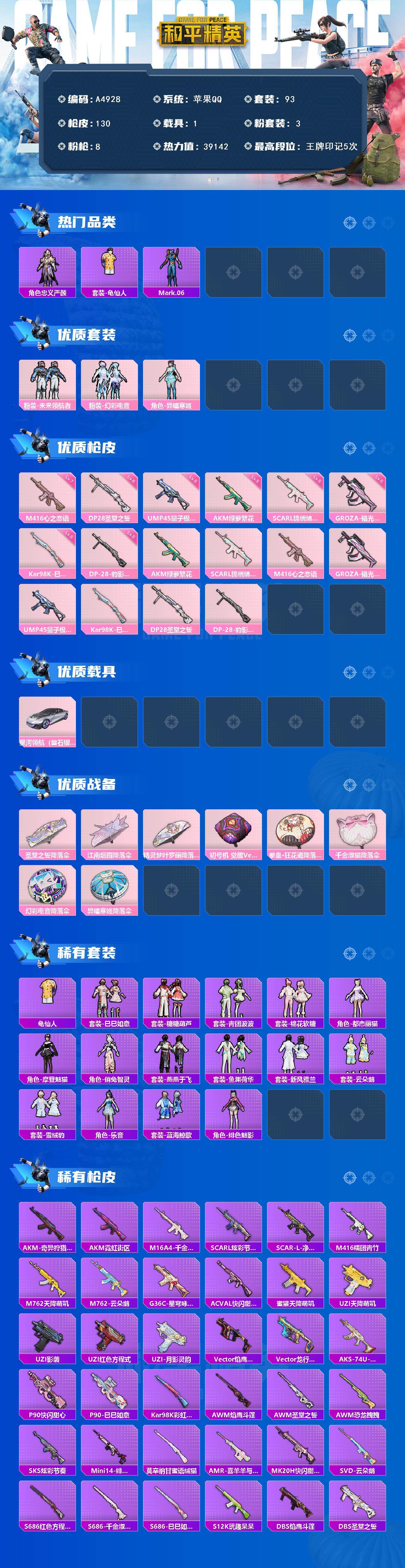 [16389106]苹果 【男神号 忠义严颜/龟仙人/mark.06/m416-心之恋语七级/星河领航(磐石银)】手q-3粉装-8特效呛-1载具-2粉色飞行器-39142热力值-5王牌印记-93套装-130呛皮 【热门品类】:角色-忠义严颜,套装-龟仙人,角色-mark.06 【粉色套装】:粉装-未来领航者,粉装-幻彩电音,角色-异瞳寒姬 【粉色呛皮等级】:akm-绿萝繁花五级,scar-l-锦绣绵绵五级,m416-心之恋语七级,groza-镜光银凌五级,ump45-量子极限五级,kar98k-巳巳如意五级,dp-28-圣堂之誓六级,dp-28-豹影疾电五级 【粉色载具】:星河领航(磐石银) 【粉色呛皮】:akm-绿萝繁花,scar-l-锦绣绵绵,m416-心之恋语,groza-镜光银凌,ump45-量子极限,kar98k-巳巳如意,dp-28-圣堂之誓,dp-28-豹影疾电 【粉色降落伞】:圣堂之誓降落伞,江南烟雨降落伞,精灵梦叶罗丽降落伞,初号机 觉醒ver.降落伞,拳皇·狂花道降落伞,千金淑猫降落伞,幻彩电音降落伞,异瞳寒姬降落伞,炫彩糖果降落伞 【稀有套装】:套装-龟仙人,套装-巳巳如意,套装-雪国风尚,套装-糖糖葫芦,套装-青团波波,套装-棉花软糖,角色-都市丽猫,角色-摩登魅猫,角色-俏兔智灵,套装-燕燕于飞,套装-鱼渊荷华,套装-新风雅兰,套装-云朵鹅,套装-雪绒豹,角色-乐音,套装-蓝海鲸歌,角色-绯色魅影 【稀有呛皮】:akm-奇异狩猎者,akm-霓虹街区,m16a4-千金淑猫,scar-l-炫彩节奏,scar-l-净心行者,m416-糯团青竹,m762-天降萌叽,m762-云朵鹅,g36c-星穹咏叹调,ac-val-快闪甜心,蜜獾-天降萌叽,uzi-天降萌叽,uzi-影袭,uzi-红色方程式,uzi-月影灵韵,vect-焰鹰斗篷,vect-龙行天下,aks-74u-鬼刀,p90-快闪甜心,p90-巳巳如意,kar98k-彩虹符号,awm-焰鹰斗篷,awm-圣堂之誓,awm-恐龙拽拽,sks-炫彩节奏,mini14-绯穹魔姬,莫辛纳甘-蜜语绒猫,amr-喜羊羊与灰太狼,mk20-h-快闪甜心,svd-云朵鹅,s686-红色方程式,s686-巳巳如意,s686-千金淑猫,s12k-玩趣呆呆,dbs-焰鹰斗篷,dbs-圣堂之誓