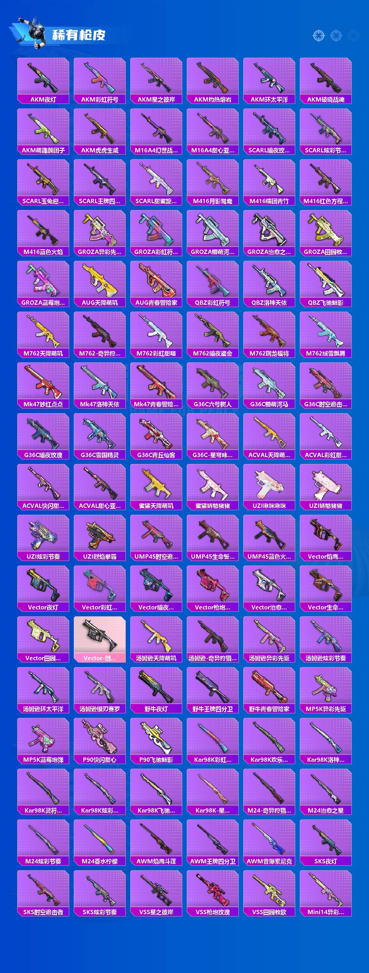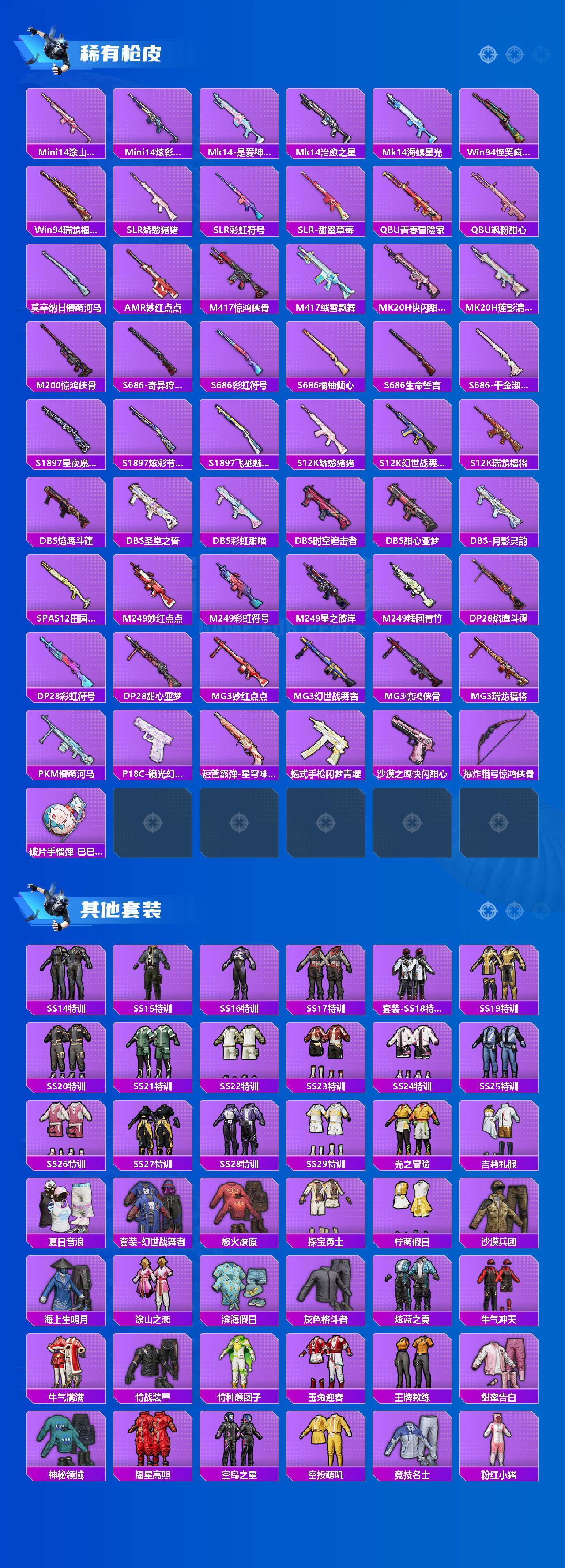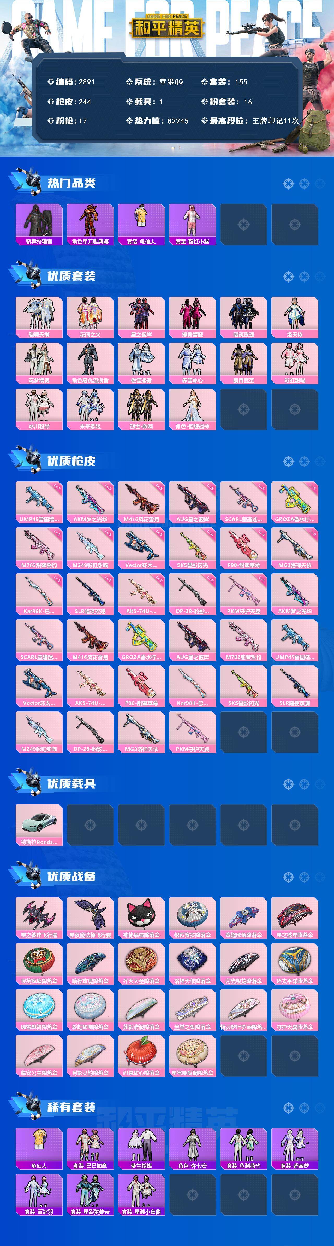 1载具-155套装-244呛皮-155套装/呛械17/装备277/载具1/战备156/王牌印记11/热力值82245/五级akm-梦之光华/五级scar-l-童趣迷兔/五级m416-风花雪月/五级groza-香水柠檬/五级aug-星之彼岸/五级m762-甜蜜誓约/七级ump45-雪国精灵/五级vect-环太平洋/二级aks-74u-星穹咏叹调/四级p90-甜蜜草莓/三级kar98k-巳巳如意/四级sks-碧影闪光/二级s