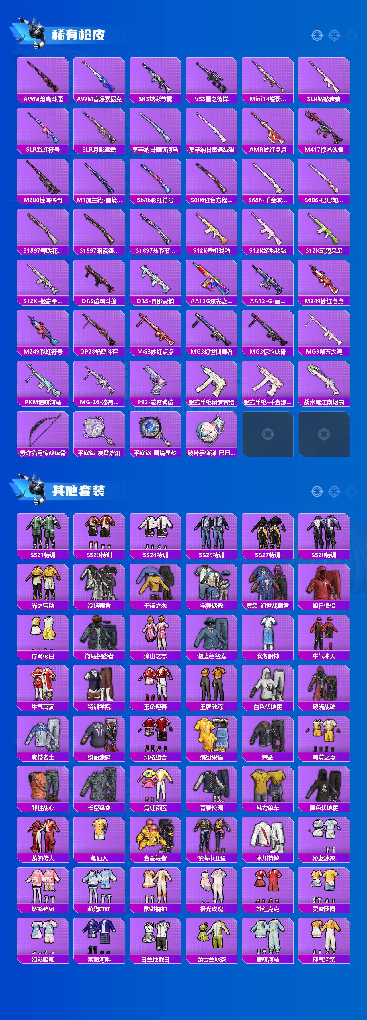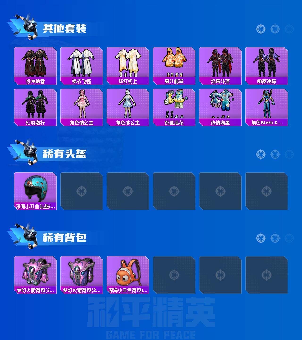 0载具-110套装-176呛皮-110套装/呛械6/装备238/战备109/王牌印记9/热力值50473/五级m416-电玩时刻/五级kar98k-巳巳如意/七级mk12-雪月幻音/dp-28-千金淑猫/五级dp-28-豹影疾电/七级平底锅-仲夏莫吉托/深海小丑鱼/套装-龟仙人/角色-mark.06/彩虹甜喵/飒粉甜心/烟云彩露/角色-智耀战神/角色-绯穹魔姬/m416-电玩时刻/kar98k-巳巳如意/mk12-雪月幻音/