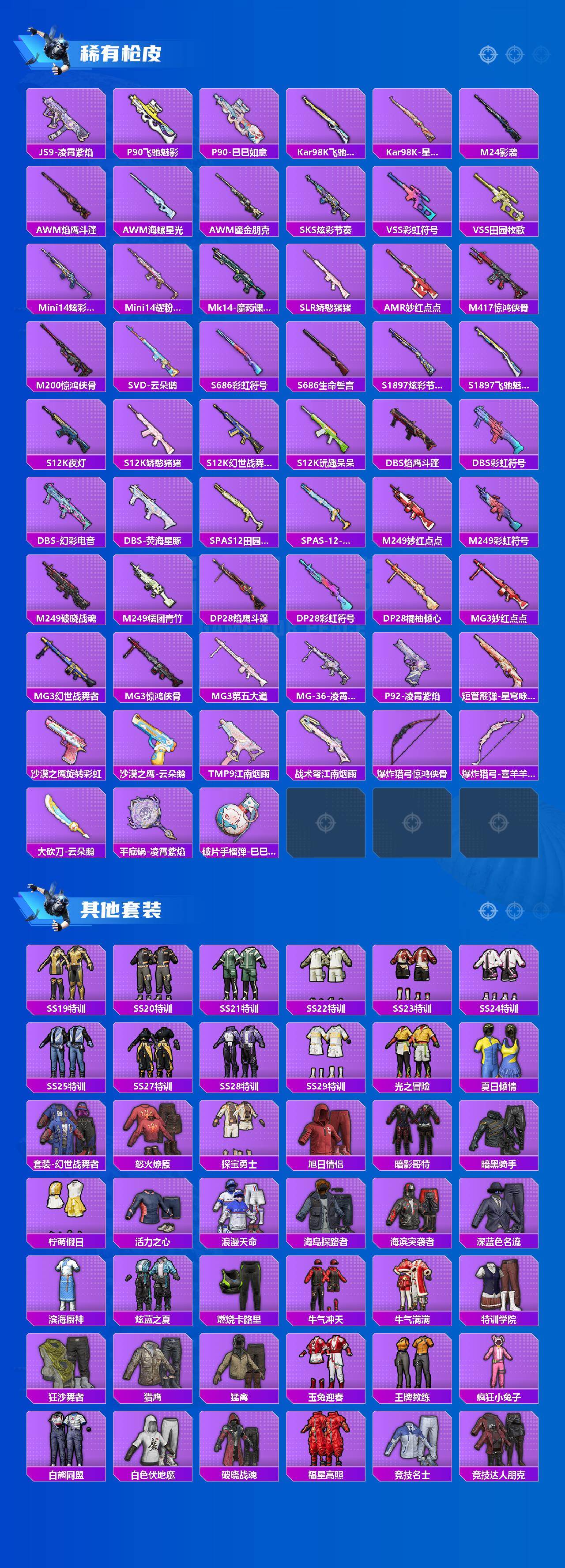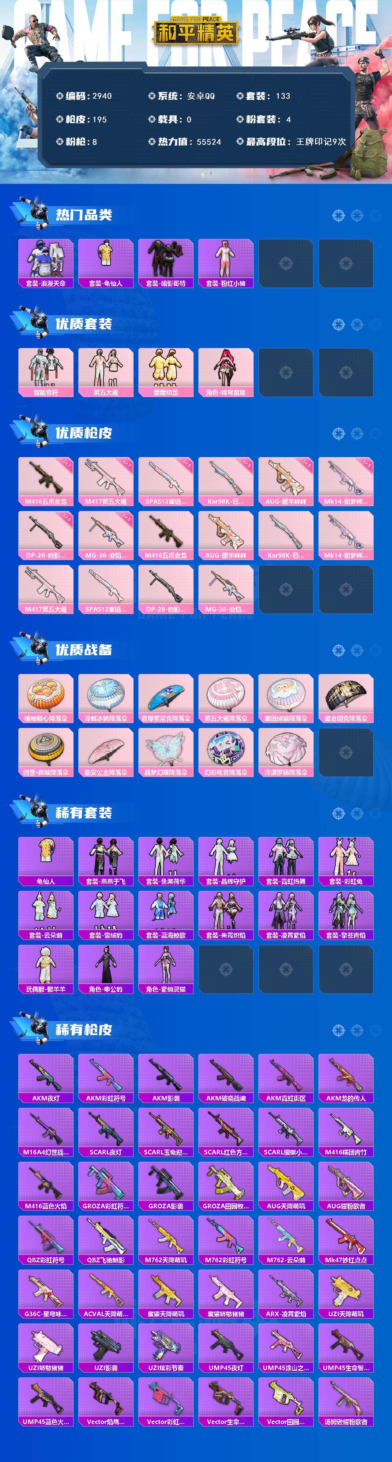 0载具-133套装-195呛皮-133套装/呛械8/装备202/战备122/王牌印记9/热力值55524/七级m416-五爪金龙/五级aug-暖羊咩咩/五级kar98k-巳巳如意/五级mk14-甜梦熊击/七级m417-第五大道/五级spas-12-蜜语绒猫/五级dp-28-豹影疾电/五级mg-36-沧焰双生/套装-浪漫天命/套装-龟仙人/套装-暗影哥特/套装-粉红小猪/智能音符/第五大道/暖暖奶龙/角色-绯穹魔姬/m416-