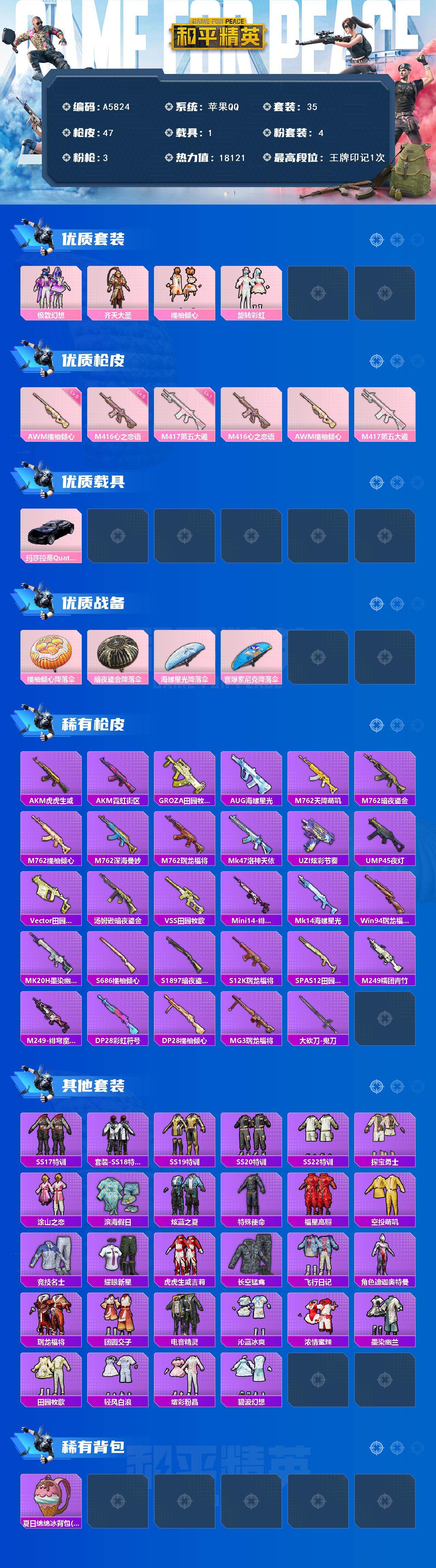 [16427808]苹果【小号 m416-心之恋语五级/极致幻想/齐天大圣】 手q-4粉装-3特效呛-1载具-0粉色飞行器-18121热力值-1王牌印记-35套装-47呛皮 【粉色套装】:粉装-极致幻想,粉装-齐天大圣,粉装-橘柚倾心,粉装-旋转彩虹 【粉色呛皮等级】:m416-心之恋语五级,awm-橘柚倾心五级,m417-第五大道一级 【粉色载具】:玛莎拉蒂quattropte(夜幕蓝) 【粉色呛皮】:m416-心之恋语,awm-橘柚倾心,m417-第五大道 【粉色降落伞】:橘柚倾心降落伞,暗夜鎏金降落伞,海螺星光降落伞,音爆索尼克降落伞 【稀有呛皮】:akm-虎虎生威,akm-霓虹街区,groza-田园牧歌,aug-海螺星光,m762-天降萌叽,m762-暗夜鎏金,m762-橘柚倾心,m762-深海曼妙,m762-瑞龙福将,mk47-洛神天依,uzi-炫彩节奏,ump45-夜灯,vect-田园牧歌,汤姆逊-暗夜鎏金,vss-田园牧歌,mini14-绯穹魔姬,mk14-海螺星光,win94-瑞龙福将,mk20-h-墨染幽兰,s686-橘柚倾心,s1897-暗夜鎏金,s12k-瑞龙福将,spas-12-田园牧歌,m249-糯团青竹,m249-绯穹魔姬,dp-28-彩虹符号,dp-28-橘柚倾心,mg3-瑞龙福将,大砍刀-鬼刀 【其他套装】:套装-ss17特训,套装-ss18特训,套装-ss19特训,套装-ss20特训,套装-ss22特训,套装-探宝勇士,套装-涂山之恋,套装-滨海假日,套装-炫蓝之夏,套装-特殊使命,套装-福星高照,套装-空投萌叽,套装-竞技名士,套装-耀眼新星,套装-虎虎生威吉莉,套装-长空猛禽,套装-飞行日记,角色-迪迦奥特曼,套装-瑞龙福将,套装-团圆交子,套装-电音精灵,套装-沁蓝冰爽,套装-浓情蜜辣,套装-墨染幽兰,套装-田园牧歌,套装-轻风白浪,套装-熠彩粉晶,套装-碧波幻想 【稀有背包】:夏日绵绵冰背包2级 【营地id】:776827386