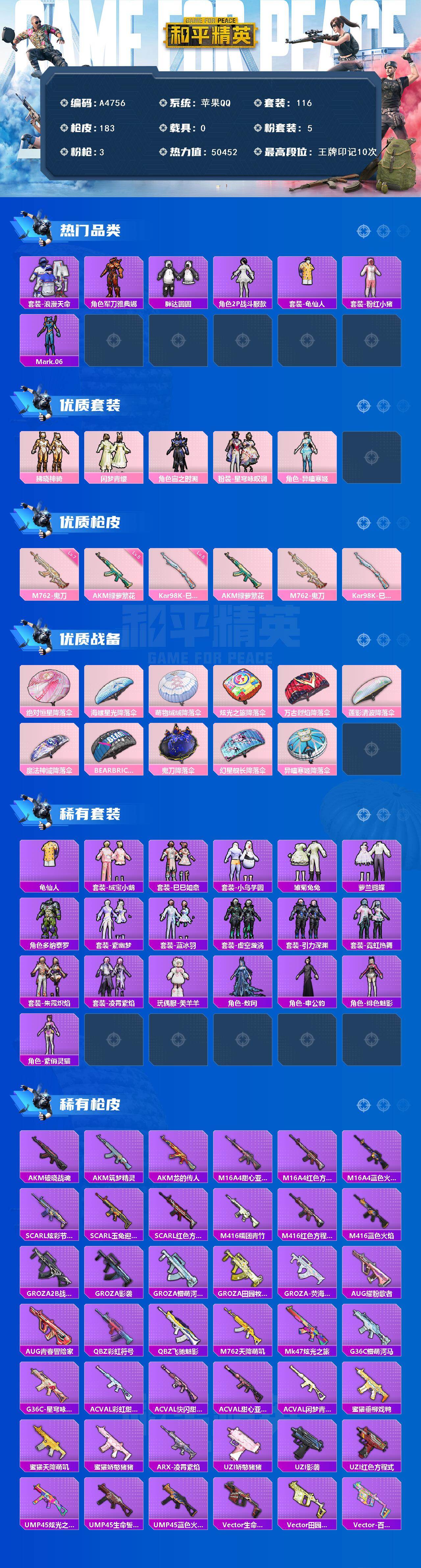 [16049945]苹果 【身法号 军刀雅典娜/浪漫天命/胖达圆圆/2p战斗服款/mark.06/akm-绿萝繁花五级】手q-5粉装-3特效呛-0载具-0粉色飞行器-50452热力值-10王牌印记-116套装-183呛皮 【热门品类】:套装-浪漫天命,角色-军刀雅典娜,套装-胖达圆圆,角色-2p战斗服款,套装-龟仙人,套装-粉红小猪,角色-mark.06 【粉色套装】:粉装-拂晓神骑,粉装-闲梦青缨,角色-宙之时溯,粉装-星穹咏叹调,角色-异瞳寒姬 【粉色呛皮等级】:akm-绿萝繁花五级,m762-鬼刀七级,kar98k-巳巳如意五级 【粉色呛皮】:akm-绿萝繁花,m762-鬼刀,kar98k-巳巳如意 【粉色降落伞】:绝对恒星降落伞,海螺星光降落伞,萌物绒绒降落伞,炫光之旅降落伞,万古烈焰降落伞,莲影清波降落伞,魔法神域降落伞,bearbrick降落伞,鬼刀降落伞,幻星舰长降落伞,异瞳寒姬降落伞,炫彩糖果降落伞 【稀有套装】:套装-龟仙人,套装-绒宝小鹅,套装-巳巳如意,套装-小鸟芋圆,套装-雪国风尚,套装-雏菊兔兔,套装-萝兰蝴蝶,角色-多纳泰罗,套装-紫幽梦,套装-蓝冰羽,套装-虚空漩涡,套装-引力深渊,套装-霓虹热舞,套装-朱霞炽焰,套装-凌霄紫焰,玩偶服-美羊羊,角色-敖闰,角色-申公豹,角色-绯色魅影,角色-紫俏灵猫 【稀有呛皮】:akm-破晓战魂,akm-筑梦精灵,akm-龙的传人,m16a4-甜心亚梦,m16a4-红色方程式,m16a4-蓝色火焰,scar-l-炫彩节奏,scar-l-玉兔迎春,scar-l-红色方程式,m416-糯团青竹,m416-红色方程式,m416-蓝色火焰,groza-2b战斗服款,groza-影袭,groza-懵萌河马,groza-田园牧歌,groza-荧海星豚,aug-耀粉歌者,aug-青春冒险家,q-彩虹符号,q-飞驰魅影,m762-天降萌叽,mk47-炫光之旅,g36c-懵萌河马,g36c-星穹咏叹调,ac-val-彩虹甜喵,ac-val-快闪甜心,ac-val-甜心亚梦,ac-val-闲梦青缨,蜜獾-垂柳戏鸭,蜜獾-天降萌叽,蜜獾-娇憨猪猪,arx-凌霄紫焰,uzi-娇憨猪猪,uzi-影袭,uzi-红色方程式,ump45-炫光之旅,ump45-生命誓言,ump45-蓝色火焰,vect-生命誓言,vecto
