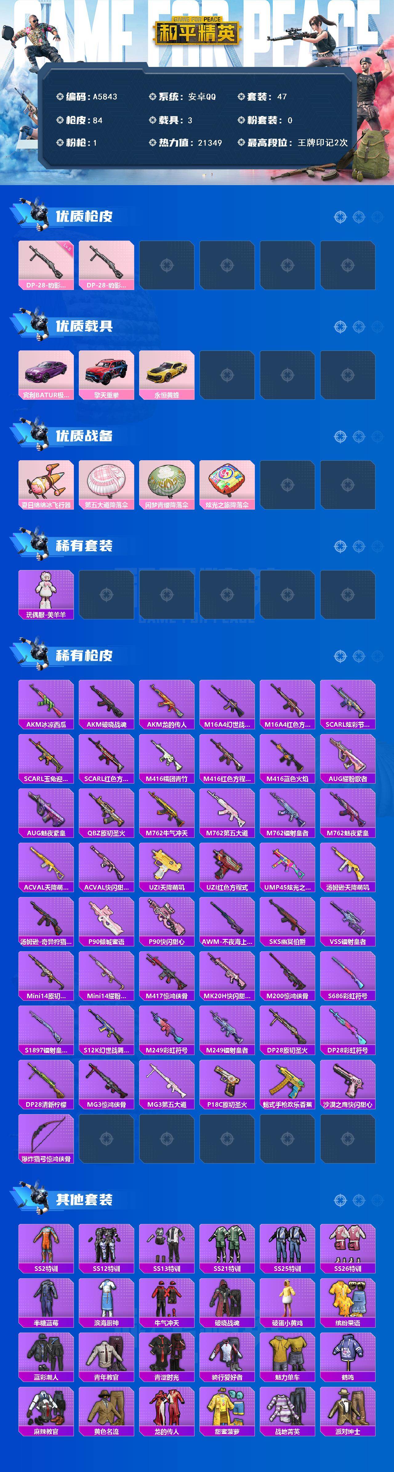 [16429318]安卓 【小号 dp-28-豹影疾电五级 宾利batur(极速紫),擎天重拳,永恒黄蜂】手q-0粉装-1特效呛-3载具-2粉色飞行器-21349热力值-2王牌印记-47套装-84呛皮 【粉色呛皮等级】:dp-28-豹影疾电五级 【粉色载具】:宾利batur(极速紫),擎天重拳,永恒黄蜂 【粉色呛皮】:dp-28-豹影疾电 【粉色飞行器】:夏日绵绵冰飞行器 【粉色降落伞】:第五大道降落伞,闲梦青缨降落伞,炫光之旅降落伞,炫彩糖果降落伞 【稀有套装】:套装-炫彩糖果,玩偶服-美羊羊 【稀有呛皮】:akm-冰凉西瓜,akm-破晓战魂,akm-龙的传人,m16a4-幻世战舞者,m16a4-红色方程式,scar-l-炫彩节奏,scar-l-玉兔迎春,scar-l-红色方程式,m416-糯团青竹,m416-红色方程式,m416-蓝色火焰,aug-耀粉歌者,aug-魅夜紫皇,q-原初圣火,m762-牛气冲天,m762-第五大道,m762-镭射皇者,m762-魅夜紫皇,ac-val-天降萌叽,ac-val-快闪甜心,uzi-天降萌叽,uzi-红色方程式,ump45-炫光之旅,汤姆逊-天降萌叽,汤姆逊-奇异狩猎者,p90-倾城蜜语,p90-快闪甜心,awm-不夜海上花,sks-幽冥伯爵,vss-镭射皇者,mini14-原初圣火,mini14-耀粉歌者,m417-惊鸿侠骨,mk20-h-快闪甜心,m200-惊鸿侠骨,s686-彩虹符号,s1897-镭射皇者,s12k-幻世战舞者,m249-彩虹符号,m249-镭射皇者,dp-28-原初圣火,dp-28-彩虹符号,dp-28-清新柠檬,mg3-惊鸿侠骨,mg3-第五大道,p18c-原初圣火,蝎式手呛-欢乐香蕉,沙墨之鹦-快闪甜心,爆炸猎弓-惊鸿侠骨 【其他套装】:套装-ss2特训,套装-ss12特训,套装-ss13特训,套装-ss21特训,套装-ss25特训,套装-ss26特训,套装-半糖蓝莓,套装-滨海厨神,套装-牛气冲天,套装-破晓战魂,套装-破蛋小黄鸡,套装-缤纷果语,套装-蓝彩潮人,套装-青年教官,套装-青涩时光,套装-骑行爱好者,套装-魅力单车,套装-鹤鸣,套装-麻辣教官,套装-黄色名流,套装-龙的传人,套装-甜蜜菠萝,套装-战地菁英,套装-派对绅士,套装-极地朋克,套装-午夜朋克,套装-弄潮海豚,套装-原初圣火,套
