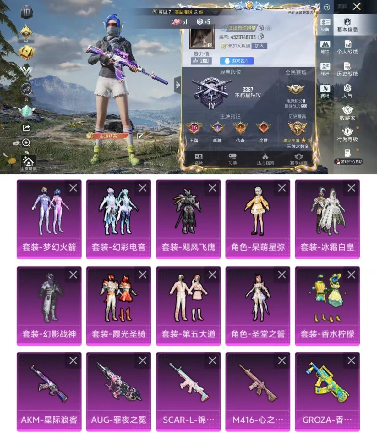 _2433768-实名:可修改时装数:810呛械数:306战备数:225热门装扮:奇异狩猎者梦幻火箭新101幻影战神呆萌铁蟹深海小丑鱼梦魇先生迅捷狂鲨鹰眼刺客都市猎人香水柠檬冰霜白皇星之彼岸飓风飞鹰洛天依霞光圣骑暗夜行者第五大道呆萌星弥暗夜魅影圣堂之誓幻彩电音稀有呛皮:m416心之恋语groza香水柠檬akm星际浪客p90能量风暴m24莲影清波akm绿萝繁花scar-l-锦绣绵绵kar98k-巳巳如意dp-28-豹影疾电aks-74u-森灵之息aug-罪夜之冕