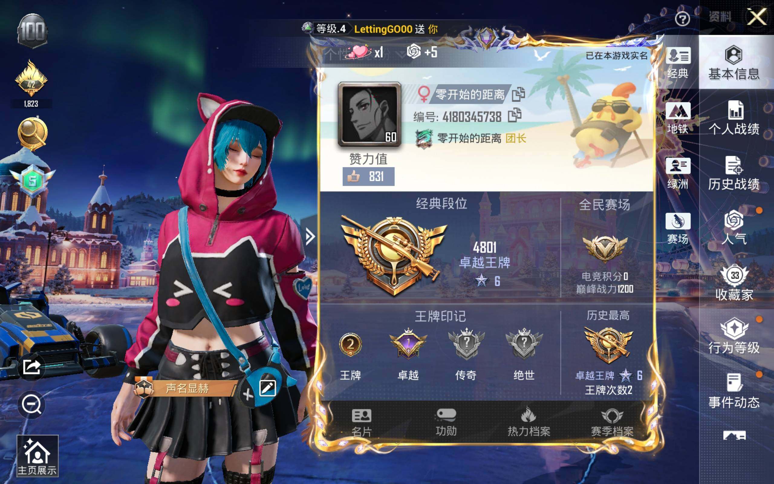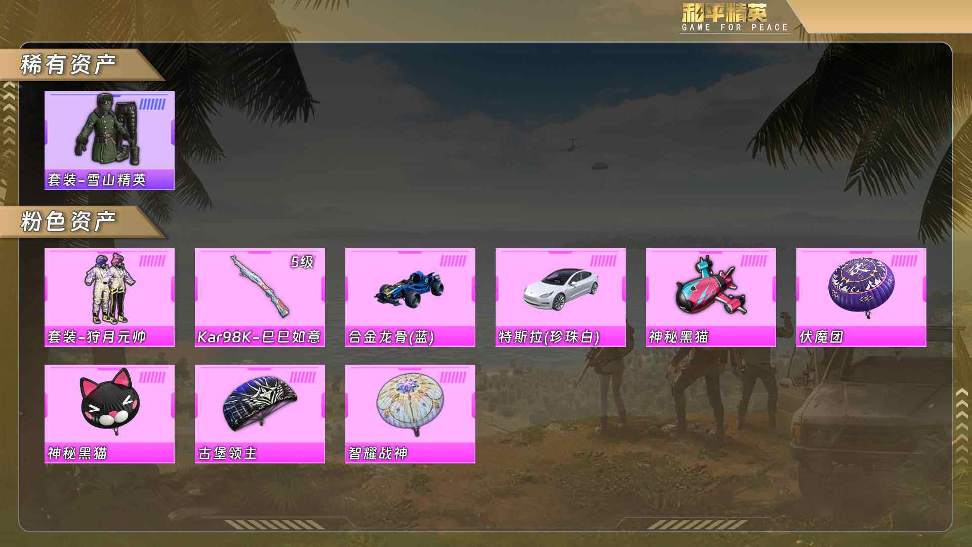(1粉套1粉呛2载具)狩月元帅/98k巳巳如意5级/合金龙骨(蓝)/特斯拉白 没战神框hp5578-1粉色飞行器-27628热力值-2王牌印记-68套装-79呛皮 【粉色套装】:粉装-狩月元帅 【粉色呛皮等级】:kar98k-巳巳如意五级 【粉色载具】:特斯拉model 3(珍珠白),合金龙骨(蓝) 【粉色呛皮】:kar98k-巳巳如意 【粉色飞行器】:神秘黑猫飞行器 【粉色降落伞】:神秘黑猫降落伞,古堡领主降落伞,伏魔团降落伞,智耀战神降落伞 【稀有套装】:套装-紫幽梦,套装-蓝冰羽,套装-星影赞美诗,角色-月烬之祷 【稀有呛皮】:akm-灼热熔岩,akm-玉龙,akm-破晓战魂,akm-虎虎生威,m16a4-机械英豪,scar-l-炫彩节奏,scar-l-红色方程式,m416-神秘黑猫,m416-绯红前夜,groza-生命誓言,aug-耀粉歌者,q-神秘黑猫,m762-牛气冲天,m762-绯红前夜,g36c-不夜海上花,ac-val-天降萌叽,uzi-古堡领主,uzi-红色方程式,ump45-生命誓言,ump45-蓝色火焰,ump45-绒宝小鹅,野牛-机械英豪,kar98k-古堡领主,kar98k-彩虹符号,kar98k-炫彩节奏,awm-不夜海上花,mini14-炫彩节奏,mini14-耀粉歌者,win94-机械英豪,qbu-不夜海上花,s686-不夜海上花,s1897-神秘黑猫,s12k-玩趣呆呆,s12k-机械英豪,s12k-智耀战神,m249-古堡领主,dp-28-彩虹符号,mg3-幻世战舞者,撬棍-冷漠罗丽 【其他套装】:套装-ss10特训,套装-ss11特训,套装-ss12特训,套装-ss13特训,套装-ss14特训,套装-ss15特训,套装-ss17特训,套装-ss18特训,套装-ss19特训,套装-ss21特训,套装-ss22特训,套装-ss28特训,套装-ss29特训,套装-冰川格斗者,套装-冷焰舞者,套装-夏日音浪,套装-怒火燎原,套装-柠萌假日,套装-橘黑制服,套装-海上生明月,套装-湖蓝色名流,套装-灰色格斗者,套装-炫蓝之夏,套装-牛气冲天,套装-牛气满满,套装-特战装甲,套装-特训学院,套装-猎鹰,套装-猛禽,套装-白色伏地魔,套装-破晓战魂,套装-破蛋小黄鸡,套装-空投萌叽,套装-竞技名士,套装-红色运动,套装-耀粉歌者,套装-萌黄之夏,套装-蓝色守护者,套装-蓝色运动,套装-长空猛禽,套装-青春校园,套装-麻辣教官,套装-黄色伏地魔,套装-黄色运动,套装-黑色伏地魔,套装-雪山精英,套装-神秘黑猫,套装-大橘为重,套装-软萌银虎,套装-白月香洋装,套装-风华少年志,套装-红酒骑士,套装-舞夜骑士,套装-机械英豪,套装-机械征服者 【稀有背包】:神秘黑猫背包3级,神秘黑猫背包2级,神秘黑猫背包1级,古堡领主背包3级,古堡领主背包2级 【营地id】:735849762