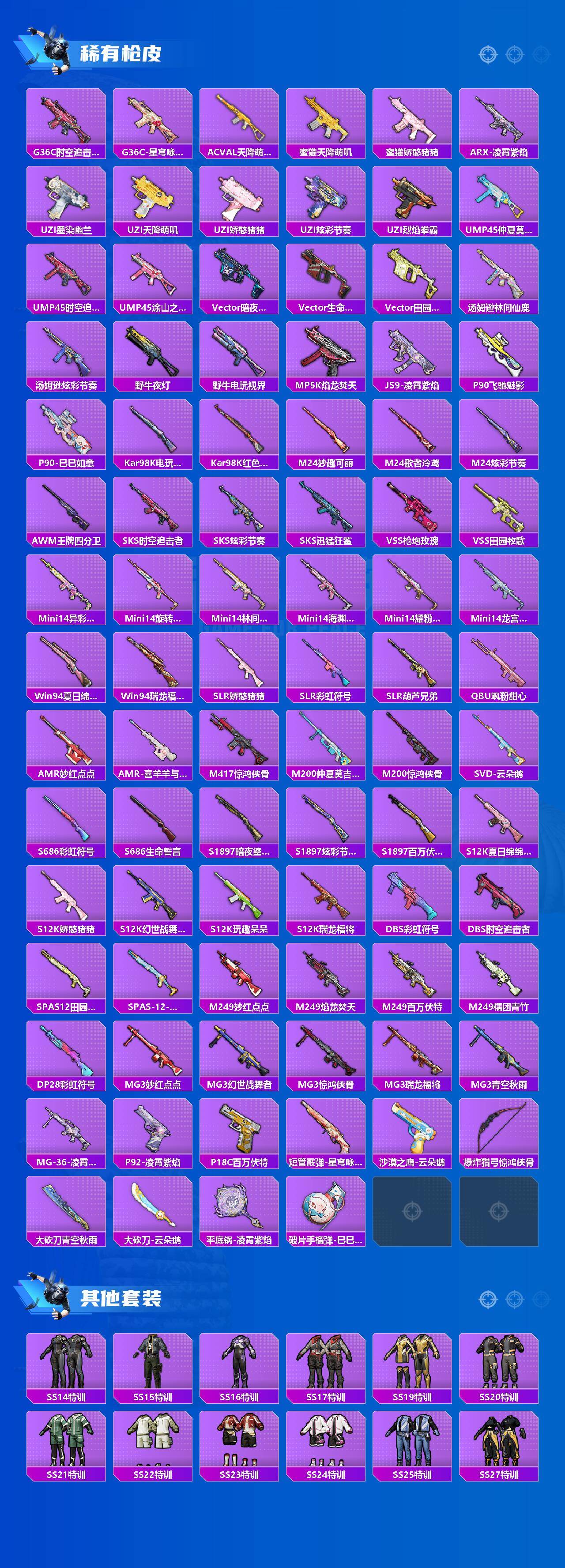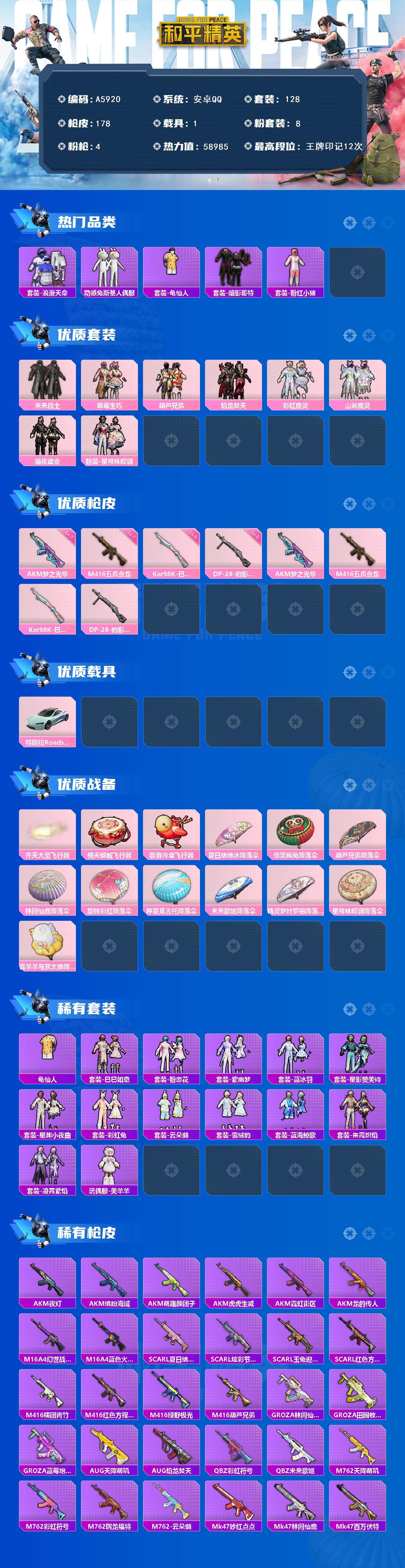 [16471679]安卓【呛皮号 m416-五爪金龙七级/akm-梦之光华七级/浪漫天命/暗影哥特/百万伏特背包】 手q-8粉装-4特效呛-1载具-3粉色飞行器-58985热力值-12王牌印记-128套装-178呛皮 【热门品类】:套装-浪漫天命,套装-动感兔斯基人偶服,套装-龟仙人,套装-暗影哥特,套装-粉红小猪 【粉色套装】:粉装-未来战士,粉装-草莓生巧,粉装-葫芦兄弟,粉装-焰龙焚天,粉装-彩虹鹿灵,粉装-山涧鹿灵,粉装-暗夜鎏金,粉装-星穹咏叹调 【粉色呛皮等级】:akm-梦之光华七级,m416-五爪金龙七级,kar98k-巳巳如意五级,dp-28-豹影疾电五级 【粉色载具】:特斯拉roadster(水滴蓝) 【粉色呛皮】:akm-梦之光华,m416-五爪金龙,kar98k-巳巳如意,dp-28-豹影疾电 【粉色飞行器】:齐天大圣飞行器,桃夭倾城飞行器,歌者泠鸢飞行器 【粉色降落伞】:夏日绵绵冰降落伞,怪笑疯兔降落伞,葫芦兄弟降落伞,林间仙鹿降落伞,旋转彩虹降落伞,仲夏莫吉托降落伞,未来歌姬降落伞,精灵梦叶罗丽降落伞,星穹咏叹调降落伞,喜羊羊与灰太狼降落伞 【稀有套装】:套装-龟仙人,套装-巳巳如意,套装-粉恋花,套装-紫幽梦,套装-蓝冰羽,套装-星影赞美诗,套装-星渊小夜曲,套装-彩虹兔,套装-云朵鹅,套装-雪绒豹,套装-蓝海鲸歌,套装-朱霞炽焰,套装-凌霄紫焰,玩偶服-美羊羊 【稀有呛皮】:akm-夜灯,akm-缤纷海域,akm-萌趣颜团子,akm-虎虎生威,akm-霓虹街区,akm-龙的传人,m16a4-幻世战舞者,m16a4-蓝色火焰,scar-l-夏日绵绵冰,scar-l-炫彩节奏,scar-l-玉兔迎春,scar-l-红色方程式,m416-糯团青竹,m416-红色方程式,m416-绿野极光,m416-葫芦兄弟,groza-林间仙鹿,groza-田园牧歌,groza-蓝莓炮弹,aug-天降萌叽,aug-焰龙焚天,q-彩虹符号,q-未来歌姬,m762-天降萌叽,m762-彩虹符号,m762-瑞龙福将,m762-云朵鹅,mk47-妙红点点,mk47-林间仙鹿,mk47-百万伏特,g36c-时空追击者,g36c-星穹咏叹调,ac-val-天降萌叽,蜜獾-天降萌叽,蜜獾-娇憨猪猪,arx-凌霄紫焰,uzi-墨染幽兰,uzi-天降萌叽,uzi