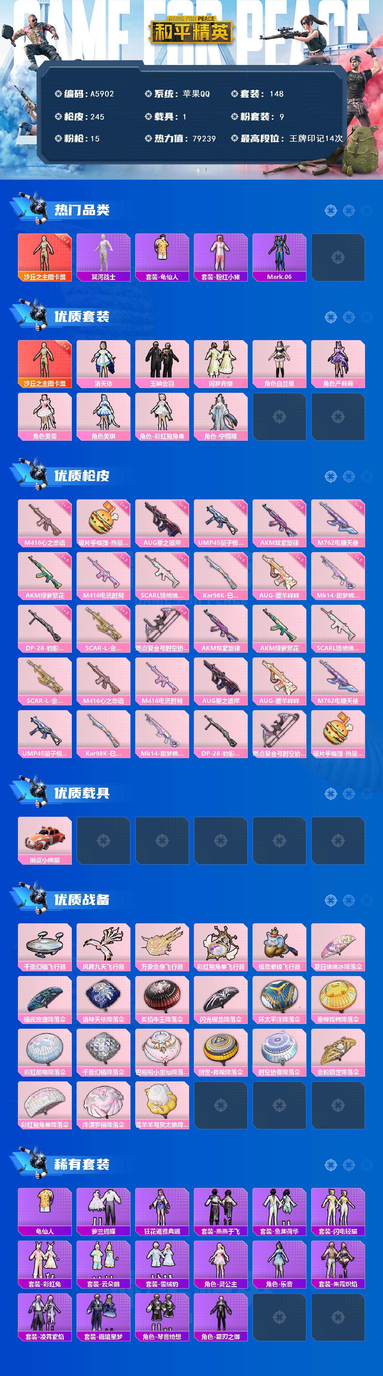 [16471963]苹果【极品男神号 沙丘之主-图卡盟二级/套装-冥河战士/角色-mark.06/scar-l-金蛇镇世三级/m416-心之恋语七级/m416-电玩时刻五级/aug-星之彼岸五级/aug-暖羊咩咩五级/俏皮小熊猫】 手q-1神装-9粉装-15特效呛-1载具-6粉色飞行器-79239热力值-14王牌印记-148套装-245呛皮 【红色神装等级】:沙丘之主-图卡盟二级 【红色角色神装】:沙丘之主-图卡盟 【热门品类】:套装-冥河战士,套装-龟仙人,套装-粉红小猪,角色-mark.06 【粉色套装】:角色-洛天依,粉装-玉鳞金羽,粉装-闲梦青缨,角色-白兰星,角色-严莉莉,角色-美雪,角色-美琪,角色-彩虹独角兽,角色-宁雨蝶 【粉色呛皮等级】:akm-炫紫旋律五级,akm-绿萝繁花五级,scar-l-锦绣绵绵五级,scar-l-金蛇镇世三级,m416-心之恋语七级,m416-电玩时刻五级,aug-星之彼岸五级,aug-暖羊咩咩五级,m762-电糖天使五级,ump45-量子极限五级,kar98k-巳巳如意五级,mk14-甜梦熊击五级,dp-28-豹影疾电五级,燃点复合弓-时空协奏二级,破片手留单-热量炸弹六级 【粉色载具】:俏皮小熊猫 【粉色呛皮】:akm-炫紫旋律,akm-绿萝繁花,scar-l-锦绣绵绵,scar-l-金蛇镇世,m416-心之恋语,m416-电玩时刻,aug-星之彼岸,aug-暖羊咩咩,m762-电糖天使,ump45-量子极限,kar98k-巳巳如意,mk14-甜梦熊击,dp-28-豹影疾电,燃点复合弓-时空协奏,破片手留单-热量炸弹 【粉色飞行器】:千面幻镜飞行器,凤舞九天飞行器,万象金身飞行器,彩虹独角兽飞行器,极意拳锋飞行器 【粉色降落伞】:夏日绵绵冰降落伞,暗夜玫瑰降落伞,洛神天依降落伞,炙焰牛王降落伞,闪光银龙降落伞,环太平洋降落伞,垂柳戏鸭降落伞,彩虹甜喵降落伞,千面幻镜降落伞,巴啦啦小魔仙降落伞,创世·救赎降落伞,时空协奏降落伞,金蛇镇世降落伞,彩虹独角兽降落伞,冷漠罗丽降落伞,喜羊羊与灰太狼降落伞,炫彩糖果降落伞 【稀有套装】:套装-龟仙人,套装-雪国风尚,套装-炫彩糖果,套装-萝兰蝴蝶,角色-狂花道·雅典娜,套装-燕燕于飞,套装-鱼渊荷华,套装-闪电