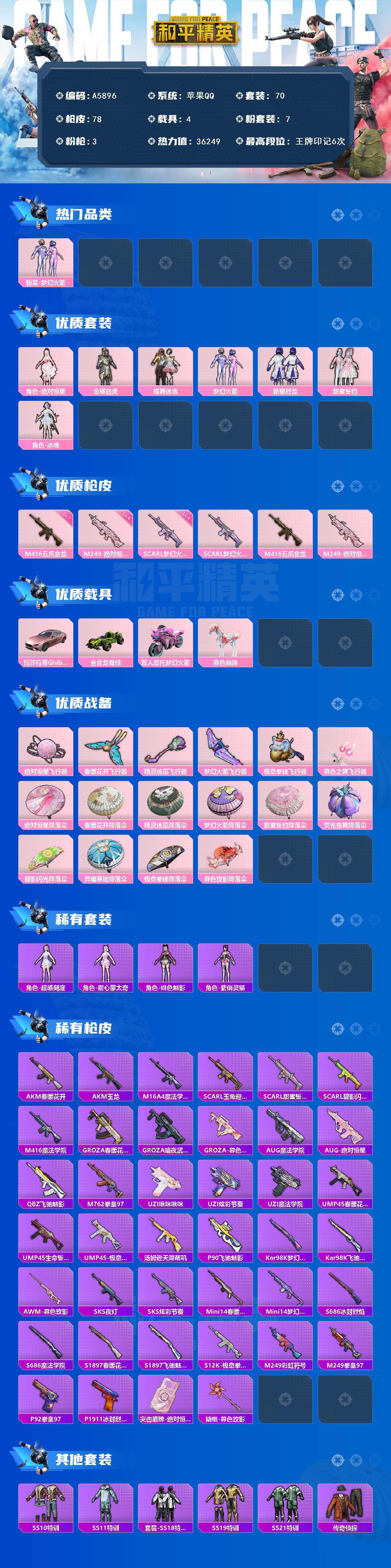 [16472161]苹果【呛皮号 m416-五爪金龙七级/m249-绝对恒星四级/梦幻火箭/玛莎拉蒂ghibli(粉)】 手q-7粉装-3特效呛-4载具-7粉色飞行器-36249热力值-6王牌印记-70套装-78呛皮 【热门品类】:粉装-梦幻火箭 【粉色套装】:角色-绝对恒星,粉装-金曜白虎,粉装-蝶舞迷情,粉装-梦幻火箭,粉装-新星烈龙,粉装-甜蜜誓约,角色-冰魄 【粉色呛皮等级】:scar-l-梦幻火箭四级,m416-五爪金龙七级,m249-绝对恒星四级 【粉色载具】:玛莎拉蒂ghibli(粉),合金龙骨(绿),双人摩托-梦幻火箭,暮色幽蹄 【粉色呛皮】:scar-l-梦幻火箭,m416-五爪金龙,m249-绝对恒星 【粉色飞行器】:绝对恒星飞行器,春暖花开飞行器,精灵迷巫飞行器,梦幻火箭飞行器,极意拳锋飞行器,暮色之舞飞行器 【粉色降落伞】:绝对恒星降落伞,春暖花开降落伞,精灵迷巫降落伞,梦幻火箭降落伞,甜蜜誓约降落伞,荧光虫舞降落伞,碧影闪光降落伞,异瞳寒姬降落伞,极意拳锋降落伞,炫彩糖果降落伞,暮色玫影降落伞 【稀有套装】:角色-超感刻度,角色-甜心蒙太奇,套装-雪国风尚,套装-炫彩糖果,角色-绯色魅影,角色-紫俏灵猫 【稀有呛皮】:aug-冰晶雪宝,akm-春暖花开,akm-玉龙,m16a4-魔法学院,scar-l-玉兔迎春,scar-l-甜蜜誓约,scar-l-碧影闪光,m416-魔法学院,groza-春暖花开,groza-暗夜武装,groza-暮色玫影,aug-魔法学院,aug-绝对恒星,q-飞驰魅影,m762-拳皇97,uzi-啾咪啾咪,uzi-炫彩节奏,uzi-魔法学院,ump45-春暖花开,ump45-生命誓言,ump45-极意拳锋,汤姆逊-天降萌叽,p90-飞驰魅影,kar98k-梦幻火箭,kar98k-飞驰魅影,awm-暮色玫影,sks-夜灯,sks-炫彩节奏,mini14-春暖花开,mini14-梦幻火箭,s686-冰封烈焰,s686-魔法学院,s1897-春暖花开,s1897-飞驰魅影,s12k-极意拳锋,m249-彩虹符号,m249-拳皇97,p92-拳皇97,p1911-冰封烈焰,突击盾牌-绝对恒星,撬棍-暮色玫影 【其他套装】:套装-ss10特训,套装-ss11特训,套装-ss18特训,套装-ss19特训,套装-ss21特训