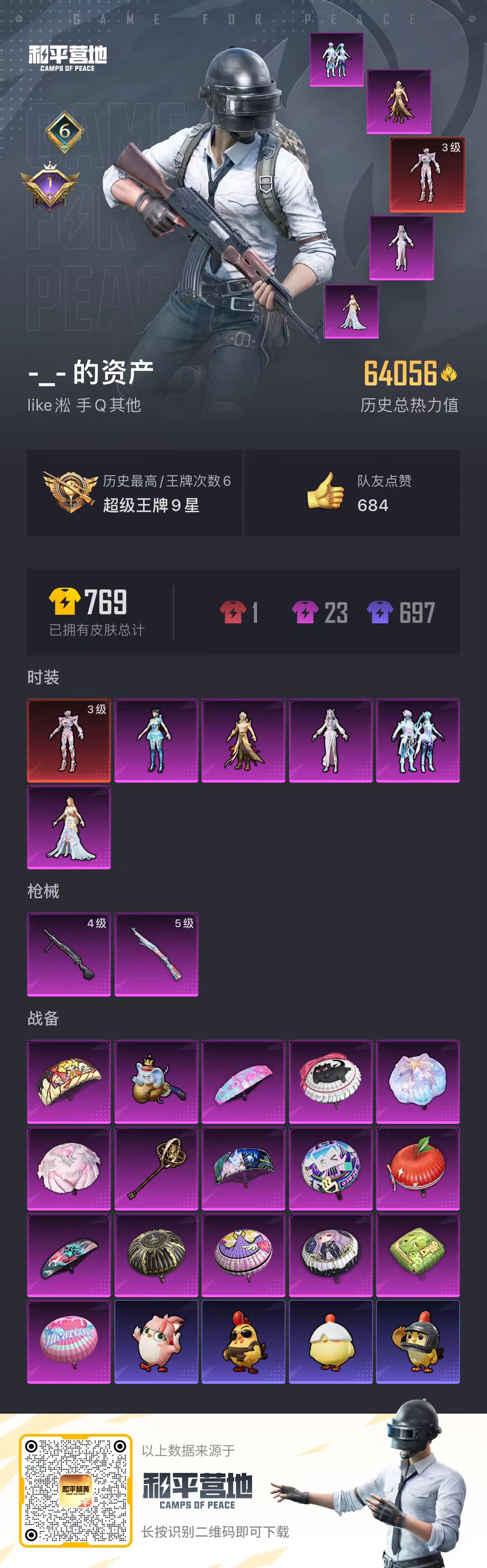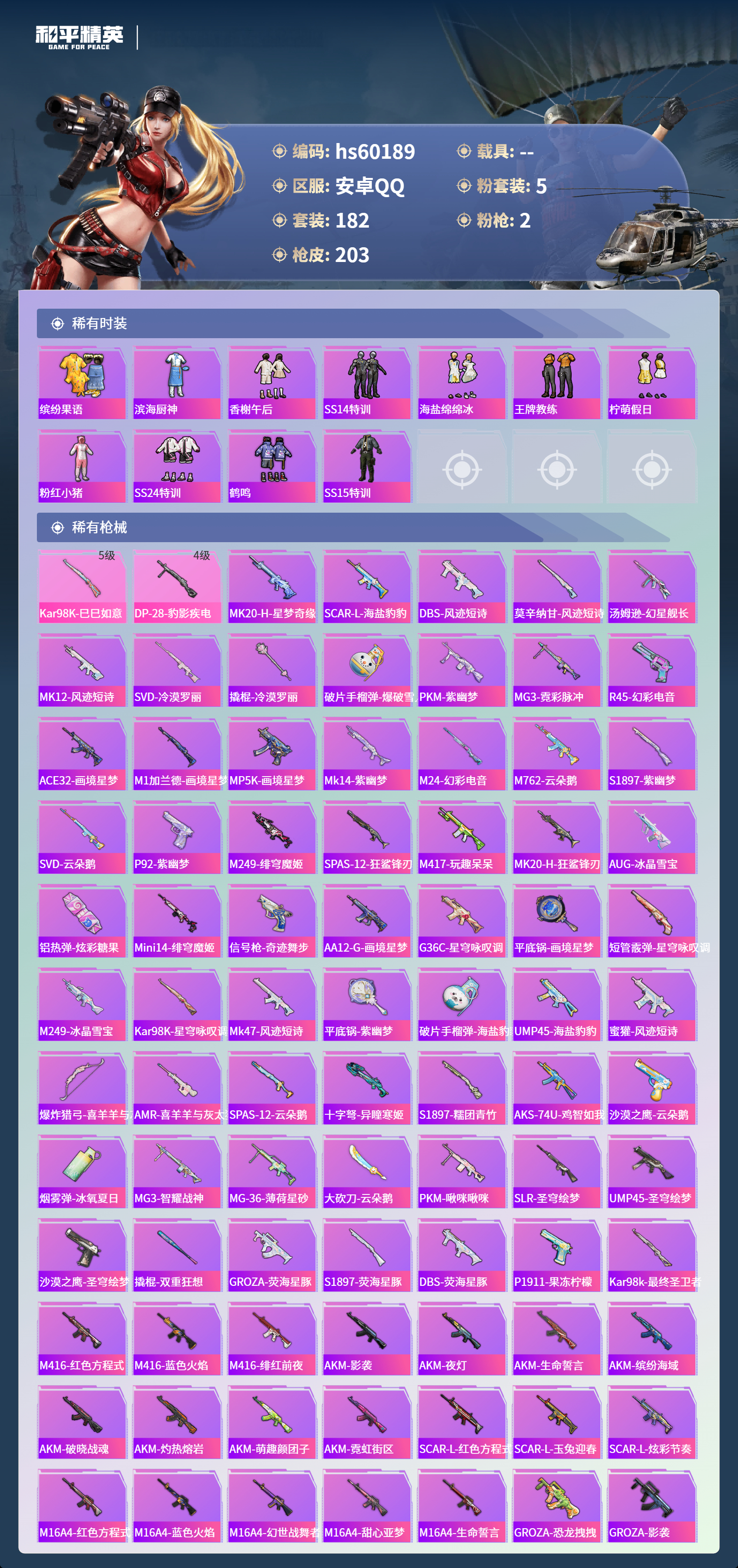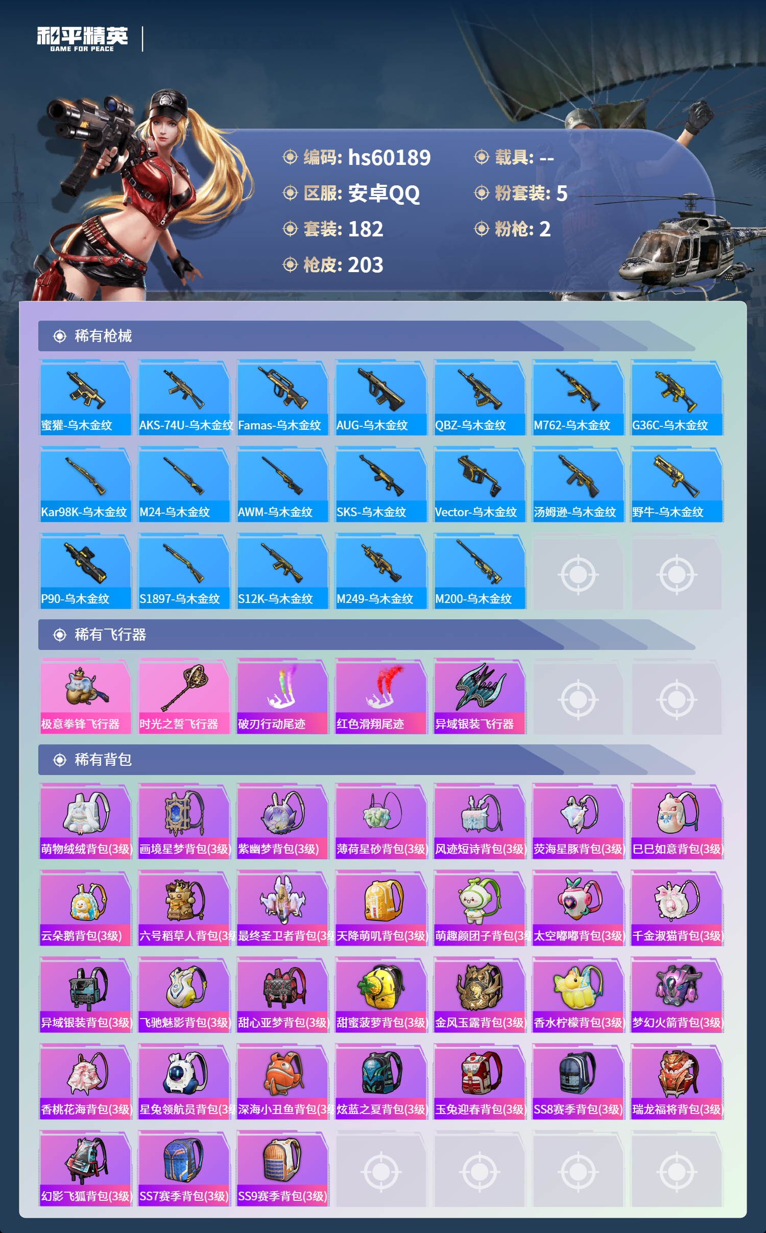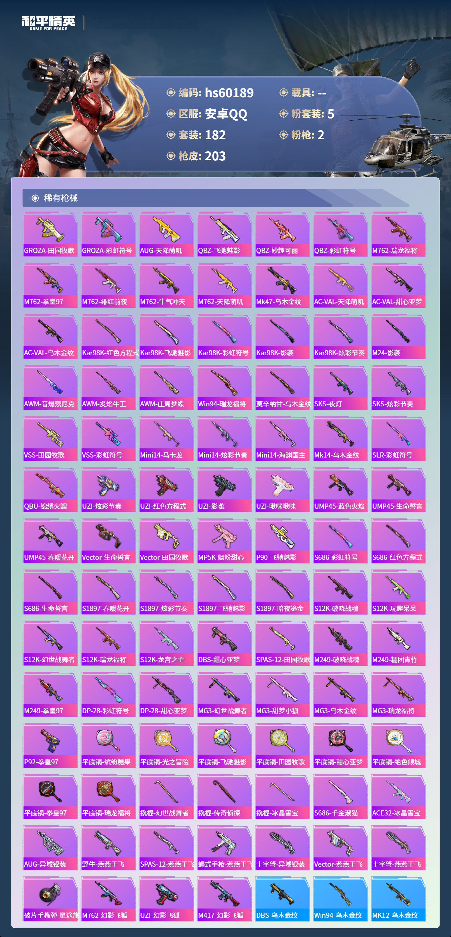 0载具-182套装-203呛皮-hs60189 安卓手q-6王牌印记-1红装-5粉装-2特效呛-64104热力值-182套装-203呛皮-1卓越印记【1红装】最终圣卫者-帕修斯/3级【5粉装】角色-智耀战神角色-冷漠罗丽套装-幻彩电音角色-罗征角色-异瞳寒姬【2特效呛】kar98k-巳巳如意/5级dp-28-豹影疾电/4级【6稀有紫装】都市猎人暗影哥特深海小丑鱼雪山精英迅捷狂鲨小丑鱼【179稀有时装