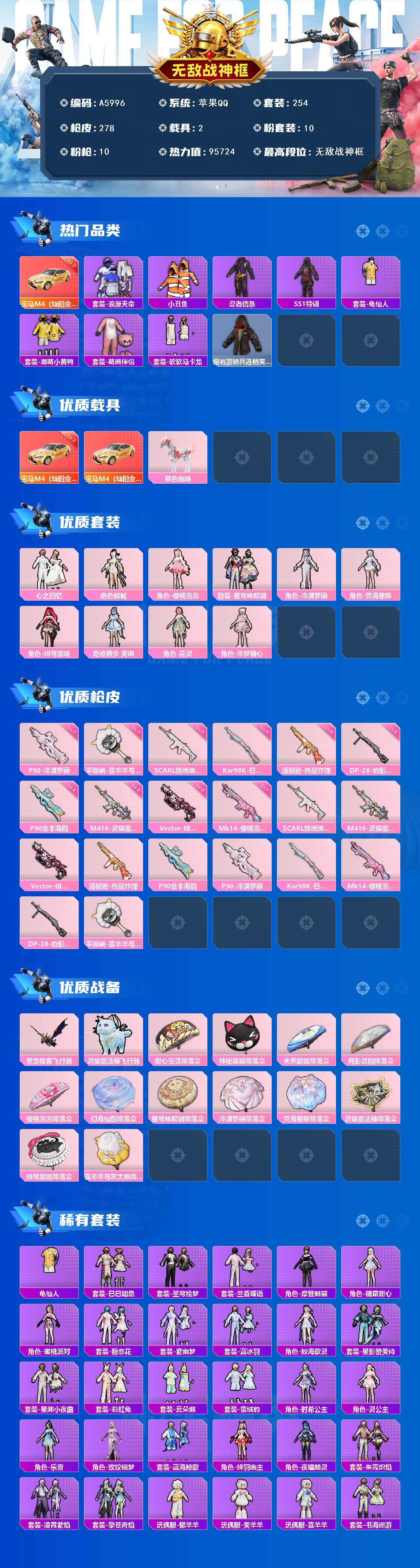 [16490291]苹果 【载具号 无敌战神框/宝马m4(灿阳金)三级/浪漫天命/小丑鱼/萌熊伴侣/m416-灵猫魔法师三级/p90-冷漠罗丽七级】手q-无敌战神框-10粉装-10特效呛-2载具-3粉色飞行器-95724热力值-9王牌印记-254套装-278呛皮 【红色载具】:宝马m4(灿阳金)三级 【热门品类】:套装-浪漫天命,套装-小丑鱼,套装-忍者信条,套装-ss1特训,套装-龟仙人,套装-潮萌小黄鸭,套装-萌熊伴侣,套装-软软马卡龙,熔岩游骑兵连帽夹克 【粉色套装】:粉装-心之回忆,角色-绝色倾城,角色-樱桃泡泡,粉装-星穹咏叹调,角色-冷漠罗丽,角色-荧海星豚,角色-绯穹魔姬,角色-奇迹舞步 美琪,角色-花灵,角色-羊梦糖心 【粉色呛皮等级】:scar-l-锦绣绵绵五级,m416-灵猫魔法师三级,vect-绯穹魔姬三级,汤姆逊-热量炸弹五级,p90-金丰海韵四级,p90-冷漠罗丽七级,kar98k-巳巳如意五级,mk14-樱桃泡泡一级,dp-28-豹影疾电五级,平底锅-喜羊羊与灰太狼七级 【粉色载具】:宝马m4(灿阳金),暮色幽蹄 【粉色呛皮】:scar-l-锦绣绵绵,m416-灵猫魔法师,vect-绯穹魔姬,汤姆逊-热量炸弹,p90-金丰海韵,p90-冷漠罗丽,kar98k-巳巳如意,mk14-樱桃泡泡,dp-28-豹影疾电,平底锅-喜羊羊与灰太狼 【粉色飞行器】:繁龙极客飞行器,灵猫魔法师飞行器 【粉色降落伞】:甜心宝贝降落伞,神秘黑猫降落伞,未来歌姬降落伞,月影灵韵降落伞,樱桃泡泡降落伞,幻海仙踪降落伞,星穹咏叹调降落伞,冷漠罗丽降落伞,荧海星豚降落伞,灵猫魔法师降落伞,绯穹魔姬降落伞,喜羊羊与灰太狼降落伞,炫彩糖果降落伞 【稀有套装】:套装-龟仙人,套装-巳巳如意,套装-圣穹绘梦,套装-兰香蝶语,套装-炫彩糖果,角色-摩登魅猫,角色-糖霜甜心,角色-蜜桃派对,套装-粉恋花,套装-紫幽梦,套装-蓝冰羽,角色-鲛海歌灵,套装-星影赞美诗,套装-星渊小夜曲,套装-彩虹兔,套装-云朵鹅,套装-雪绒豹,角色-时希公主,角色-灵公主,角色-乐音,角色-玫纹锢梦,套装-蓝海鲸歌,角色-绛羽幽主,角色-夜瞳黯灵,套装-朱霞炽焰,套装-凌霄紫焰,套装-擎苍青焰,玩偶服-懒羊羊,玩偶服-美羊羊,玩偶服-喜羊羊,套装-书海巡