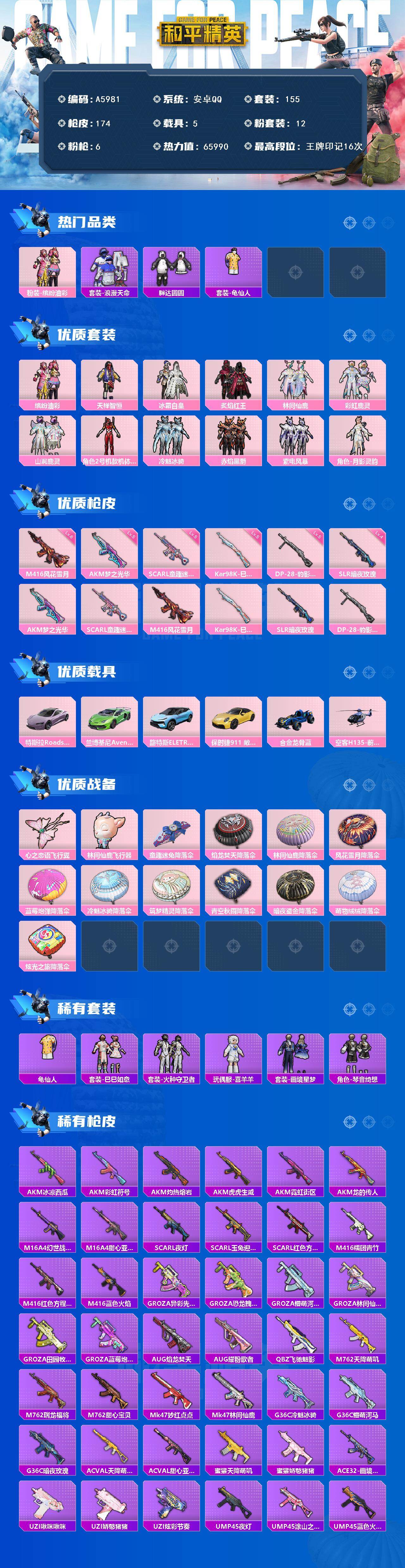 [16493208]安卓 【载具号 缤纷油彩/浪漫天命/胖达圆圆/龟仙人/2号机款机体服/akm-梦之光华五级/m416-风花雪月六级/特斯拉roadster(沁心粉)/兰博基尼aventad svj(翡翠绿)/路特斯eletre(冰川蓝)】手q-12粉装-6特效呛-5载具-3粉色飞行器-65990热力值-16王牌印记-155套装-174呛皮 【热门品类】:粉装-缤纷油彩,套装-浪漫天命,套装-胖达圆圆,套装-龟仙人 【粉色套装】:粉装-缤纷油彩,粉装-天禅智恒,粉装-冰霜白皇,粉装-炙焰红王,粉装-林间仙鹿,粉装-彩虹鹿灵,粉装-山涧鹿灵,角色-2号机款机体服,粉装-冷魅冰骑,粉装-赤焰黑爵,粉装-紫电风暴,角色-月影灵韵 【粉色呛皮等级】:akm-梦之光华五级,scar-l-童趣迷兔五级,m416-风花雪月六级,kar98k-巳巳如意五级,slr-暗夜玫瑰四级,dp-28-豹影疾电五级 【粉色载具】:特斯拉roadster(沁心粉),兰博基尼aventad svj(翡翠绿),路特斯eletre(冰川蓝),保时捷911 敞篷版(极速黄),合金龙骨(蓝),空客h135-蔚蓝之翼 【粉色呛皮】:akm-梦之光华,scar-l-童趣迷兔,m416-风花雪月,kar98k-巳巳如意,slr-暗夜玫瑰,dp-28-豹影疾电 【粉色飞行器】:心之恋语飞行翼,林间仙鹿飞行器 【粉色降落伞】:童趣迷兔降落伞,焰龙焚天降落伞,林间仙鹿降落伞,风花雪月降落伞,蓝莓炮弹降落伞,冷魅冰骑降落伞,筑梦精灵降落伞,青空秋雨降落伞,暗夜鎏金降落伞,萌物绒绒降落伞,炫光之旅降落伞,炫彩糖果降落伞 【稀有套装】:套装-龟仙人,套装-巳巳如意,套装-雪国风尚,套装-炫彩糖果,套装-火种守卫者,玩偶服-喜羊羊,套装-画境星梦,套装-琴音绮想 【稀有呛皮】:akm-冰凉西瓜,akm-彩虹符号,akm-灼热熔岩,akm-虎虎生威,akm-霓虹街区,akm-龙的传人,m16a4-幻世战舞者,m16a4-甜心亚梦,scar-l-夜灯,scar-l-玉兔迎春,scar-l-红色方程式,m416-糯团青竹,m416-红色方程式,m416-蓝色火焰,groza-异彩先驱,groza-恐龙拽拽,groza-懵萌河马,groza-林间仙鹿,groza-田园牧歌,groza-蓝莓炮弹,aug-焰龙焚