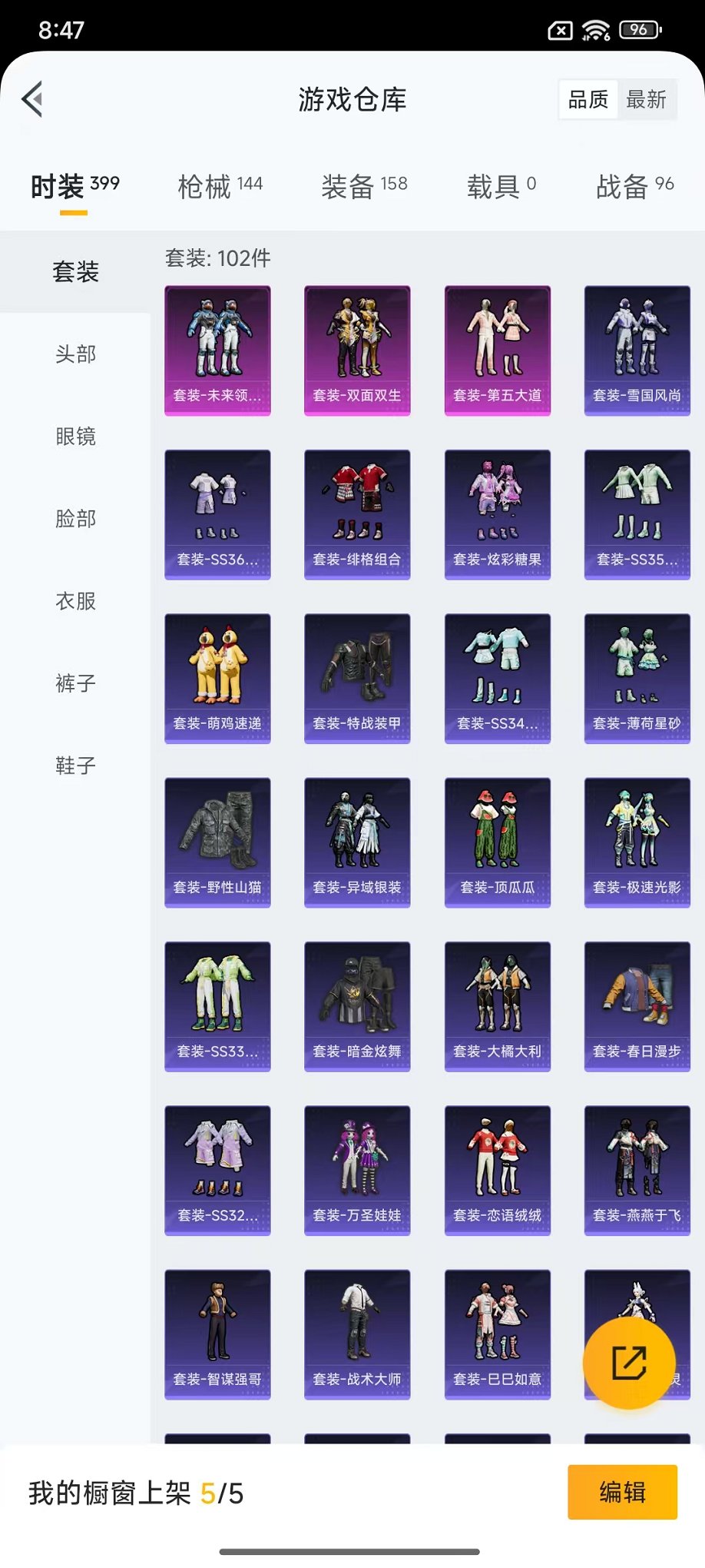 0载具-102套装-144呛皮-可二次【连体号 蓝螳螂 满级妹控3粉装5特效呛带王者130皮4传说可秒换绑】 安卓q区-41161热力值-5印记-102套装-144呛皮 【1稀有】 mark.06【3粉装】 双面双生 第五大道 套装-未来领航者【5特效呛】 m416-电玩时刻5级 mk14-精灵梦叶罗丽7级 groza-镜光银凌5级 kar98k-巳巳如意5级 dp-28-豹影疾电5级【2