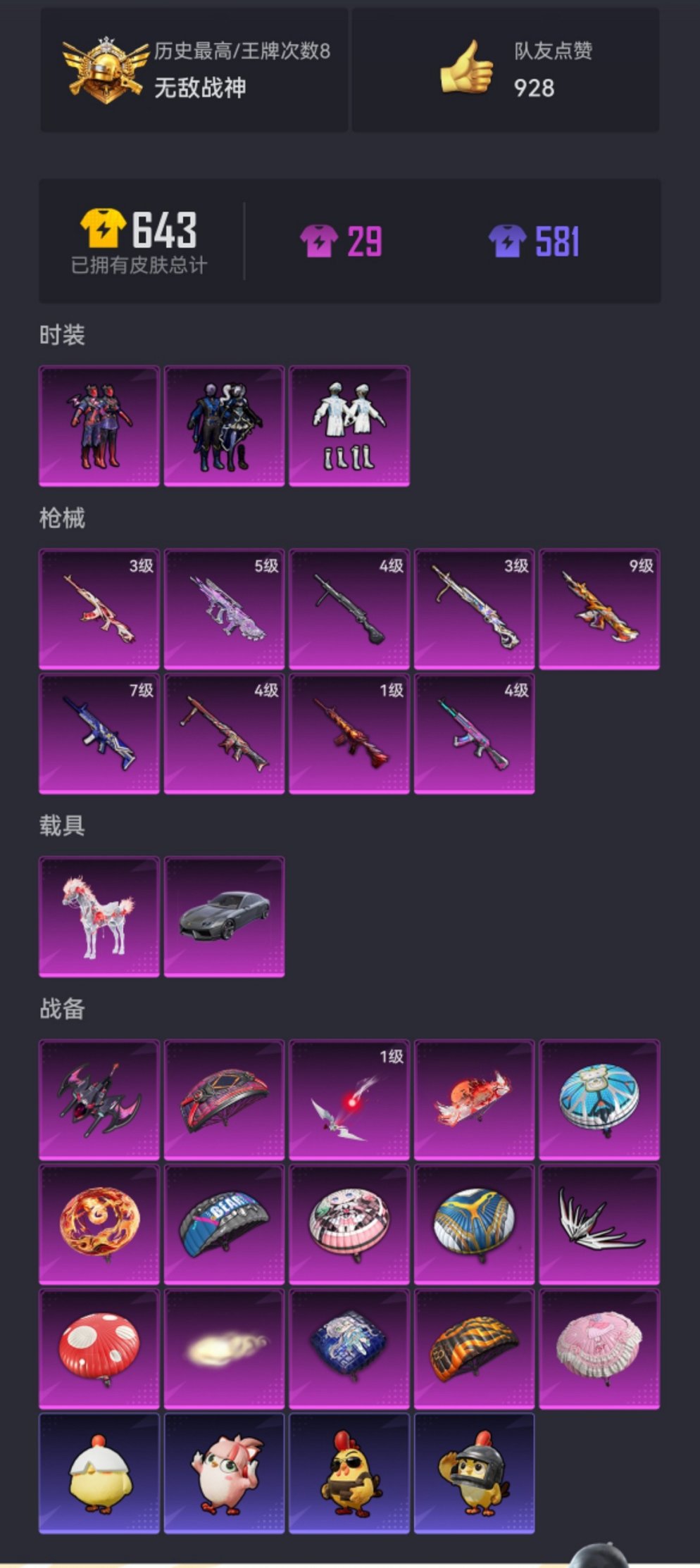 2载具-122套装-186呛皮-【战神框满级m4至情至圣9特效呛3粉装2载具 秒换绑不用等】 苹果q区-58367热力值-8印记-历史最高段位:无敌战神-122套装-186呛皮 【2载具】 兰博轿车灰色 暮色幽蹄【3粉装】 星之彼岸 暗夜玫瑰 海盐物语【9特效呛】 m416-至情至圣9级 m416-风花雪月1级 akm-炫紫旋律4级 akm-暮色玫影3级 famas-天象三御5级 scar