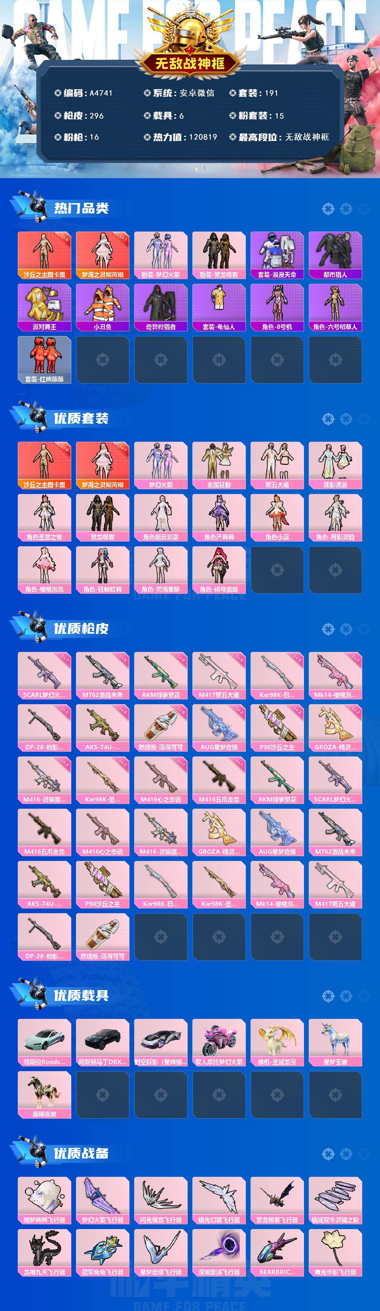 [15912281]安卓 【极品神装号 沙丘之主-图卡盟六级/梦海之灵-妮芮妲一级/浪漫天命/奇异狩猎者/梦幻火箭/都市猎人/派对舞王/红熊茄茄/scar-l-梦幻火箭七级/特斯拉roadster(水滴蓝)】微信-无敌战神框-2神装-15粉装-16特效呛-6载具-19粉色飞行器-120819热力值-22王牌印记-191套装-296呛皮 【红色神装等级】:梦海之灵-妮芮妲一级,沙丘之主-图卡盟六级 【红色角色神装】:梦海之灵-妮芮妲,沙丘之主-图卡盟 【热门品类】:粉装-梦幻火箭,粉装-繁龙极客,套装-浪漫天命,套装-都市猎人,套装-派对舞王,套装-小丑鱼,套装-奇异狩猎者,套装-龟仙人,角色-8号机,角色-六号稻草人,套装-红熊茄茄 【粉色套装】:粉装-梦幻火箭,粉装-金属狂野,粉装-第五大道,粉装-莲影清波,角色-圣堂之誓,粉装-繁龙极客,角色-烟云彩露,角色-严莉莉,角色-小蓝,角色-月影灵韵,角色-樱桃泡泡,角色-狂魅哈莉,角色-荧海星豚,角色-绯穹魔姬 【粉色呛皮等级】:akm-绿萝繁花五级,scar-l-梦幻火箭七级,m416-五爪金龙一级,m416-心之恋语一级,m416-灵猫魔法师三级,groza-精灵之光三级,aug-星梦奇缘三级,m762-激战未来五级,aks-74u-森灵之息五级,p90-沙丘之主三级,kar98k-巳巳如意五级,kar98k-圣域龙灵二级,mk14-樱桃泡泡五级,m417-第五大道五级,dp-28-豹影疾电五级,燃烧瓶-薄荷可可六级 【粉色载具】:特斯拉roadster(水滴蓝),阿斯顿马丁dbx(蓝),时空跃影(星辉银),双人摩托-梦幻火箭,僚机-圣域龙宝,星梦玉骢,黑曜夜骑 【粉色呛皮】:akm-绿萝繁花,scar-l-梦幻火箭,m416-五爪金龙,m416-心之恋语,m416-灵猫魔法师,groza-精灵之光,aug-星梦奇缘,m762-激战未来,aks-74u-森灵之息,p90-沙丘之主,kar98k-巳巳如意,kar98k-圣域龙灵,mk14-樱桃泡泡,m417-第五大道,dp-28-豹影疾电,燃烧瓶-薄荷可可 【粉色飞行器】:酣梦熊熊飞行器,梦幻火箭飞行器,闪光银龙飞行器,镜光幻境飞行翼,繁龙极客飞行器,镜域双华-灵镜之阶,龙翔九天飞行器,冠军兔兔飞行