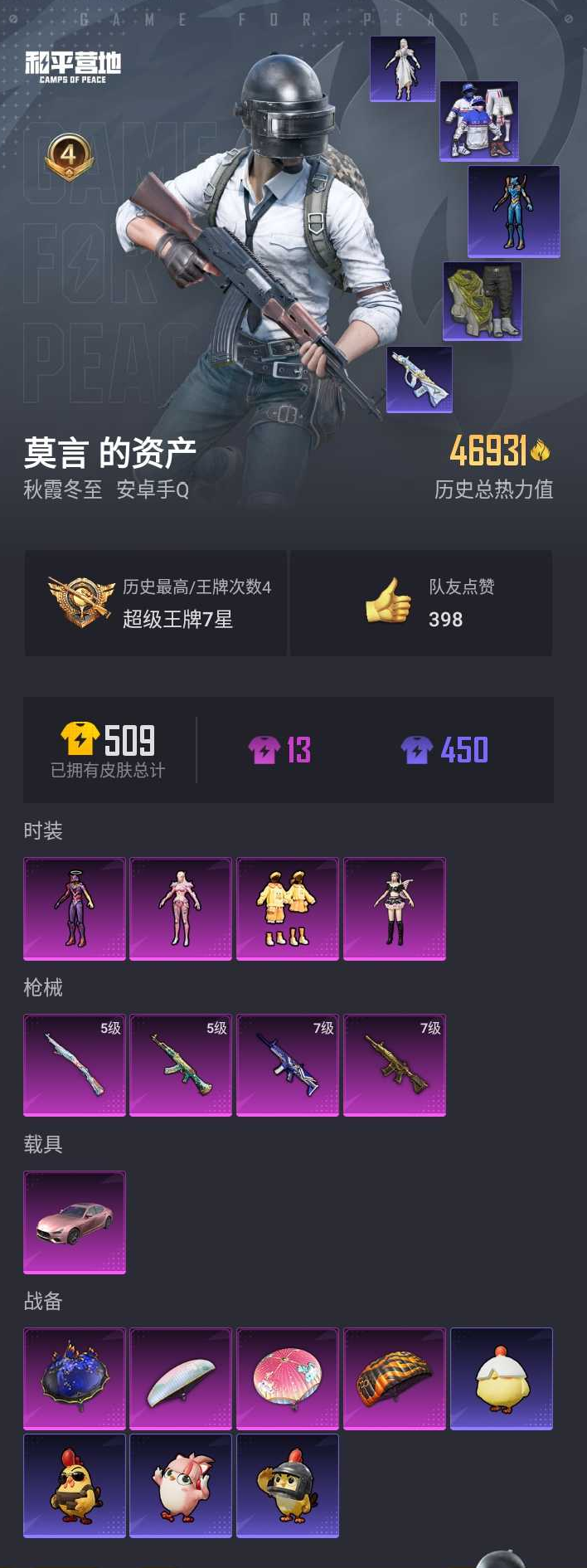 【和平精英】【lyhp21172】4粉装,4特效呛,1载具,历史最高段位:超级王牌7星 王牌印记4次 热力值:46931,114套装,146呛械,149装备,74战备;套装:角色-白兰星,套装-憨憨奶龙,角色-守护天翼,角色-初号机 觉醒ver.,套装-蓝色运动,套装-白色伏地魔,套装-黑色伏地魔,套装-骑行爱好者,套装-冰川格斗者,套装-竞技名士,套装-湖蓝色名流,套装-猛禽,套装-长空猛禽,套装-海岛探路者,套装-浪漫天命,套装-滨海假日,套装-幻影武者,套装-蓝彩潮人,套装-怒火燎原,套装-魅力单车,套装-绮丽涂鸦,套装-耀眼新星,套装-都市漫游者,套装-狂沙舞者,套装-破晓战魂,套装-幻世保卫者,套装-荣耀,套装-幻世战舞者,套装-甜蜜菠萝,套装-蓝调潮人,套装-午夜朋克,套装-甜蜜熊情侣,套装-缤纷果语,套装-龙魂突击队,套装-格斗先锋,套装-麻辣教官,套装-疯狂小兔子,套装-淡雅花蕊,套装-鹤鸣,套装-ss10特训,套装-ss8特训,套装-白熊同盟,套装-萌黄之夏,套装-夏日音浪,套装-ss9特训,套装-探宝勇士,套装-牛气满满,套装-ss11特训,套装-原初圣火,套装-逆风勇士,套装-战术大师,套装-ss12特训,套装-牛气冲天,套装-ss18特训,套装-耀粉歌者,套装-飞行日记,套装-ss13特训,套装-竞技角斗士,套装-热情海星,套装-纯真浪花,套装-ss14特训,套装-吉莉礼服,套装-ss15特训,套装-ss16特训,套装-暗夜傀儡,套装-ss17特训,套装-瑞龙福将,套装-团圆交子,套装-福星高照,套装-虎虎生威吉莉,套装-异彩先驱,套装-霓虹极客,套装-ss19特训,套装-ss20特训,套装-ss21特训,套装-玉兔迎春,套装-ss22特训,套装-光之冒险,套装-绯格组合,套装-神气柴柴,套装-懵萌河马,套装-ss24特训,套装-恋恋初桃,套装-涂山之恋,套装-ss25特训,套装-惊鸿侠骨,套装-锦衣飞扬,套装-元气发射,套装-龙的传人,套装-ss26特训,套装-快闪甜心,套装-春光漫游,套装-空岛之星,套装-ss27特训,套装-恋语绒绒,套装-ss28特训,角色-银尘,角色-8号机,角色-mark.06,套装-海盐绵绵冰,套装-ss29特训,套装-ss30特训,套装-青团波波,角色-光矢逐梦,套装-糖糖葫芦,套装-ss31特训,套装-鱼渊荷华,套装-燕燕于飞,套装-智谋强哥,套装-ss33特训,套装-巳巳如意,套装-ss32特训,角色-乐音,套装-ss34特训;呛皮:groza-异彩先驱,groza-懵萌河马,groza-海盐豹豹,groza-乌木金纹,蜜獾-天降萌叽,蜜獾-糖糖葫芦,蜜獾-乌木金纹,7级scar-l-青春物语,scar-l-炫彩节奏,scar-l-玉兔迎春,scar-l-海盐豹豹,q-原初圣火,q-彩虹符号,q-纯真浪花,q-乌木金纹,5级akm-绿萝繁花,akm-破晓战魂,akm-霓虹街区,akm-夜灯,akm-萌趣颜团子,akm-虎虎生威,akm-龙的传人,ac-val-乌木金纹,ac-val-天降萌叽,ac-val-快闪甜心,m762-牛气冲天,m762-瑞龙福将,m762-天星战神,aug-耀粉歌者,aug-月影灵韵,7级m416-五爪金龙,m416-夜灯,m416-蓝色火焰,m416-绯红前夜,m416-糯团青竹,m16a4-红色方程式,m16a4-幻世战舞者,m16a4-冰河战士,g36c-懵萌河马,g36c-乌木金纹,famas-乌木金纹,mk47-乌木金纹,m24-治愈之星,m24-炫彩节奏,m24-乌木金纹,5级kar98k-巳巳如意,kar98k-红色方程式,kar98k-幻影战神,kar98k-彩虹符号,kar98k-乌木金纹,win94-瑞龙福将,莫辛纳甘-懵萌河马,awm-纯真浪花,awm-乌木金纹,amr-乌木金纹,m200-惊鸿侠骨,m200-乌木金纹,mk20-h-快闪甜心,mk20-h-糖糖葫芦,mk20-h-乌木金纹,mini14-金鼠迎春,mini14-原初圣火,mini14-异彩先驱,mini14-筑梦精灵,mini14-涂山之恋,vss-彩虹符号,vss-香桃花海,vss-乌木金纹,m417-惊鸿侠骨,mk14-乌木金纹,mk14-冰河战士,sks-炫彩节奏,uzi-炫彩节奏,uzi-天降萌叽,uzi-冰河战士,uzi-啾咪啾咪,ump45-生命誓言,ump45-涂山之恋,ump45-糖糖葫芦,野牛-天星战神,野牛-燕燕于飞,野牛-乌木金纹,p90-快闪甜心,p90-玩趣呆呆,p90-巳巳如意,p90-乌木金纹,汤姆逊-炫彩节奏,汤姆逊-异彩先驱,汤姆逊-天降萌叽,汤姆逊-纯真浪花,汤姆逊-乌木金纹,vect-生命誓言,vect-彩虹符号,vect-燕燕于飞,mp5k-异彩先驱,mp5k-乌木金纹,s12k-夜灯,s12k-瑞龙福将,s12k-幻世战舞者,s12k-玩趣呆呆,s686-生命誓言,s686-彩虹符号,s686-巳巳如意,dbs-乌木金纹,aa12-g-炫光之旅,aa12-g-纯真浪花,spas-12-燕燕于飞,spas-12-乌木金纹,s1897-乌木金纹,m249-破晓战魂,m249-彩虹符号,m249-莲影清波,m249-乌木金纹,pkm-懵萌河马,dp-28-原初圣火,dp-28-乌木金纹,mg3-瑞龙福将,mg3-幻世战舞者,mg3-乌木金纹,mg3-惊鸿侠骨,p18c-原初圣火,p18c-糖糖葫芦,沙墨之鹦-快闪甜心,蝎式手呛-燕燕于飞,平底锅-原初圣火,平底锅-瑞龙福将,平底锅-异彩先驱,平底锅-懵萌河马,平底锅-惊鸿侠骨,平底锅-快闪甜心,平底锅-空岛之星,平底锅-纯真浪花,平底锅-糖糖葫芦,平底锅-许七安,撬棍-绯红前夜,撬棍-幻世战舞者,撬棍-朗基努斯之呛,大砍刀-2p战斗服款,十子怒-燕燕于飞,十子怒-异域银装,爆炸猎弓-惊鸿侠骨,破片手留单-萌趣颜团子,破片手留单-呆爆全场,破片手留单-巳巳如意,战术弩-江南烟雨,突击盾牌-初号机 觉醒ver.;载具:玛莎拉蒂ghibli粉;降落伞:粉色滑翔尾迹; 详情看图4w6热力值精品小号 4粉装4特效呛1载具 觉醒螳螂 浪漫天命 狂沙舞者 憨憨奶龙 满级金龙m4 满级青春死噶 粉玛莎