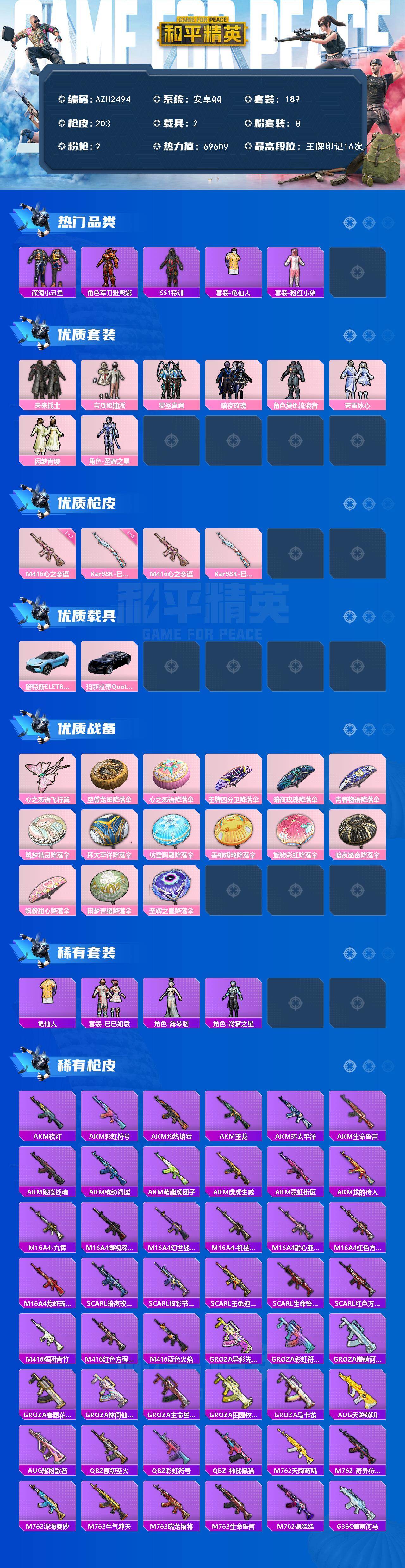 2载具-189套装-203呛皮-【azh2494】安卓 手q【16印记 未来战士 宝贝奶油派 闲梦青缨 深海小丑鱼 满级心之恋语m416 2载具】8粉装-2特效呛-2载具-1粉色飞行器-69609热力值-16王牌印记-189套装-203呛皮 【热门品类】:套装-深海小丑鱼,角色-军刀雅典娜,套装-ss1特训,套装-龟仙人,套装-粉