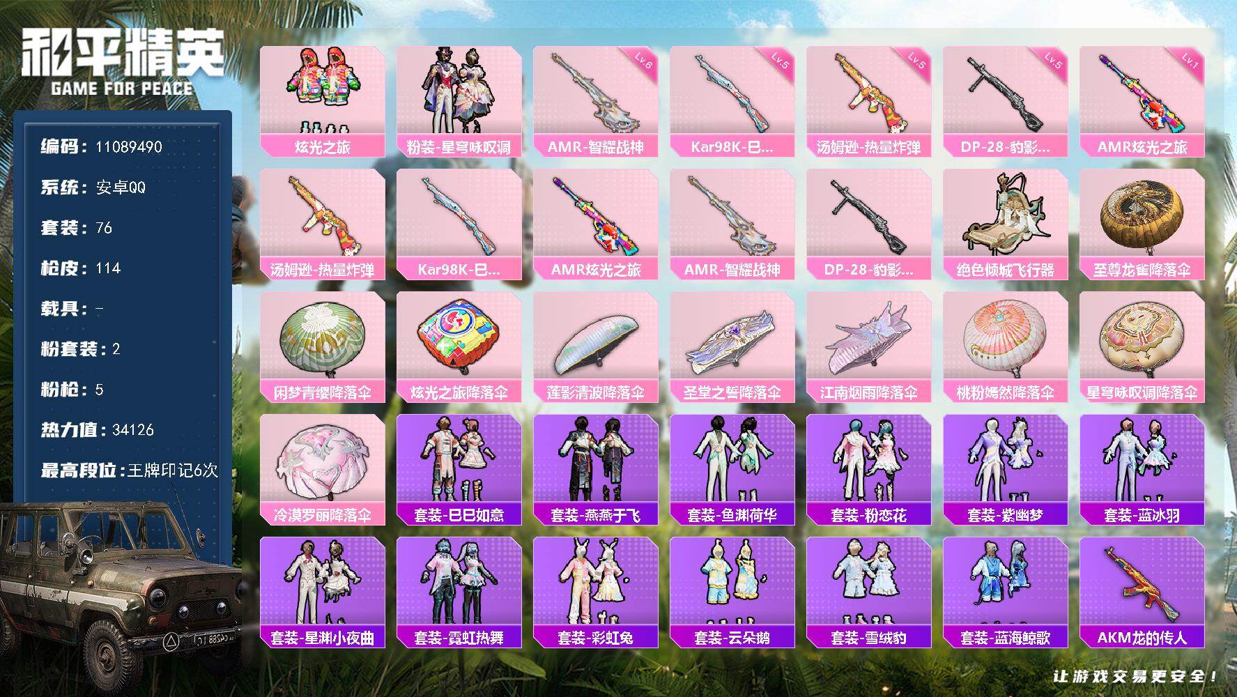 [16514418]【编号19906可秒换绑】【店长推荐精品号!】安卓 手q-2粉装-5特效呛-0载具-34126热力值-6印记-76套装-114呛皮 【特效呛等级】:汤姆逊-热量炸弹五级,kar98k-巳巳如意五级,amr-炫光之旅一级,amr-智耀战神六级,dp-28-豹影疾电五级 【优质套装】:粉装-炫光之旅,粉装-星穹咏叹调 【稀有套装】:套装-龟仙人,套装-巳巳如意,套装-燕燕于飞,套装-鱼渊荷华,套装-粉恋花,套装-紫幽梦,套装-蓝冰羽,套装-星渊小夜曲,套装-霓虹热舞,套装-彩虹兔,套装-云朵鹅,套装-雪绒豹,套装-蓝海鲸歌 【优质武器皮肤】:汤姆逊-热量炸弹,kar98k-巳巳如意,amr-炫光之旅,amr-智耀战神,dp-28-豹影疾电 【稀有武器皮肤】:akm-龙的传人,scar-l-夜灯,scar-l-炫彩节奏,m416-糯团青竹,m416-绯红前夜,groza-影袭,aug-耀粉歌者,q-彩虹符号,m762-天降萌叽,m762-绯红前夜,m762-云朵鹅,mk47-炫光之旅,g36c-星穹咏叹调,ac-val-快闪甜心,ac-val-六号稻草人,蜜獾-天降萌叽,uzi-天降萌叽,uzi-红色方程式,ump45-夜灯,ump45-炫光之旅,ump45-生命誓言,ump45-蓝色火焰,ump45-圣穹绘梦,vect-彩虹符号,汤姆逊-天降萌叽,汤姆逊-耀粉歌者,mp5k-怪笑疯兔,p90-倾城蜜语,p90-快闪甜心,p90-巳巳如意,kar98k-彩虹符号,kar98k-洛神天依,kar98k-星穹咏叹调,awm-圣堂之誓,sks-未来歌姬,vss-彩虹符号,m417-惊鸿侠骨,mk20-h-快闪甜心,m200-惊鸿侠骨,svd-云朵鹅,svd-冷漠罗丽,s686-生命誓言,s686-巳巳如意,s686-千金淑猫,s12k-玩趣呆呆,s12k-香水柠檬,s12k-夜灯,s12k-智耀战神,dbs-彩虹符号,dbs-幻彩电音,aa12-g-炫光之旅,spas-12-云朵鹅,m249-彩虹符号,dp-28-彩虹符号,mg3-幻世战舞者,mg3-惊鸿侠骨,短管霰弹-星穹咏叹调,蝎式手呛-闲梦青缨,沙墨之鹦-快闪甜心,沙墨之鹦-云朵鹅,沙墨之鹦-圣穹绘梦,tmp-9-未来歌姬,tmp-9-雪月幻音,爆炸猎弓-惊鸿侠骨,爆炸猎弓-雪月幻音,大砍刀