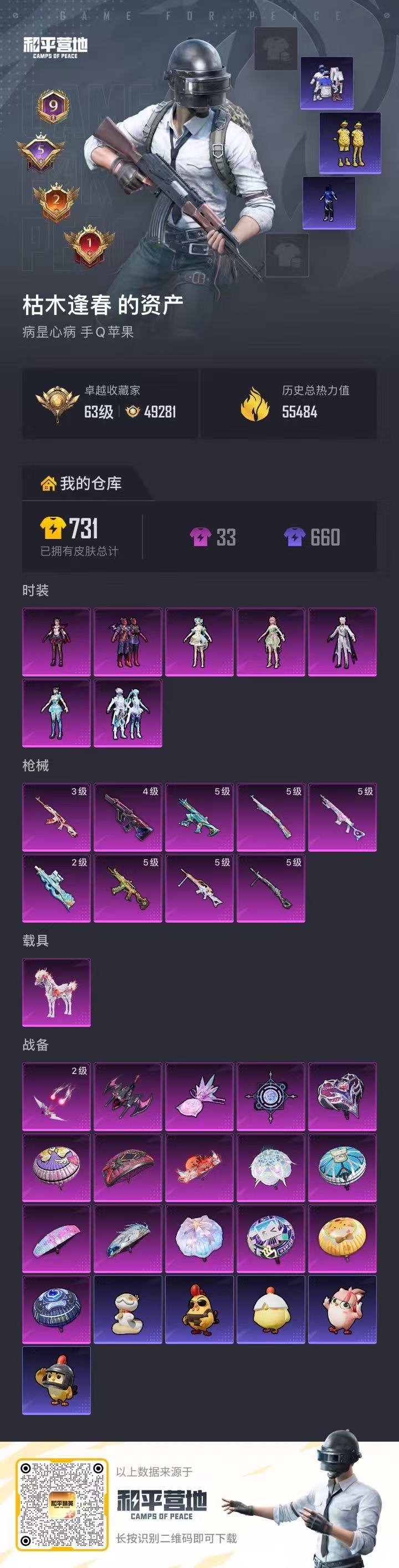 【和平精英】【txhp6996】7粉装,9特效呛,1载具,历史最高段位:超级王牌18星 王牌印记9次 热力值:55484,125套装,198呛械,262装备,124战备;套装:套装-星之彼岸,角色-异瞳寒姬,角色-霁蓝缠春,套装-幻彩电音,角色-星渊,角色-花灵,角色-罪夜之冕,套装-特训学院,套装-青年教官,套装-红色运动,套装-黄色运动,套装-蓝色运动,套装-黄色伏地魔,套装-白色伏地魔,套装-黑色伏地魔,套装-竞技名士,套装-黄色名流,套装-猛禽,套装-长空猛禽,套装-漫步者,套装-海岛探路者,套装-旭日情侣,套装-灼焰舞者,套装-青羽突袭者,套装-浪漫天命,套装-特战装甲,套装-甜蜜告白,套装-完美偶像,套装-人气偶像,套装-幻影武者,套装-蓝彩潮人,套装-魅力单车,套装-绮丽涂鸦,套装-超能勇士,套装-破晓战魂,套装-幻世保卫者,套装-森林游猎者,套装-都市魅力,套装-夏日倾情,套装-缤纷果语,套装-滨海厨神,套装-龙魂突击队,套装-元素星魂,套装-极速红龙,套装-梦魇先生,套装-黑夜传说,套装-粉红小猪,套装-破蛋小黄鸡,套装-白糯汤圆,套装-战术大师,套装-耀粉歌者,套装-冰爽海盐,套装-快乐星愿,套装-星梦畅游,套装-tt战队服,套装-光之冒险,套装-王牌教练,套装-龟仙人,套装-香桃花海,套装-冰河战士,套装-ss27特训,套装-恋语绒绒,套装-ss28特训,角色-白光莹,角色-情公主,套装-街头风暴,套装-海盐绵绵冰,套装-蝶变,套装-小熊娃娃,套装-ss29特训,套装-雏菊兔兔,套装-萝兰蝴蝶,角色-绯色魅影,角色-紫俏灵猫,套装-异域银装,套装-星途旅人,角色-许七安,套装-ss30特训,套装-青团波波,套装-棉花软糖,角色-夜瞳黯灵,角色-绛羽幽主,套装-糖糖葫芦,套装-ss31特训,套装-鱼渊荷华,套装-石蕴玉辉,套装-燕燕于飞,套装-智谋强哥,套装-紫幽梦,套装-粉恋花,套装-ss33特训,套装-云朵鹅,套装-巳巳如意,套装-ss32特训,套装-彩虹兔,套装-青翼流星,套装-风舞幻音,套装-蓝冰羽,套装-顶瓜瓜,套装-雪绒豹,套装-狂鲨锋刃,套装-大橘大利,套装-霓虹热舞,套装-炫彩糖果,玩偶服-美羊羊,套装-元气之梦,套装-ss34特训,套装-擎苍青焰,套装-朱霞炽焰,套装-游乐,套装-凌霄紫焰,套装-薄荷星砂,套装-ss35特训,套装-午间小调,套装-秘语星愿,套装-风迹短诗,套装-琴音绮想,套装-粉黛兰香,套装-画境星梦,套装-书海巡游,套装-阳光菠萝,套装-ss37特训,套装-ss36特训,套装-雪国风尚,套装-萌鸡速递;呛皮:m762-雏菊兔兔,m762-云朵鹅,m762-登顶巅峰,scar-l-红色方程式,scar-l-夜灯,scar-l-彩虹符号,scar-l-玉兔迎春,scar-l-星途旅人,scar-l-海盐豹豹,scar-l-绿洲时空,mk47-虚空骇客,mk47-风迹短诗,ace32-画境星梦,ace32-冰晶雪宝,arx-凌霄紫焰,5级蜜獾-异瞳寒姬,蜜獾-天降萌叽,蜜獾-精灵梦叶罗丽,蜜獾-糖糖葫芦,蜜獾-鸡智如我,蜜獾-风迹短诗,蜜獾-绿洲时空,蜜獾-乌木金纹,3级akm-暮色玫影,akm-破晓战魂,akm-涂鸦街区,akm-星之彼岸,akm-环太平洋,akm-荧星灵猫,akm-橘猫汽水,akm-砺玉逐花,akm-霓彩脉冲,akm-绿洲时空,m416-蓝色火焰,m416-红色方程式,m416-极冰使者,ac-val-钻光豹影,4级aug-星之彼岸,aug-耀粉歌者,aug-天降萌叽,aug-异域银装,aug-月影灵韵,aug-绝对恒星,aug-冰晶雪宝,aug-紫晶流影,groza-影袭,groza-海盐豹豹,groza-荧海星豚,groza-暮色玫影,groza-紫矿核心,famas-霓彩脉冲,famas-乌木金纹,m16a4-红色方程式,m16a4-冰河战士,q-彩虹符号,5级kar98k-巳巳如意,kar98k-红色方程式,kar98k-顶峰精英,win94-乌木金纹,m24-炫彩节奏,m24-天降萌叽,svd-云朵鹅,svd-霓彩脉冲,amr-鸡智如我,awm-暮色玫影,awm-绿洲时空,m200-无垠阁,m200-罪夜之冕,m200-乌木金纹,莫辛纳甘-乌木金纹,莫辛纳甘-风迹短诗,m417-玩趣呆呆,mini14-耀粉歌者,mini14-香桃花海,mini14-雏菊兔兔,mini14-鸡智如我,5级mk14-甜梦熊击,mk14-冰河战士,mk14-紫幽梦,mk14-幻星舰长,mk14-薄荷星砂,mk14-阳光菠萝,mk14-紫晶流影,mk20-h-星途旅人,mk20-h-糖糖葫芦,mk20-h-狂鲨锋刃,mk20-h-乌木金纹,vss-星之彼岸,vss-香桃花海,mk12-风迹短诗,mk12-乌木金纹,slr-霓彩脉冲,slr-乌木金纹,m1加兰德-画境星梦,js9-凌霄紫焰,mp5k-未来领航者,mp5k-画境星梦,mp5k-乌木金纹,vect-生命誓言,vect-燕燕于飞,vect-动力核心,uzi-红色方程式,uzi-天降萌叽,uzi-冰河战士,uzi-炫彩糖果,uzi-绿洲时空,2级p90-金丰海韵,p90-玩趣呆呆,p90-巳巳如意,p90-宁雨蝶,p90-紫矿核心,汤姆逊-耀粉歌者,汤姆逊-炫彩节奏,5级aks-74u-森灵之息,aks-74u-鸡智如我,aks-74u-乌木金纹,野牛-雏菊兔兔,野牛-燕燕于飞,ump45-夜灯,ump45-蓝色火焰,ump45-生命誓言,ump45-海盐豹豹,ump45-糖糖葫芦,ump45-绒宝小鹅,ump45-绿洲时空,dbs-幻彩电音,dbs-月影灵韵,dbs-无垠阁,dbs-风迹短诗,dbs-乌木金纹,spas-12-燕燕于飞,spas-12-狂鲨锋刃,spas-12-云朵鹅,spas-12-罪夜之冕,spas-12-乌木金纹,aa12-g-橘猫汽水,aa12-g-画境星梦,s686-红色方程式,s686-巳巳如意,s12k-破晓战魂,s12k-夜灯,s12k-玩趣呆呆,s12k-霓彩脉冲,s1897-精灵梦叶罗丽,s1897-紫幽梦,s1897-糯团青竹,5级mg-36-沧焰双生,mg-36-凌霄紫焰,mg-36-薄荷星砂,mg3-幻世战舞者,mg3-霓彩脉冲,m249-破晓战魂,m249-星之彼岸,m249-冰晶雪宝,pkm-啾咪啾咪,pkm-紫幽梦,5级dp-28-豹影疾电,dp-28-彩虹符号,短管霰弹-星穹咏叹调,tmp-9-雪月幻音,沙墨之鹦-未来领航者,沙墨之鹦-云朵鹅,蝎式手呛-燕燕于飞,f57-钻光豹影,r1895-雏菊兔兔,r1895-镭金极速,p92-紫幽梦,p92-凌霄紫焰,电击呛-喜羊羊与灰太狼,p18c-糖糖葫芦,信号呛-异瞳寒姬,撬棍-戏水时光,撬棍-冷漠罗丽,撬棍-双重狂想,撬棍-暮色玫影,撬棍-冰晶雪宝,平底锅-雏菊兔兔,平底锅-