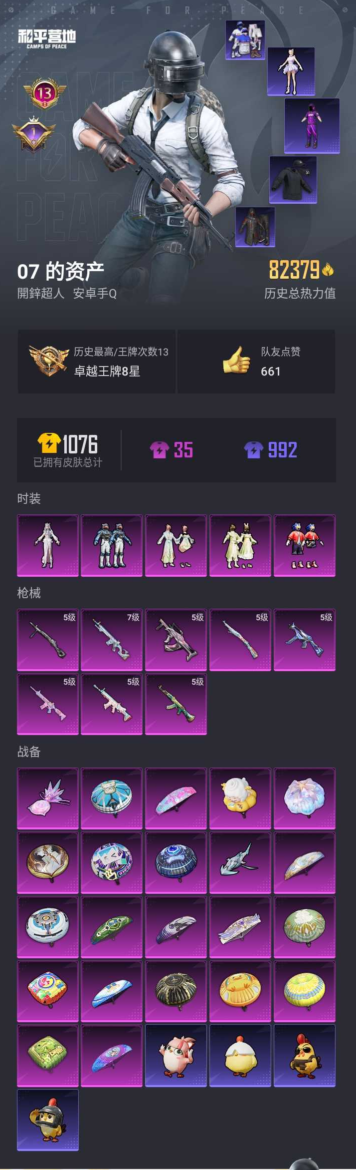 【和平精英】【lyhp18632】高印记 8w热力值 5粉装8特效呛 冷漠罗丽 闲梦青缨 奇异狩猎者 浪漫天命 满级mk12雪月幻梦地铁满天赋 5粉装,8特效呛,0载具,历史最高段位:卓越王牌8星 王牌印记13次 热力值:82419,211套装,265呛械,391装备,175战备;套装:套装-音爆索尼克,套装-闲梦青缨,套装-莲影清波,套装-未来领航者,角色-冷漠罗丽,套装-特训学院,套装-猎鹰,套装-青年教官,套装-橘黑制服,套装-红色运动,套装-黄色运动,套装-蓝色运动,套装-黄色伏地魔,套装-白色伏地魔,套装-黑色伏地魔,套装-登山爱好者,套装-竞技名士,套装-深蓝色名流,套装-酒红色名流,套装-湖蓝色名流,套装-黄色名流,套装-猛禽,套装-长空猛禽,套装-霸义无双,套装-雪鹰学院,套装-海岛探路者,套装-雨林探路者,套装-旭日情侣,套装-六六大吉,套装-冷焰舞者,套装-灼焰舞者,套装-水银刺客,套装-浪漫天命,套装-战地督导,套装-特殊使命,套装-甜蜜告白,套装-春日漫步,套装-龙腾端午,套装-滨海假日,套装-沙漠毒蛇,套装-鹰眼刺客,套装-冰冻风暴,套装-完美偶像,套装-人气偶像,套装-幻影武者,套装-热血骑手,套装-特战英豪,套装-街头潮人,套装-蓝彩潮人,套装-魅力单车,套装-绮丽涂鸦,套装-雪山征服者,套装-坚韧舞者,套装-竞技达人朋克,套装-野性战心,套装-超能勇士,套装-破晓战魂,套装-森林游猎者,套装-都市魅力,套装-热血青春,套装-沙漠兵团,套装-酷潮明星,套装-极地朋克,套装-幻世战舞者,套装-清新柠檬,套装-奇异狩猎者,套装-金耀舞者,套装-血色贵族,套装-迅捷狂鲨,套装-夏日倾情,套装-滨海厨神,套装-alan walker,套装-龙魂突击队,套装-风暴特警,套装-冰川特警,套装-元素星魂,套装-极速红龙,套装-wifi精灵,套装-麻辣教官,套装-破蛋小黄鸡,套装-精神漫游,套装-鹤鸣,套装-霓虹街区,套装-白熊同盟,套装-夏日音浪,套装-探宝勇士,套装-nv战队服,套装-牛气满满,套装-白糯汤圆,套装-玄武圣者,套装-战术大师,套装-牛气冲天,套装-ss18特训,套装-耀粉歌者,套装-飞行日记,套装-热情海星,套装-纯真浪花,套装-月影鸳鸯,角色-英勇保护者,套装-ss17特训,套装-冰爽风暴,套装-爆裂葡萄,套装-极乐追光,套装-福星高照,套装-虎虎生威吉莉,角色-军刀雅典娜,套装-异彩先驱,套装-霓虹极客,套装-空投萌叽,套装-ss19特训,套装-炫蓝之夏,套装-ss20特训,套装-猎梦纪元,套装-甜心亚梦,套装-虚音幻奏,套装-ss21特训,套装-萌趣咩咩,套装-娇憨猪猪,套装-荷畔雨呱,套装-梦幻奶油,套装-酸甜橘柚,套装-玉兔迎春,套装-ss22特训,套装-田园牧歌,套装-轻风白浪,套装-熠彩粉晶,套装-光之冒险,套装-绯格组合,套装-ss23特训,套装-神气柴柴,套装-懵萌河马,套装-王牌教练,套装-柠萌假日,套装-青玉碎影,套装-ss24特训,套装-荧惑魅影,套装-华灯初上,套装-日照花林,套装-龟仙人,套装-涂山之恋,套装-ss25特训,套装-惊鸿侠骨,套装-锦衣飞扬,套装-晨曦薄雾,套装-香桃花海,套装-深海梦境,套装-果汁能量,套装-龙的传人,套装-冰河战士,套装-ss26特训,套装-快闪甜心,套装-春光漫游,套装-漫游都市,套装-空岛之星,套装-云魄琉璃,套装-贝斯之夜,套装-焰鹰斗篷,套装-幽夜迷踪,套装-幻羽潜行,套装-ss27特训,套装-恋语绒绒,套装-老实芭蕉,套装-ss28特训,玩偶服-卖崽青蛙,角色-多纳泰罗,角色-冰公主,角色-银尘,套装-街头风暴,套装-海盐绵绵冰,套装-蝶变,套装-行星泡泡,套装-粉日山川,套装-ss29特训,套装-雏菊兔兔,套装-萝兰蝴蝶,角色-紫俏灵猫,套装-异域银装,角色-都市丽猫,套装-星途旅人,套装-ss30特训,套装-青团波波,套装-棉花软糖,角色-夜瞳黯灵,套装-糖糖葫芦,套装-ss31特训,套装-鱼渊荷华,套装-燕燕于飞,套装-智谋强哥,套装-ss33特训,套装-云朵鹅,套装-巳巳如意,套装-ss32特训,套装-顶瓜瓜,套装-雪绒豹,套装-大橘大利,套装-极速光影,套装-炫彩糖果,套装-元气之梦,套装-ss34特训,套装-擎苍青焰,套装-朱霞炽焰,套装-游乐,套装-凌霄紫焰,套装-薄荷星砂,套装-ss35特训,套装-午间小调,套装-秘语星愿,套装-风迹短诗,套装-粉黛兰香,套装-ss36特训,套装-萌鸡速递;呛皮:5级akm-绿萝繁花,akm-缤纷海域,akm-破晓战魂,akm-荒野猎神,akm-涂鸦街区,akm-彩虹符号,akm-虎虎生威,akm-环太平洋,akm-龙的传人,akm-荧星灵猫,akm-极光猎影,akm-霓彩脉冲,5级m416-电玩时刻,m416-夜灯,m416-蓝色火焰,m416-红色方程式,m416-神秘黑猫,m416-糯团青竹,aug-耀粉歌者,aug-海螺星光,aug-天降萌叽,aug-闲梦青缨,aug-异域银装,aug-冰晶雪宝,aug-紫晶流影,m762-彩虹符号,m762-橘柚倾心,m762-天降萌叽,m762-雏菊兔兔,m762-云朵鹅,m762-登顶巅峰,m16a4-蓝色火焰,m16a4-红色方程式,m16a4-甜心亚梦,m16a4-幻世战舞者,m16a4-莲影清波,m16a4-冰河战士,mk47-粉色回忆,mk47-乌木金纹,mk47-炫光之旅,mk47-风迹短诗,famas-霓彩脉冲,famas-乌木金纹,5级groza-镜光银凌,groza-影袭,groza-春暖花开,groza-异彩先驱,groza-田园牧歌,groza-懵萌河马,groza-海盐豹豹,蜜獾-娇憨猪猪,蜜獾-天降萌叽,蜜獾-精灵梦叶罗丽,蜜獾-糖糖葫芦,蜜獾-鸡智如我,蜜獾-风迹短诗,蜜獾-乌木金纹,ac-val-甜心亚梦,ac-val-乌木金纹,ac-val-天降萌叽,ac-val-闲梦青缨,ac-val-快闪甜心,5级scar-l-锦绣绵绵,scar-l-红色方程式,scar-l-致命红樱,scar-l-夜灯,scar-l-炫彩节奏,scar-l-彩虹符号,scar-l-玉兔迎春,scar-l-星途旅人,scar-l-海盐豹豹,g36c-懵萌河马,g36c-乌木金纹,q-纯真浪花,arx-凌霄紫焰,莫辛纳甘-乌木金纹,莫辛纳甘-懵萌河马,莫辛纳甘-蜜语绒猫,莫辛