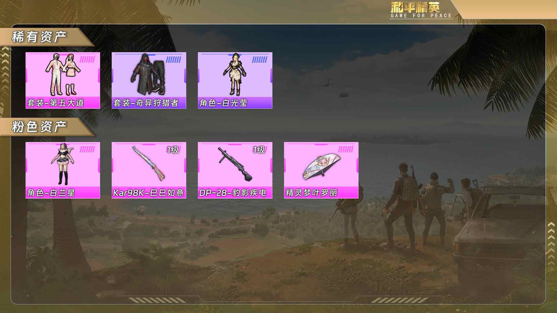 (2粉套2粉呛)第五大道/奇异狩猎者/白兰星/98k巳巳如意1级/dp28豹影疾电1级 没战神框hp5606-0粉色飞行器-8501热力值-1王牌印记-26套装-26呛皮 【热门品类】:套装-奇异狩猎者 【粉色套装】:粉装-第五大道,角色-白兰星 【粉色呛皮等级】:kar98k-巳巳如意一级,dp-28-豹影疾电一级 【粉色呛皮】:kar98k-巳巳如意,dp-28-豹影疾电 【粉色降落伞】:精灵梦叶罗丽降落伞 【稀有呛皮】:akm-灼热熔岩,m16a4-幻世战舞者,m416-摩登王国,m416-红色方程式,groza-田园牧歌,蜜獾-天降萌叽,vect-田园牧歌,kar98k-影袭,kar98k-炫彩节奏,sks-迅猛狂鲨,vss-田园牧歌,dbs-圣堂之誓,spas-12-田园牧歌,m249-糯团青竹,m249-莲影清波 【其他套装】:套装-ss19特训,套装-ss20特训,套装-ss22特训,套装-夏日音浪,套装-战地督导,套装-湖蓝色名流,套装-特训学院,套装-猎鹰,套装-白色伏地魔,套装-缤纷果语,套装-蓝彩潮人,套装-青年教官,套装-魅力单车,套装-黄色伏地魔,套装-黄色运动,套装-黑色伏地魔,套装-龙的传人,套装-奇异狩猎者,套装-轻风白浪,套装-莱茵河畔,套装-果汁能量,角色-白光莹 【稀有头盔】:幻影战神头盔3级 【稀有背包】:梦幻火箭背包2级 【营地id】:1045309073
