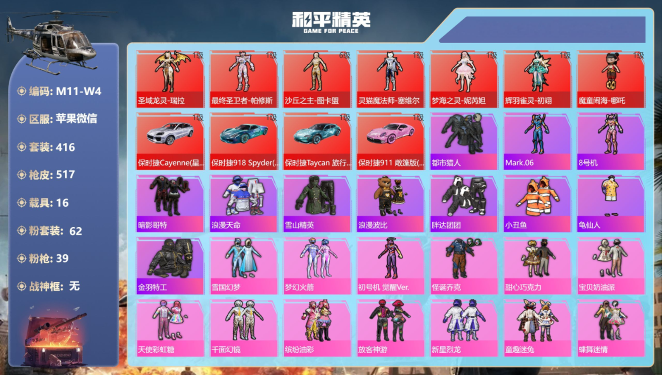 16载具-416套装-517呛皮-7红装 6级图卡盟可随意切换 雪国 小丑 满级aug-星梦奇缘9级 满级m416-灵猫魔法师9级 2稀有17载具61粉装37特效呛18印记【7红装】 魔童闹海-哪吒 1级 灵猫魔法师-塞维尔 1级 最终圣卫者-帕修斯 1级 辉羽雀灵-初翊 1级 圣域