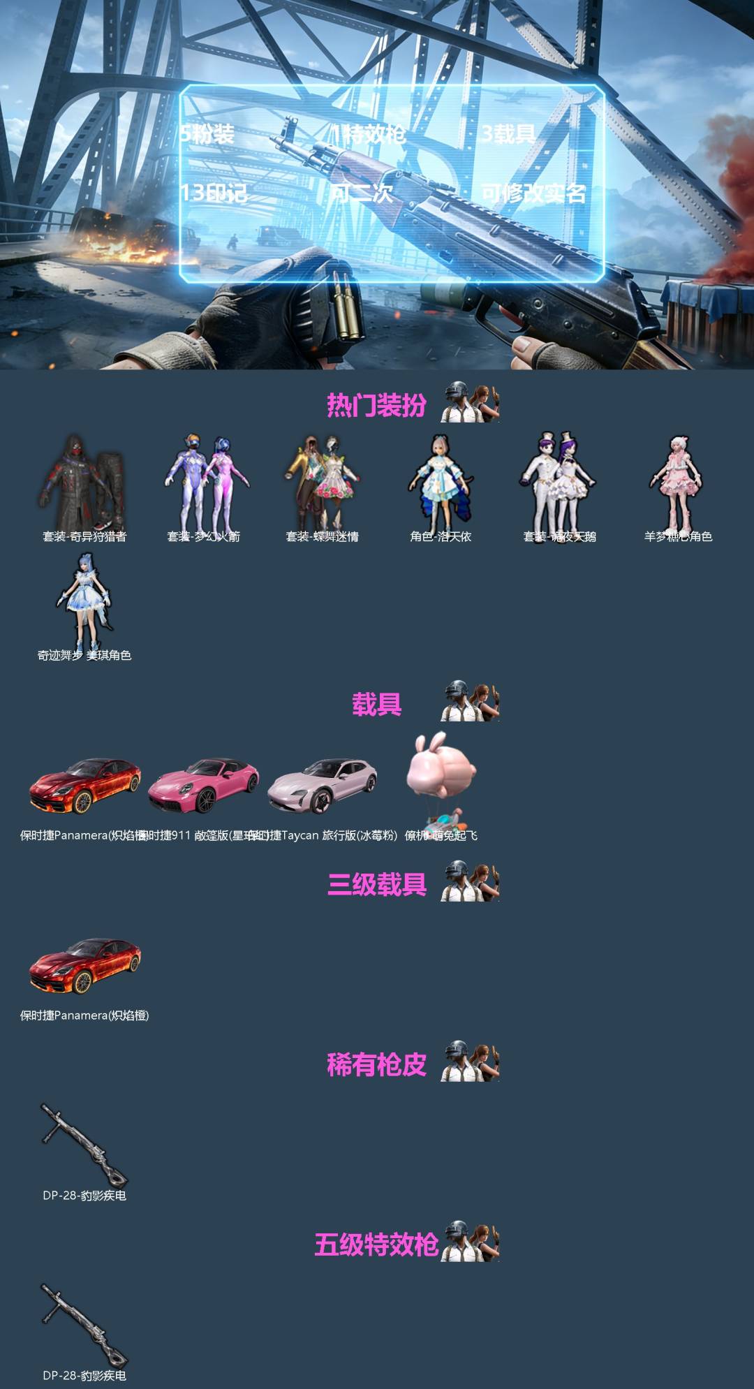 [16539742]5粉装 1特效呛 3载具 13印记 可二次 可修改实名 【热门装扮】奇迹舞步-美琪奇异狩猎者羊梦糖心梦幻火箭新101 洛天依蝶舞迷情诡夜天鹅 【载具】保时捷panamera炽焰橙保时捷taycan旅行版冰莓粉保时捷911敞篷版星珀红僚机-萌兔起飞 【稀有呛皮】dp-28-豹影疾电 【三级载具】三级保时捷panamera炽焰橙 【五级特效呛】五级dp-28-豹影疾电 【紫色装扮】凌霄紫焰朱霞炽焰擎苍青焰狂鲨锋刃ss34特训套装人气偶像冷焰舞者冰川特警极速光影云朵鹅彩虹兔雪绒豹ss33特训套装顶瓜瓜格斗先锋橘黑制服海岛探路者涂山之恋极速红龙深蓝色名流湖蓝色名流灰色格斗者灼焰舞者夏日音浪完美偶像帅气教官幻世战舞者幻影武者战地督导幻彩翩翩音速流光异彩先驱ss18特训豚鼠丹丹飞驰魅影ss19特训电音精灵天籁歌者瑞龙福将团圆交子ss17特训田园牧歌轻风白浪ss22特训妙红点点炫蓝之夏ss23特训ss20特训娇憨猪猪萌趣咩咩ss21特训绚烂繁星牛气冲天元气之梦风迹短诗午间小调秘语星愿ss35特训错位像素云魄琉璃萌鸡速递绛羽幽主喜羊羊薄荷星砂粉黛兰香琴音绮想画境星梦书海巡游绮丽涂鸦福星高照竞技达人朋克红色运动缤纷果语耀眼新星荣耀破蛋小黄鸡牛气满满破晓战魂猎鹰猛禽甜蜜告白甜蜜菠萝疯狂小兔子白色伏地魔蓝彩潮人鹤鸣霓虹极客青年教官骑行爱好者魅力单车麻辣教官黄色伏地魔黄色名流黄色运动黑色伏地魔龙的传人龟仙人蓝色运动虎虎生威吉莉街头潮人都市魅力酒红色名流长空猛禽竞技名士ss29特训白糯汤圆蜜桃派对异域银装玉兔迎春甜梦熊熊神气柴柴懵萌河马ss24特训ss24特训套装绚紫流光锦衣飞扬ss25特训惊鸿侠骨耀粉歌者大橘大利星渊小夜曲暗夜傀儡ss32特训套装绯格组合玲珑飞花蓝调潮人贵族骑装 【优质战备】无垠阁降落伞喜羊羊与灰太狼降落伞绯穹魔姬降落伞炫彩糖果降落伞炫彩糖果飞行器音爆索尼克降落伞飒粉甜心降落伞春暖花开降落伞梦幻火箭降落伞洛神天依降落伞