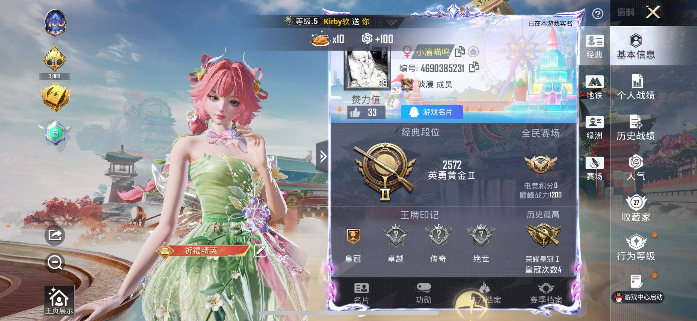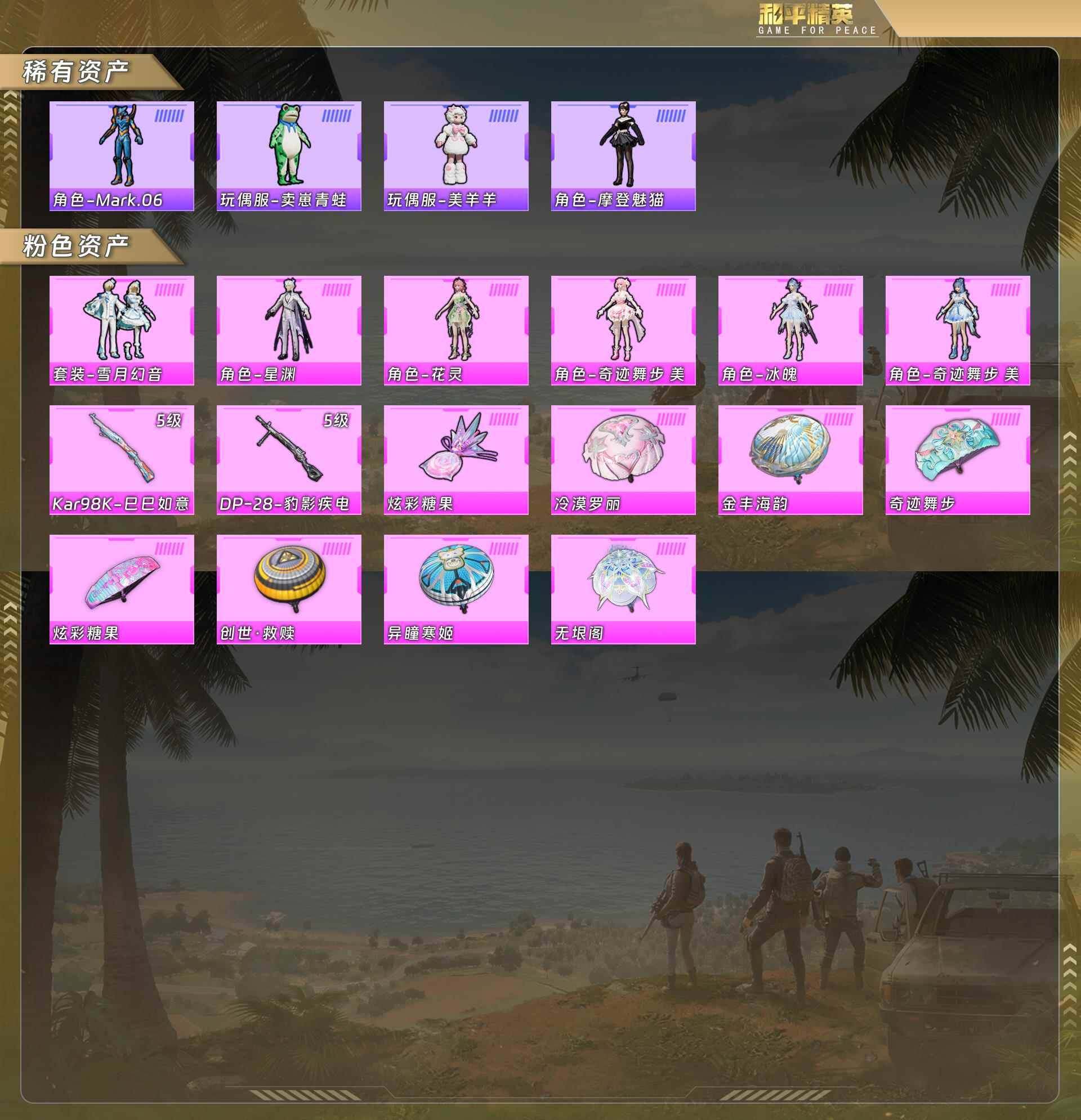 公主号-地铁满天赋-雪月幻音/星渊/花灵/奇迹舞步美雪/冰魄/奇迹舞步美琪/蓝螳螂/98k巳巳如意5级/dp28豹影疾电5级(6粉套2粉呛)没战神框hp5622-1粉色飞行器-24905热力值-1王牌印记-55套装-98呛皮 【热门品类】:角色-mark.06 【粉色套装】:粉装-雪月幻音,角色-奇迹舞步 美琪,角色-奇迹舞步 美雪,角色-花灵,角色-冰魄,角色-星渊 【粉色呛皮等级】:kar98k-巳巳如意五级,dp-28-豹影疾电五级 【粉色呛皮】:kar98k-巳巳如意,dp-28-豹影疾电 【粉色降落伞】:创世·救赎降落伞,金丰海韵降落伞,冷漠罗丽降落伞,奇迹舞步降落伞,无垠阁降落伞,异瞳寒姬降落伞,炫彩糖果降落伞 【稀有套装】:套装-巳巳如意,套装-雪国风尚,套装-炫彩糖果,角色-摩登魅猫,套装-燕燕于飞,套装-鱼渊荷华,玩偶服-美羊羊,角色-紫俏灵猫,套装-画境星梦,套装-琴音绮想 【稀有呛皮】:aug-冰晶雪宝,akm-破晓战魂,m16a4-红色方程式,scar-l-炫彩节奏,aug-耀粉歌者,aug-绝对恒星,q-彩虹符号,m762-天降萌叽,ac-val-天降萌叽,蜜獾-天降萌叽,ace32-画境星梦,uzi-啾咪啾咪,ump45-生命誓言,vect-生命誓言,汤姆逊-樱桃泡泡,mp5k-画境星梦,p90-巳巳如意,kar98k-红色方程式,vss-彩虹符号,mini14-炫彩节奏,amr-喜羊羊与灰太狼,m1加兰德-画境星梦,s686-生命誓言,dbs-创世·救赎,aa12-g-画境星梦,m249-彩虹符号,m249-破晓战魂,dp-28-彩虹符号,mg3-幻世战舞者,短管霰弹-星穹咏叹调,信号呛-奇迹舞步,爆炸猎弓-喜羊羊与灰太狼,平底锅-无垠阁,平底锅-画境星梦,破片手留单-巳巳如意 【其他套装】:套装-ss28特训,套装-ss29特训,套装-柠萌假日,套装-特战装甲,套装-竞技名士,套装-绯格组合,套装-缤纷果语,套装-长空猛禽,套装-青玉碎影,套装-顽皮玉兔,套装-魅力单车,套装-萌趣绒叽,套装-纯真浪花,套装-热情海星,角色-mark.06,套装-粉日山川 【营地id】:958475977
