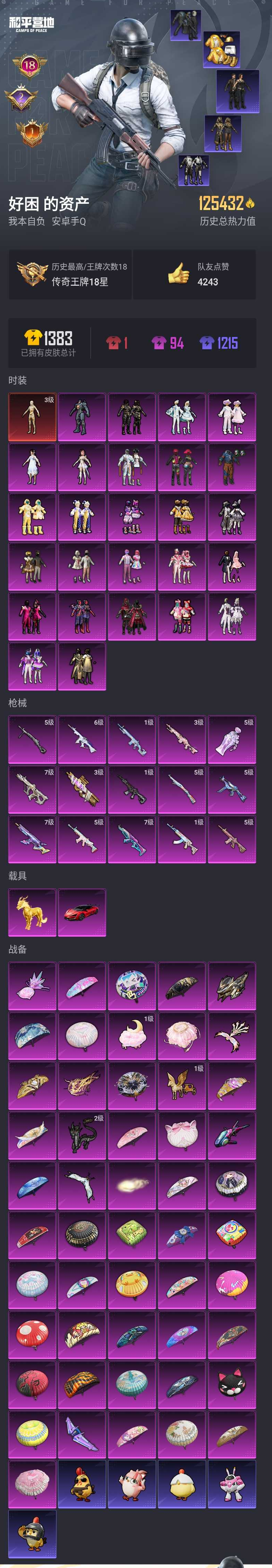 【和平精英】【lyhp21761】26粉装,15特效呛,2载具,历史最高段位:传奇王牌18星 王牌印记18次 热力值:125432,292套装,338呛械,490装备,225战备;套装:沙丘之主-图卡盟,套装-怪诞乔克,套装-甜心巧克力,套装-宝贝奶油派,套装-天使彩虹糖,套装-金风玉露,套装-智能音符,套装-放客神游,套装-迷蝶贵族,套装-馨动时刻,套装-极致幻想,套装-俏皮狐尾,套装-炙焰红王,套装-蜜桃特工,套装-蝶舞蔷薇,套装-星之彼岸,套装-黄伞悠悠,套装-黑伞漫漫,套装-蓝莓炮弹,角色-复仇流浪者,套装-精灵娃娃,套装-垂柳戏鸭,女娲后裔-赵灵儿,角色-圣堂之誓,套装-墨金战记,套装-星月云朵,套装-雪月幻音,套装-特训学院,套装-猎鹰,套装-青年教官,套装-橘黑制服,套装-红色运动,套装-黄色运动,套装-蓝色运动,套装-黄色伏地魔,套装-白色伏地魔,套装-黑色伏地魔,套装-登山爱好者,套装-竞技名士,套装-深蓝色名流,套装-酒红色名流,套装-湖蓝色名流,套装-黄色名流,套装-猛禽,套装-棕色飞行服,套装-游猎者,套装-长空猛禽,套装-漫步者,套装-竞技勇士朋克,套装-海岛探路者,套装-旭日情侣,套装-冷焰舞者,套装-都市猎人,套装-刚毅裁决者,套装-水银刺客,套装-浪漫天命,套装-特战装甲,套装-战地菁英,套装-战地督导,套装-青春校园,套装-黄色格斗者,套装-灰色格斗者,套装-甜蜜告白,套装-春日漫步,套装-燃烧卡路里,套装-滨海假日,套装-暗黑骑手,套装-鹰眼刺客,套装-冰冻风暴,套装-完美偶像,套装-人气偶像,套装-幻影武者,套装-海滨突袭者,套装-特战英豪,套装-街头潮人,套装-蓝彩潮人,套装-怒火燎原,套装-决胜时刻,套装-魅力单车,套装-绮丽涂鸦,套装-s6赛事,套装-狂战萌兔,套装-雪山征服者,套装-坚韧舞者,套装-竞技达人朋克,套装-夜莺强袭者,套装-都市漫游者,套装-狂沙舞者,套装-破晓战魂,套装-ss1特训,套装-都市魅力,套装-荣耀,套装-s5赛事,套装-热血青春,套装-沙漠兵团,套装-派对舞王,套装-丛林猎人,套装-ss2特训,套装-雪山精英,套装-酷潮明星,套装-传奇侦探,套装-极地朋克,套装-幻世战舞者,套装-奇趣章鱼,套装-王子的夏天,套装-暗影哥特,套装-迅捷狂鲨,套装-呆萌铁蟹,套装-深海小丑鱼,套装-甜蜜熊情侣,套装-青涩时光,套装-缤纷果语,套装-滨海厨神,套装-龙魂突击队,套装-冰川特警,套装-青涩年华,套装-灿烂千阳,套装-星河浪客,套装-元素星魂,套装-胖达团团,套装-极速红龙,套装-格斗先锋,套装-wifi精灵,套装-沙漠守护者,套装-ss3特训,套装-小丑鱼,套装-梦魇先生,套装-万圣娃娃,套装-黑夜传说,套装-天网终结者,套装-破蛋小黄鸡,套装-疯狂小兔子,套装-阳光火鸡,套装-ss5特训,套装-圣诞大吉,套装-冰原使者,套装-凛冬战士,套装-奇趣企鹅,套装-云虎纪,套装-金鼠迎春,套装-军械专家,套装-北国孤狼,套装-ss6特训,套装-淡雅花蕊,套装-跃动心情,套装-ss7特训,套装-鹤鸣,套装-霓虹街区,套装-暗夜契约,套装-纯白誓言,套装-激萌罗小黑,套装-ss10特训,套装-ss8特训,套装-白熊同盟,套装-萌黄之夏,套装-超能拳王,套装-动感兔斯基人偶服,套装-夏日音浪,套装-ss9特训,套装-风华少年志,套装-白月香洋装,套装-探宝勇士,套装-本愿之火,套装-辉星之火,套装-牛气满满,套装-韶华初心,套装-ss11特训,套装-青春冒险家,套装-潮流游乐家,套装-玄武圣者,套装-原初圣火,套装-逆风勇士,套装-初火先锋,套装-娴静芝兰,套装-萌趣颜团子,套装-特种颜团子,套装-战术大师,套装-ss12特训,套装-牛气冲天,套装-ss18特训,套装-闪金天王,套装-镭射皇者,套装-银白舞王,套装-耀粉歌者,套装-暗影爵士,套装-暗黑裁决,套装-迅捷之星,套装-治愈之星,套装-科技之星,套装-萌主吾皇,套装-飞行日记,套装-ss13特训,套装-光影梦想家,套装-梦起落英,套装-星河入梦,套装-曼妙人鱼,套装-热情海星,套装-纯真浪花,套装-冰爽海盐,套装-ss14特训,套装-吉莉礼服,套装-微雨春柳,套装-暖风夏荷,套装-快乐星愿,套装-ss15特训,套装-rsg追光队服,套装-ss16特训,套装-暴风机械师,套装-时空追击者,套装-星辰守护者,套装-ss17特训,套装-瑞龙福将,套装-团圆交子,套装-爆裂葡萄,套装-极乐追光,套装-福星高照,套装-虎虎生威吉莉,套装-异彩先驱,套装-霓虹极客,套装-空投萌叽,套装-tt战队服,套装-ss20特训,套装-ss21特训,套装-萌趣咩咩,套装-娇憨猪猪,套装-荷畔雨呱,角色-赵灵儿,套装-ss22特训,套装-光之冒险,套装-霓彩缤纷,套装-王牌教练,套装-软软马卡龙,套装-龟仙人,套装-惊鸿侠骨,套装-锦衣飞扬,套装-香桃花海,套装-深海梦境,套装-冰河战士,套装-快闪甜心,套装-春光漫游,套装-空岛之星,套装-焰鹰斗篷,套装-幽夜迷踪,套装-幻羽潜行,套装-ss27特训,套装-恋语绒绒,套装-老实芭蕉,套装-ss28特训,角色-蝶吟花词,角色-8号机,角色-mark.06,套装-海盐绵绵冰,套装-蝶变,套装-创世·幻影,套装-雪夜云雾,套装-ss29特训,套装-雏菊兔兔,套装-萝兰蝴蝶,套装-鹿角斗士,套装-晨曦轻云,角色-紫俏灵猫,套装-异域银装,套装-星途旅人,角色-许七安,角色-怀庆长公主,角色-临安公主,套装-ss30特训,套装-青团波波,套装-棉花软糖,套装-糖糖葫芦,套装-ss31特训,套装-鱼渊荷华,套装-燕燕于飞,套装-荒漠狂战,套装-ss33特训,套装-烈焰独狼,套装-巳巳如意,套装-青翼流星,套装-风舞幻音,套装-樱梦幻音,套装-顶瓜瓜,套装-狂鲨锋刃,角色-时希公主,套装-炫彩糖果,套装-元气之梦,套装-ss34特训,套装-薄荷星砂,套装-ss35特训,套装-ss37特训,套装-