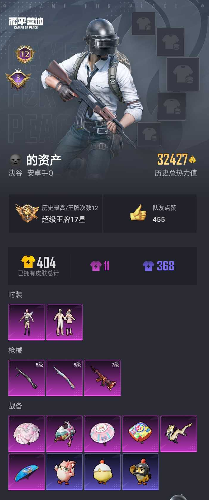 【和平精英】【lyhp21768】2粉装,3特效呛,0载具,历史最高段位:超级王牌17星 王牌印记12次 热力值:32427,74套装,115呛械,131装备,69战备;套装:套装-第五大道,角色-茉莉星,套装-冰川格斗者,套装-长空猛禽,套装-雨林探路者,套装-六六大吉,套装-贵族骑装,套装-特殊使命,套装-千禧之恋,套装-野性战心,套装-荣耀,套装-缤纷果语,套装-粉红小猪,套装-鹤鸣,套装-战术大师,套装-耀粉歌者,套装-热情海星,套装-纯真浪花,角色-英勇保护者,套装-胡桃卫兵,套装-绯格组合,套装-ss23特训,套装-神气柴柴,套装-懵萌河马,套装-灵蜜圈圈,套装-妙红点点,套装-幻彩翩翩,套装-王牌教练,套装-柠萌假日,套装-青玉碎影,套装-ss24特训,套装-银松藏云,套装-龟仙人,套装-涂山之恋,套装-ss25特训,套装-惊鸿侠骨,套装-锦衣飞扬,套装-香桃花海,套装-龙的传人,套装-ss26特训,套装-漫游都市,套装-空岛之星,套装-童真绒兔,套装-焰鹰斗篷,套装-幽夜迷踪,套装-幻羽潜行,套装-ss27特训,套装-老实芭蕉,套装-ss28特训,套装-alan walker电音教主,角色-冰公主,套装-海盐绵绵冰,套装-蝶变,套装-ss29特训,套装-异域银装,套装-ss30特训,角色-夜瞳黯灵,套装-ss31特训,套装-ss33特训,套装-云朵鹅,套装-巳巳如意,套装-ss32特训,套装-彩虹兔,套装-顶瓜瓜,套装-雪绒豹,套装-大橘大利,套装-星渊小夜曲,套装-ss34特训,套装-擎苍青焰,套装-朱霞炽焰,套装-游乐,套装-凌霄紫焰,套装-薄荷星砂,套装-ss35特训;呛皮:groza-影袭,groza-懵萌河马,蜜獾-千面幻镜,蜜獾-天降萌叽,蜜獾-乌木金纹,scar-l-红色方程式,scar-l-炫彩节奏,scar-l-玉兔迎春,scar-l-海盐豹豹,aug-天降萌叽,aug-异域银装,m762-暗夜鎏金,m762-第五大道,m762-天降萌叽,m762-云朵鹅,ac-val-乌木金纹,ac-val-天降萌叽,mk47-妙红点点,famas-乌木金纹,7级m416-风花雪月,m416-红色方程式,m416-糯团青竹,m416-摩登王国,q-彩虹符号,q-纯真浪花,g36c-懵萌河马,akm-霓虹街区,akm-龙的传人,arx-凌霄紫焰,m16a4-冰河战士,svd-云朵鹅,5级kar98k-巳巳如意,kar98k-彩虹符号,kar98k-顶峰精英,awm-飒粉甜心,awm-焰鹰斗篷,awm-纯真浪花,莫辛纳甘-乌木金纹,莫辛纳甘-懵萌河马,amr-妙红点点,amr-乌木金纹,m24-奇异狩猎者,m24-拂晓神骑,m200-惊鸿侠骨,m200-乌木金纹,m417-惊鸿侠骨,m417-玩趣呆呆,vss-彩虹符号,vss-香桃花海,mk20-h-星途旅人,mk20-h-乌木金纹,slr-彩虹符号,sks-糯团青竹,sks-未来歌姬,mini14-涂山之恋,mini14-香桃花海,mk14-薄荷星砂,p90-巳巳如意,p90-乌木金纹,汤姆逊-天降萌叽,汤姆逊-纯真浪花,ump45-涂山之恋,ump45-繁龙极客,ump45-海盐豹豹,aks-74u-鸡智如我,aks-74u-乌木金纹,vect-彩虹符号,vect-焰鹰斗篷,uzi-天降萌叽,uzi-啾咪啾咪,mp5k-乌木金纹,js9-凌霄紫焰,s686-奇异狩猎者,s686-彩虹符号,s686-白勺歌姬,s1897-糯团青竹,dbs-焰鹰斗篷,dbs-乌木金纹,s12k-玩趣呆呆,spas-12-云朵鹅,spas-12-乌木金纹,aa12-g-纯真浪花,5级dp-28-豹影疾电,dp-28-焰鹰斗篷,dp-28-alan walker潮音版,m249-彩虹符号,m249-糯团青竹,m249-妙红点点,mg-36-凌霄紫焰,mg3-幻世战舞者,mg3-妙红点点,mg3-摩登王国,mg3-惊鸿侠骨,mg3-霓彩脉冲,pkm-懵萌河马,r45-幻彩电音,p92-凌霄紫焰,沙墨之鹦-云朵鹅,平底锅-妙红点点,平底锅-懵萌河马,平底锅-惊鸿侠骨,平底锅-焰鹰斗篷,平底锅-精灵梦叶罗丽,平底锅-纯真浪花,平底锅-属我最6,平底锅-凌霄紫焰,撬棍-alan walker潮音版,大砍刀-鬼刀,大砍刀-云朵鹅,盐雾蛋-冰氧夏日,十子怒-异域银装,破片手留单-星途旅人,破片手留单-海盐豹豹,破片手留单-巳巳如意,爆炸猎弓-惊鸿侠骨;降落伞:黄族统领飞行器,智趣喵喵飞行器,空岛之星尾迹,异域银装飞行器,顶峰精英尾迹,狂鲨锋刃飞行器,破刃行动尾迹; 详情看图高印记 2粉装3特效呛 第五大道 满级m4风花雪月