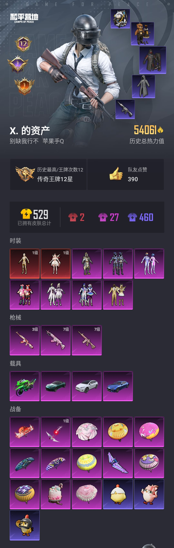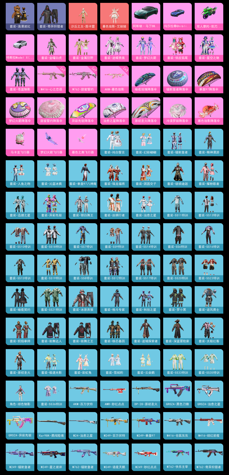 【和平精英】【lyhp21773】7粉装,3特效呛,4载具,历史最高段位:传奇王牌12星 王牌印记12次 热力值:54061,110套装,142呛械,169装备,84战备;套装:沙丘之主-图卡盟,暮色玫影-艾丽娅,套装-金曜白虎,套装-梦幻火箭,套装-金属狂野,套装-迷蝶贵族,套装-星空之魅,套装-俏皮狐尾,套装-苍蓝魅影,套装-骑行爱好者,套装-竞技名士,套装-湖蓝色名流,套装-长空猛禽,套装-竞技勇士朋克,套装-特战装甲,套装-街舞之王,套装-街舞达人,套装-灰色格斗者,套装-甜蜜告白,套装-滨海假日,套装-千禧之恋,套装-怒火燎原,套装-绮丽涂鸦,套装-耀眼新星,套装-雪山征服者,套装-都市漫游者,套装-丛林猎人,套装-雪山精英,套装-传奇侦探,套装-冰原奔狼,套装-奇异狩猎者,套装-向日葵先生,套装-青涩时光,套装-缤纷果语,套装-滨海厨神,套装-格斗先锋,套装-太极红客,套装-海上生明月,套装-破蛋小黄鸡,套装-疯狂小兔子,套装-深蓝冒险家,套装-迷域探索者,套装-ss5特训,套装-圣诞大吉,套装-冰原使者,套装-凛冬战士,套装-浪漫波比,套装-北国孤狼,套装-ss6特训,套装-拳皇97八神庵,套装-炽焰拳师,套装-格斗专家,套装-跃动心情,套装-ss7特训,套装-核芯基因,套装-精神漫游,套装-霓虹街区,套装-暗夜契约,套装-纯白誓言,套装-罗小黑,套装-ss10特训,套装-ss8特训,套装-萌黄之夏,套装-人鱼之吻,套装-夏日音浪,套装-ss9特训,套装-丝绸行者,套装-牛气满满,套装-ss11特训,套装-骁骑迪迦,套装-原初圣火,套装-逆风勇士,套装-ss12特训,套装-牛气冲天,套装-ss18特训,套装-镭射皇者,套装-银白舞王,套装-耀粉歌者,套装-迅捷之星,套装-治愈之星,套装-科技之星,套装-飞行日记,套装-ss13特训,套装-ss14特训,套装-吉莉礼服,套装-ss15特训,套装-ss16特训,套装-ss17特训,套装-瑞龙福将,套装-团圆交子,套装-福星高照,套装-虎虎生威吉莉,套装-异彩先驱,套装-霓虹极客,套装-空投萌叽,套装-ss19特训,套装-沁蓝冰爽,套装-ss20特训,套装-ss21特训,套装-ss23特训,套装-幻彩翩翩,套装-龟仙人,角色-绯色魅影,套装-ss33特训,套装-云朵鹅,套装-彩虹兔,套装-雪绒豹,套装-极速光影,套装-ss35特训,套装-ss36特训;呛皮:3级akm-暮色玫影,akm-灼热熔岩,akm-百万伏特,akm-霓虹街区,akm-夜灯,akm-彩虹符号,akm-虎虎生威,akm-乌木金纹,7级m762-甜蜜誓约,m762-快乐主宰,m762-奇异狩猎者,m762-拳皇97,m762-牛气冲天,m762-镭射皇者,m762-瑞龙福将,m762-云朵鹅,groza-黑色刀锋,groza-治愈之星,groza-异彩先驱,groza-暮色玫影,groza-乌木金纹,7级m416-心之恋语,m416-夜灯,m416-蓝色火焰,m416-绯红前夜,m416-仓鼠灰灰,scar-l-红色方程式,scar-l-金风玉露,scar-l-炫彩节奏,m16a4-红色方程式,m16a4-夜灯,g36c-乌木金纹,q-原初圣火,q-乌木金纹,aug-天降萌叽,aug-乌木金纹,mk47-百万伏特,mk47-乌木金纹,mk47-妙红点点,ace32-冰晶雪宝,famas-乌木金纹,ac-val-霁蓝缠春,kar98k-红色方程式,kar98k-勇闯险境,kar98k-彩虹符号,kar98k-乌木金纹,莫辛纳甘-乌木金纹,win94-瑞龙福将,m24-冰封烈焰,m24-治愈之星,m24-乌木金纹,svd-云朵鹅,awm-暮色玫影,awm-乌木金纹,amr-妙红点点,sks-夜灯,sks-勇闯险境,vss-黑色刀锋,vss-镭射皇者,vss-乌木金纹,mini14-穿刺龙虾,mini14-原初圣火,mini14-炫彩节奏,mini14-耀粉歌者,mini14-异彩先驱,mk12-乌木金纹,m417-玩趣呆呆,mk14-治愈之星,mk14-乌木金纹,slr-四圣焕新,vect-生命誓言,vect-黑色刀锋,vect-彩虹符号,vect-治愈之星,vect-乌木金纹,ump45-夜灯,ump45-生命誓言,ump45-快乐主宰,ump45-春暖花开,ump45-绿洲时空,野牛-夜灯,野牛-乌木金纹,汤姆逊-奇异狩猎者,汤姆逊-勇闯险境,汤姆逊-炫彩节奏,汤姆逊-异彩先驱,汤姆逊-乌木金纹,uzi-炫彩节奏,uzi-天降萌叽,uzi-乌木金纹,mp5k-甜蜜誓约,mp5k-异彩先驱,aks-74u-鸡智如我,spas-12-云朵鹅,s1897-百万伏特,s1897-勇闯险境,s1897-镭射皇者,s1897-炫彩节奏,s1897-荧海星豚,s1897-乌木金纹,s12k-夜灯,s12k-瑞龙福将,s12k-幻世战舞者,s12k-乌木金纹,s686-冰封烈焰,dbs-幻彩电音,mg-36-薄荷星砂,dp-28-原初圣火,dp-28-乌木金纹,m249-百万伏特,m249-拳皇97,m249-镭射皇者,m249-星之彼岸,m249-诡夜天鹅,m249-妙红点点,m249-乌木金纹,mg3-瑞龙福将,mg3-妙红点点,沙墨之鹦-云朵鹅,p18c-百万伏特,p18c-原初圣火,p92-拳皇97,p1911-冰封烈焰,信号呛-异瞳寒姬,平底锅-冰封烈焰,平底锅-拳皇97,平底锅-黑色刀锋,平底锅-勇闯险境,平底锅-原初圣火,平底锅-镭射皇者,平底锅-飞行日记,平底锅-治愈之星,平底锅-瑞龙福将,平底锅-空投萌叽,平底锅-异彩先驱,平底锅-妙红点点,撬棍-快乐主宰,撬棍-传奇侦探,撬棍-暮色玫影,大砍刀-云朵鹅,盐雾蛋-冰氧夏日,破片手留单-潮萌小黄鸭;载具:玛莎拉蒂ghibli蓝,阿斯顿·马丁dbs绿,双人摩托-双刃魅影绿,特斯拉model x珍珠白;降落伞:梦幻火箭飞行器,马卡龙飞行器,暮色之舞飞行器,粉色滑翔尾迹,霓虹街区飞行器; 详情看图2红装7粉装3特效呛4载具【1级图卡盟/艾丽娅】梦幻火箭 金属狂野 浪漫波比 奇异狩猎者 猫包 3级暮色ak 满级恋语m4 满级762 老款蓝玛莎 马丁