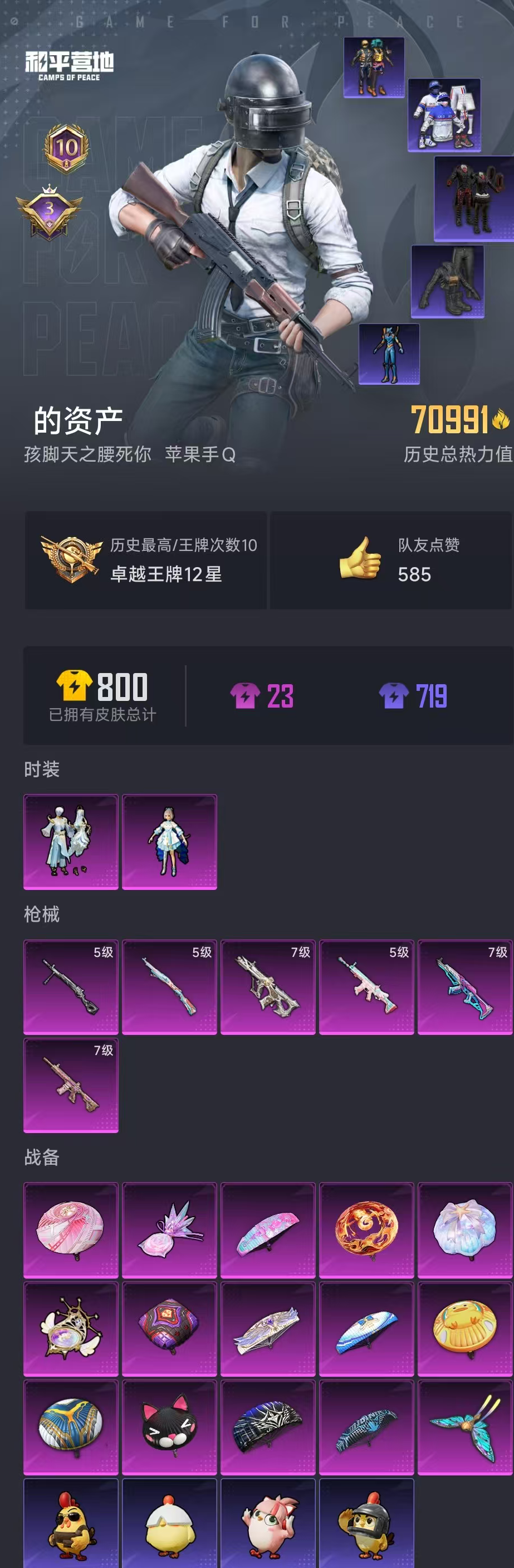 【和平精英】【lyhp21318】2粉装,6特效呛,0载具,历史最高段位:卓越王牌12星 王牌印记10次 热力值:70991,156套装,222呛械,276装备,119战备;套装:角色-洛天依,套装-金丰海韵,套装-黑色伏地魔,套装-竞技名士,套装-湖蓝色名流,套装-长空猛禽,套装-漫步者,套装-竞技勇士朋克,套装-蓝色守护者,套装-海岛探路者,套装-旭日情侣,套装-浪漫天命,套装-特战装甲,套装-贵族骑装,套装-战地督导,套装-青春校园,套装-甜蜜告白,套装-鹰眼刺客,套装-冰冻风暴,套装-幻影武者,套装-蓝彩潮人,套装-怒火燎原,套装-魅力单车,套装-绮丽涂鸦,套装-雪山征服者,套装-坚韧舞者,套装-都市漫游者,套装-森林游猎者,套装-都市魅力,套装-风行保卫者,套装-热血青春,套装-雪山精英,套装-酷潮明星,套装-传奇侦探,套装-幻世战舞者,套装-甜蜜菠萝,套装-暗影哥特,套装-深海小丑鱼,套装-甜蜜熊情侣,套装-缤纷果语,套装-龙魂突击队,套装-格斗先锋,套装-麻辣教官,套装-疯狂小兔子,套装-机械征服者,套装-ss5特训,套装-圣诞大吉,套装-冰原使者,套装-凛冬战士,套装-北国孤狼,套装-ss6特训,套装-拳皇97八神庵,套装-炽焰拳师,套装-格斗专家,套装-跃动心情,套装-ss7特训,套装-霓虹街区,套装-ss10特训,套装-ss8特训,套装-软萌银虎,套装-萌黄之夏,套装-夏日音浪,套装-ss9特训,套装-神奈川冲浪里,套装-牛气满满,套装-玫瑰恋情,套装-童话森林,套装-ss11特训,套装-原初圣火,套装-逆风勇士,套装-萌趣颜团子,套装-战术大师,套装-ss12特训,套装-牛气冲天,套装-ss18特训,套装-治愈之星,套装-科技之星,套装-ss13特训,套装-曼妙人鱼,套装-热情海星,套装-纯真浪花,套装-浪漫樱花,套装-ss14特训,角色-迪迦奥特曼,角色-艾克斯奥特曼,套装-ss15特训,套装-ss16特训,套装-暗夜魅影,套装-ss17特训,套装-瑞龙福将,套装-团圆交子,套装-豚鼠丹丹,套装-雪兔飞飞,套装-虎虎生威吉莉,套装-ss19特训,套装-飞驰魅影,套装-音速流光,套装-炫蓝之夏,套装-ss20特训,套装-ss21特训,套装-萌趣咩咩,套装-娇憨猪猪,套装-玉兔迎春,套装-ss22特训,套装-田园牧歌,套装-轻风白浪,套装-光之冒险,套装-ss23特训,套装-王牌教练,套装-ss24特训,套装-ss25特训,套装-惊鸿侠骨,套装-锦衣飞扬,套装-香桃花海,套装-冰河战士,套装-ss26特训,套装-快闪甜心,套装-春光漫游,套装-空岛之星,套装-ss27特训,套装-老实芭蕉,套装-ss28特训,角色-mark.06,套装-街头风暴,套装-海盐绵绵冰,套装-创世·追猎,套装-ss29特训,套装-雏菊兔兔,套装-萝兰蝴蝶,角色-绯色魅影,套装-异域银装,套装-星途旅人,套装-ss30特训,套装-青团波波,角色-夜瞳黯灵,套装-糖糖葫芦,套装-ss31特训,套装-ss33特训,套装-巳巳如意,套装-ss32特训,套装-狂鲨锋刃,套装-大橘大利,套装-炫彩糖果,套装-元气之梦,套装-ss34特训,套装-擎苍青焰,套装-朱霞炽焰,套装-凌霄紫焰,套装-薄荷星砂,套装-ss35特训,套装-午间小调,套装-秘语星愿,套装-风迹短诗,套装-ss36特训,套装-雪国风尚,套装-萌鸡速递;呛皮:groza-影袭,groza-马卡龙,groza-治愈之星,groza-田园牧歌,groza-海盐豹豹,groza-乌木金纹,7级m416-心之恋语,m416-夜灯,m416-绿野极光,m416-乌木金纹,m762-拳皇97,m762-牛气冲天,m762-瑞龙福将,m762-橘柚倾心,m762-天降萌叽,m762-雏菊兔兔,m762-乌木金纹,7级akm-梦之光华,akm-玉龙,akm-缤纷海域,akm-夜灯,akm-锦绣火鲤,akm-涂鸦街区,akm-萌趣颜团子,akm-虎虎生威,akm-霓彩脉冲,akm-乌木金纹,m16a4-机械英豪,m16a4-幻世战舞者,m16a4-冰河战士,arx-凌霄紫焰,5级scar-l-锦绣绵绵,scar-l-金风玉露,scar-l-夜灯,scar-l-炫彩节奏,scar-l-彩虹符号,scar-l-海盐豹豹,scar-l-净心行者,scar-l-乌木金纹,g36c-乌木金纹,7级aug-许七安,aug-异域银装,aug-焰舞炽心,aug-冰晶雪宝,aug-乌木金纹,蜜獾-娇憨猪猪,蜜獾-精灵梦叶罗丽,蜜獾-糖糖葫芦,蜜獾-风迹短诗,蜜獾-乌木金纹,ace32-冰晶雪宝,q-原初圣火,q-飞驰魅影,q-纯真浪花,q-乌木金纹,famas-霓彩脉冲,famas-乌木金纹,mk47-乌木金纹,mk47-风迹短诗,ac-val-乌木金纹,ac-val-天降萌叽,ac-val-快闪甜心,win94-机械英豪,win94-瑞龙福将,win94-乌木金纹,m24-影袭,m24-冰封烈焰,m24-治愈之星,m24-天降萌叽,m24-乌木金纹,5级kar98k-巳巳如意,kar98k-红色方程式,kar98k-影袭,kar98k-彩虹符号,kar98k-飞驰魅影,kar98k-乌木金纹,awm-荒野猎神,awm-恐龙拽拽,awm-圣堂之誓,awm-纯真浪花,awm-乌木金纹,莫辛纳甘-乌木金纹,莫辛纳甘-风迹短诗,m200-惊鸿侠骨,m200-乌木金纹,amr-鸡智如我,amr-喜羊羊与灰太狼,amr-乌木金纹,mk20-h-快闪甜心,mk20-h-星途旅人,mk20-h-糖糖葫芦,mk20-h-狂鲨锋刃,mk20-h-乌木金纹,vss-繁花小夜曲,vss-田园牧歌,vss-香桃花海,vss-乌木金纹,mk14-治愈之星,mk14-乌木金纹,mk14-冰河战士,mk14-薄荷星砂,mk14-紫晶流影,mini14-银河战甲,mini14-原初圣火,mini14-炫彩节奏,mini14-海渊国主,mini14-香桃花海,mini14-雏菊兔兔,sks-夜灯,sks-糯团青竹,mk12-风迹短诗,mk12-乌木金纹,m417-惊鸿侠骨,slr-四圣焕新,slr-娇憨猪猪,slr-金丰海韵,slr-霓彩脉冲,aks-74u-乌木金纹,p90-飞驰魅影,p90-快闪甜心,p90-巳巳如意,p90-乌木金纹,野牛-机械英豪,野牛-雏菊兔兔,野牛-乌木金纹,汤姆逊-庄周梦蝶,汤姆逊-环太平洋,汤姆逊-纯真浪花,汤姆逊-乌木金纹,ump45-夜灯,ump45-蓝色火焰,ump45-诡娃娃,ump45-糖糖葫芦,ump45-绒宝小鹅,vect-生命誓言,vect-彩虹符号,vect-治愈之星,vect-田园牧歌,vect-乌木金纹,uzi-红色方程式,uzi-影袭,uzi-炫彩节奏,uzi-娇憨猪猪,uzi-冰河战士,uzi-炫彩糖果,js9-凌霄紫焰,mp5k-蓝莓炮弹,m