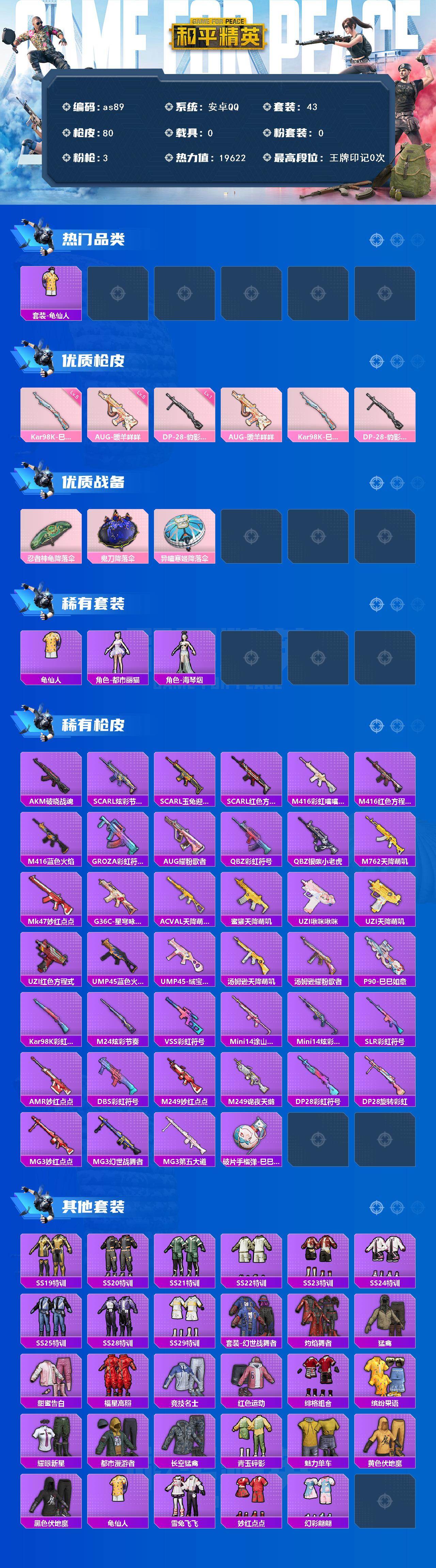 安卓 手q-0粉装-3特效呛-0载具-0粉色飞行器-19622热力值-1王牌印记-43套装-80呛皮 【热门品类】:套装-龟仙人 【粉色呛皮等级】:aug-暖羊咩咩五级,kar98k-巳巳如意五级,dp-28-豹影疾电一级 【粉色呛皮】:aug-暖羊咩咩,kar98k-巳巳如意,dp-2