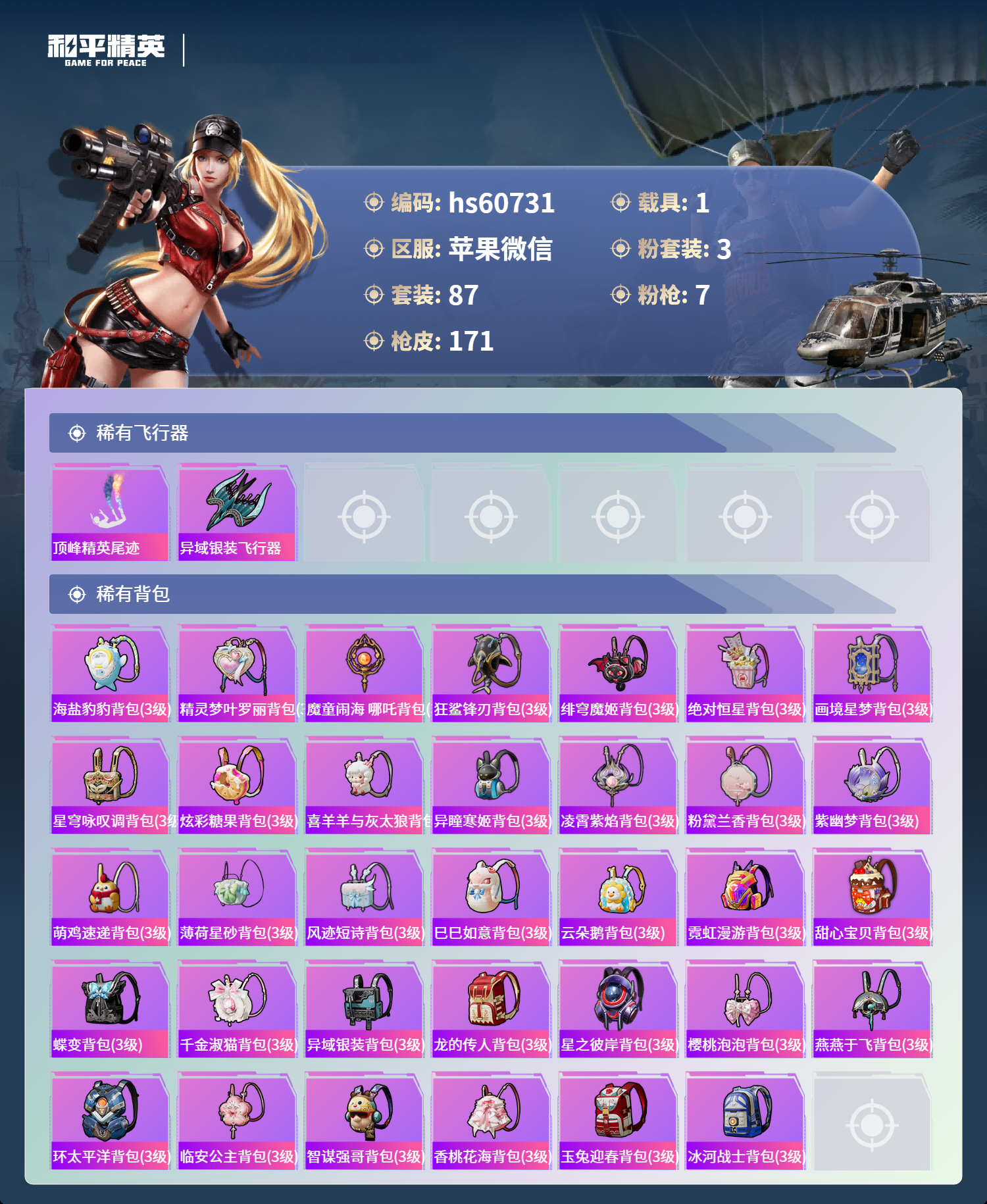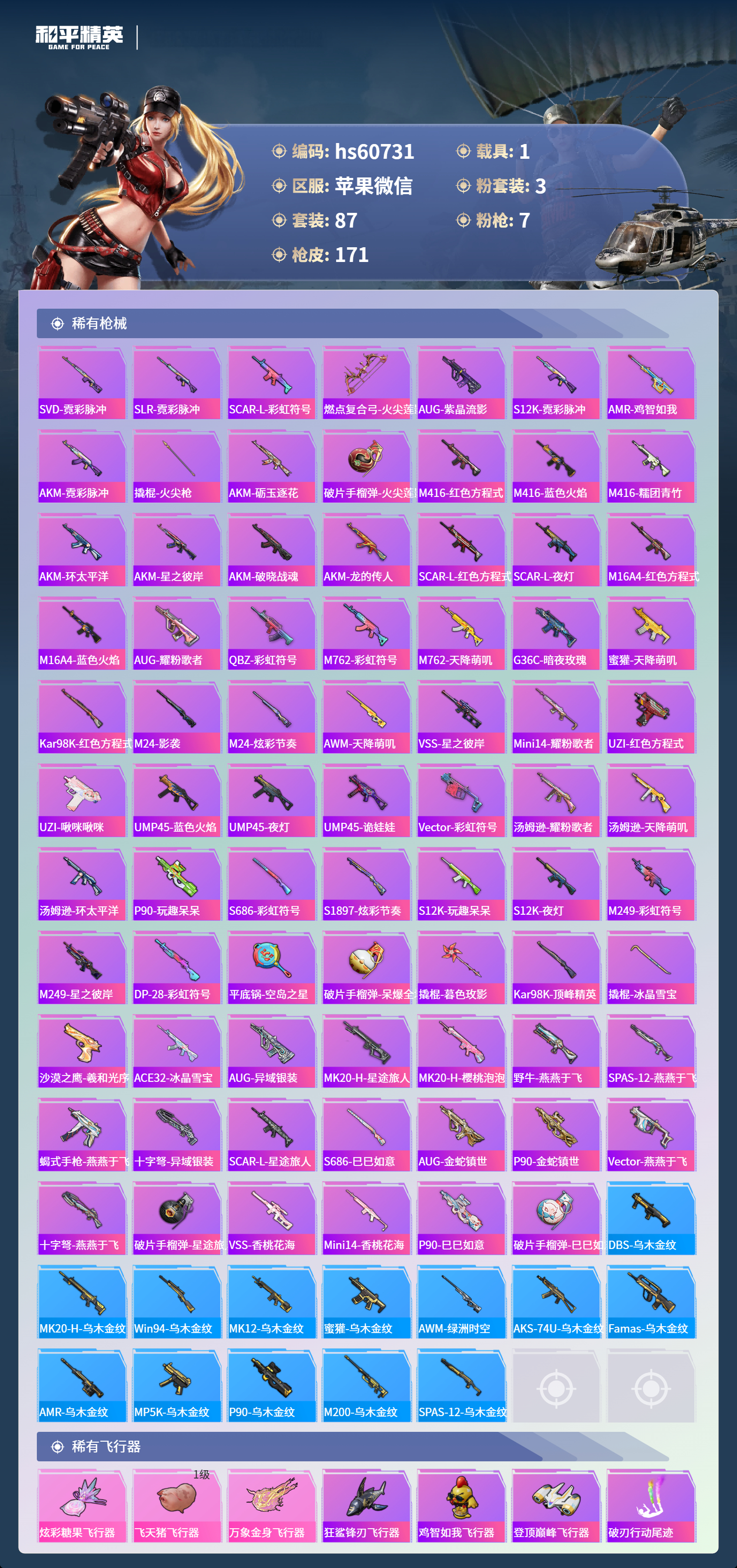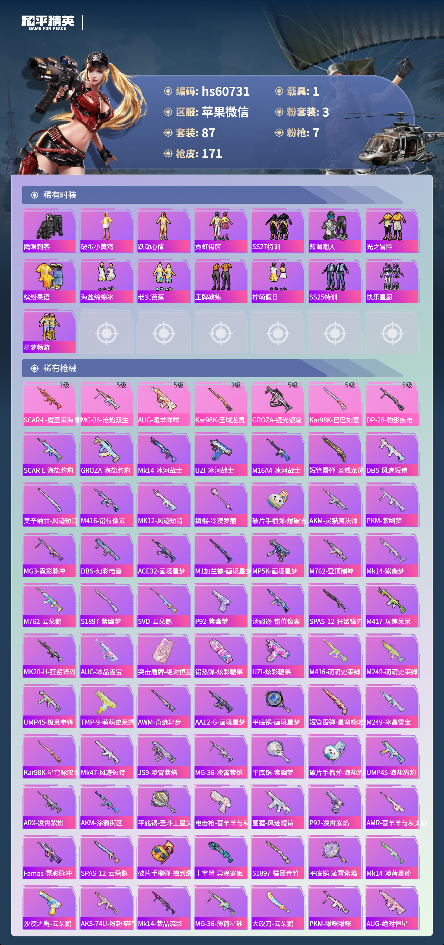 1载具-87套装-171呛皮-hs60731 苹果微信-6王牌印记-3粉装-7特效呛-1载具-47390热力值-87套装-171呛皮-2卓越印记【3粉装】角色-绝对恒星角色-绯穹魔姬角色-羊梦糖心【7特效呛】scar-l-魔童闹海 哪吒/3级mg-36-沧焰双生/5级dp-28-豹影疾电/5级kar98k-巳巳如意/5级groza-镜光银凌/5级aug-暖羊咩咩/5级kar98k-圣域龙灵/3级【4稀有紫