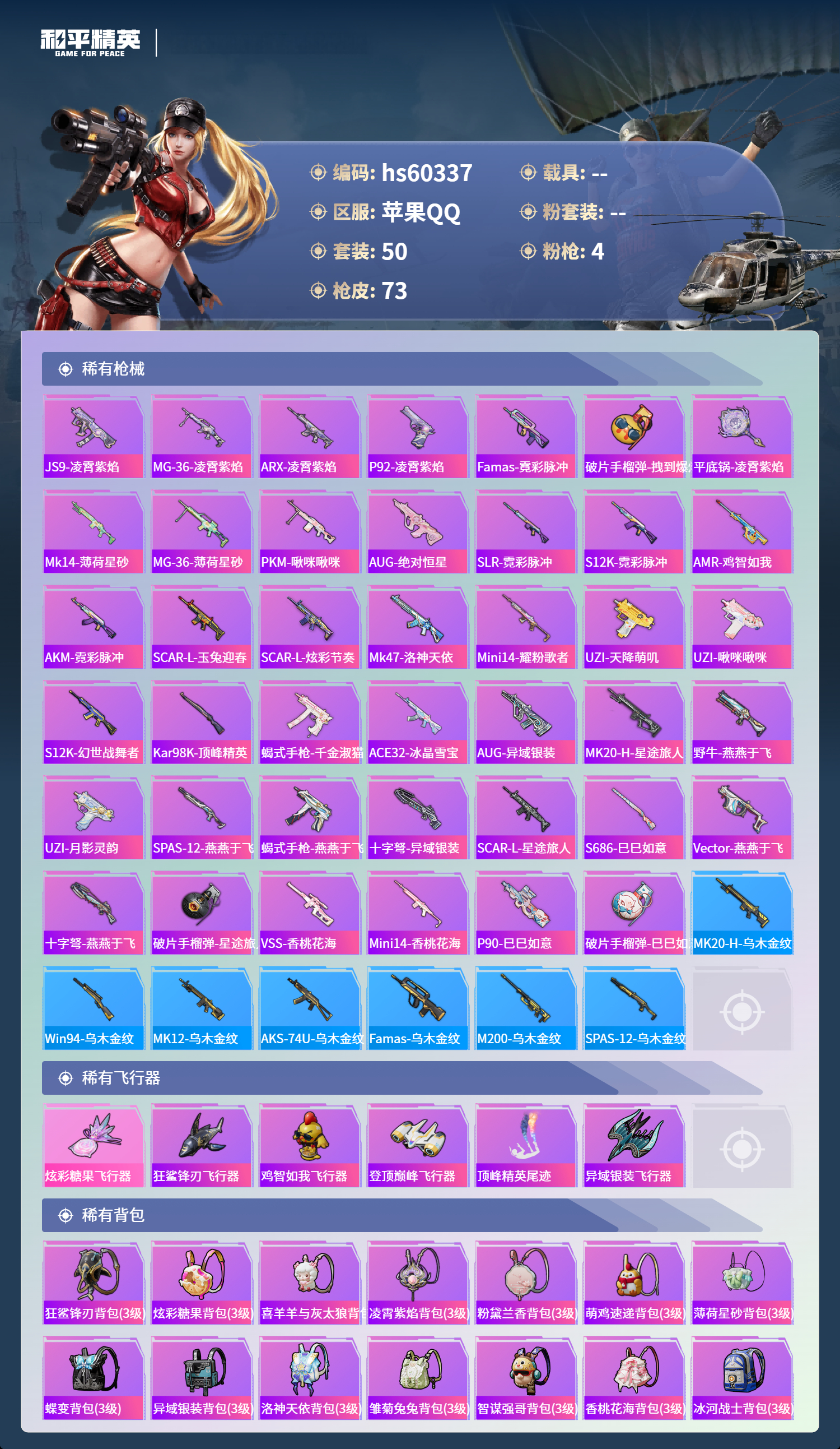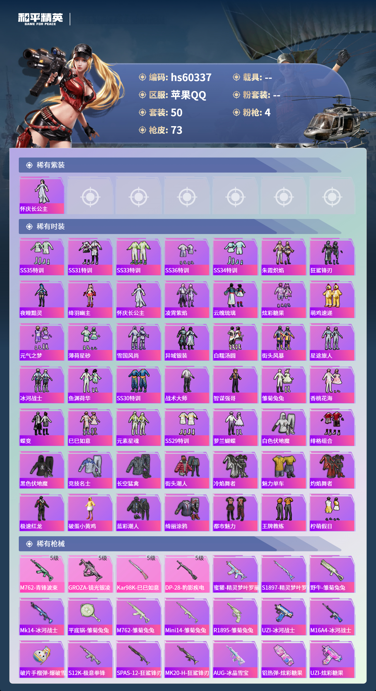 hs60337 苹果手q-5王牌印记-4特效呛-20074热力值-50套装-73呛皮-1卓越印记【4特效呛】kar98k-巳巳如意/5级dp-28-豹影疾电/5级groza-镜光银凌/5级m762-青锋波束/5级【1稀有紫装】怀庆长公主【49稀有时装】ss35特训ss31特训ss33特训ss36特训ss34特训朱霞炽焰狂鲨锋刃夜瞳黯灵绛羽幽主怀庆长公主凌霄紫焰云魄