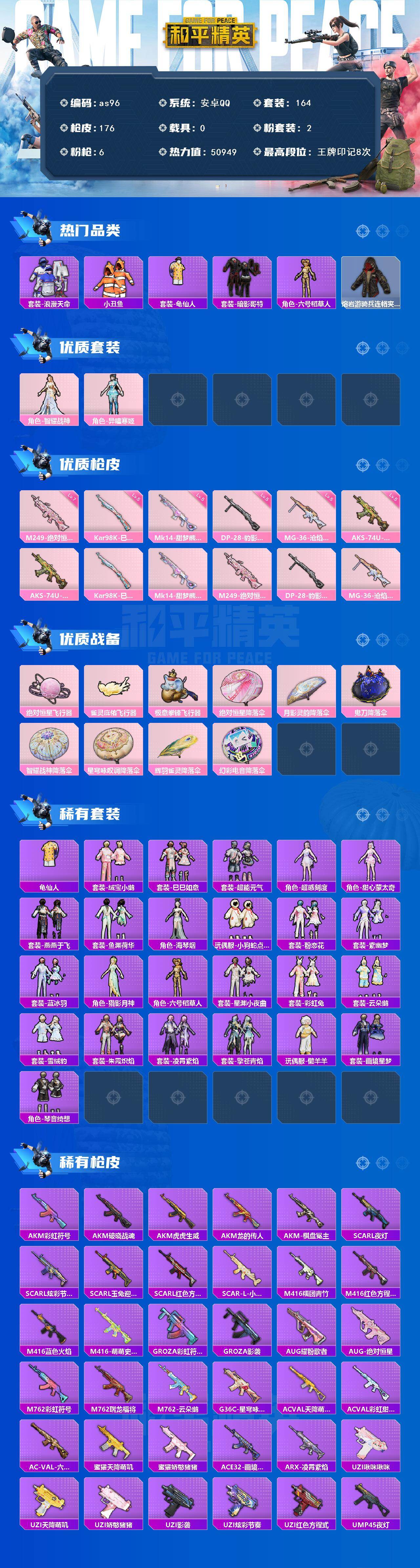 安卓 手q-2粉装-6特效呛-0载具-4粉色飞行器-50949热力值-8王牌印记-164套装-176呛皮 【热门品类】:套装-浪漫天命,套装-小丑鱼,套装-龟仙人,套装-暗影哥特,角色-六号稻草人,熔岩游骑兵连帽夹克 【粉色套装】:角色-智耀战神,角色-异瞳寒姬 【粉色呛皮等级】:aks-74u-森